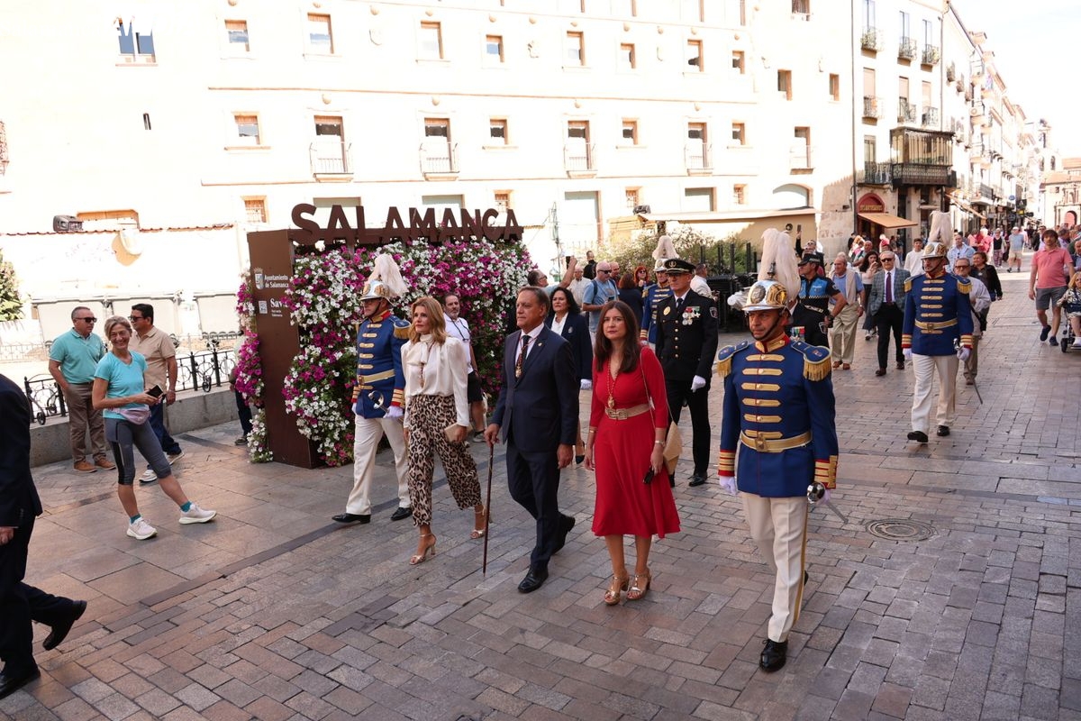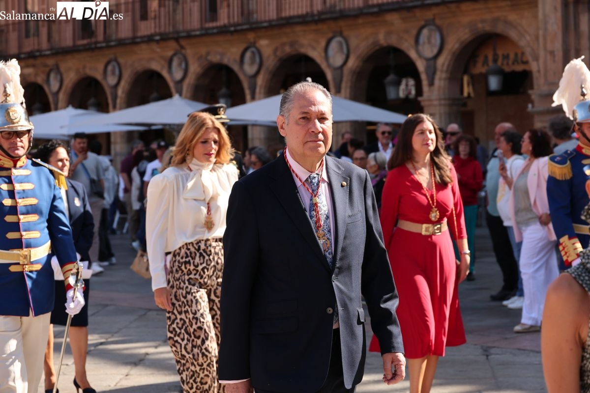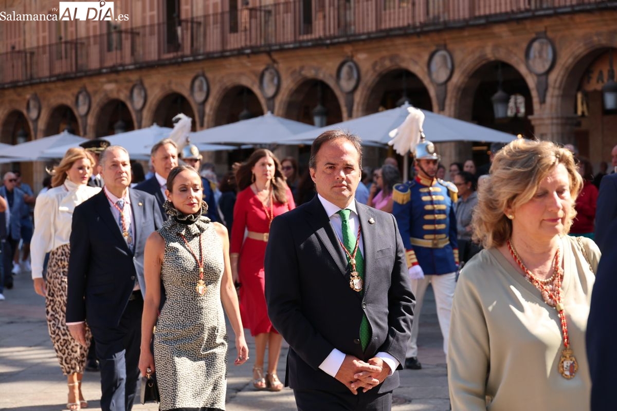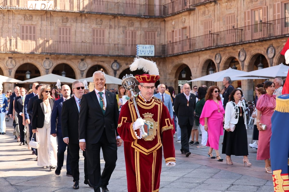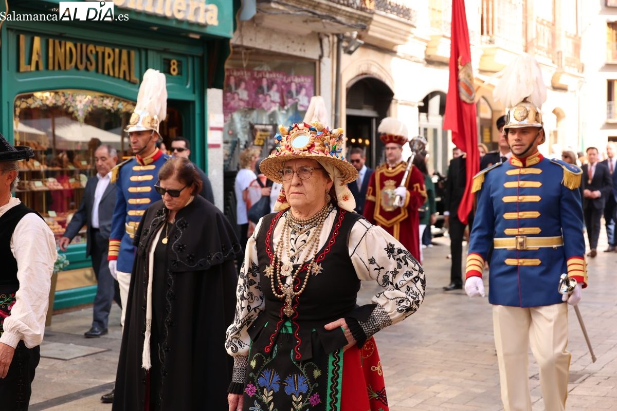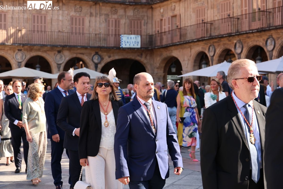 El desfile ha recorrido las calles del centro de la ciudad, ofreciendo una imagen de solemnidad y tradición. Los ediles del consistorio salmantino lucieron para la ocasión elegantes trajes, portando visiblemente las medallas que les acreditan como concejales de la ciudad.