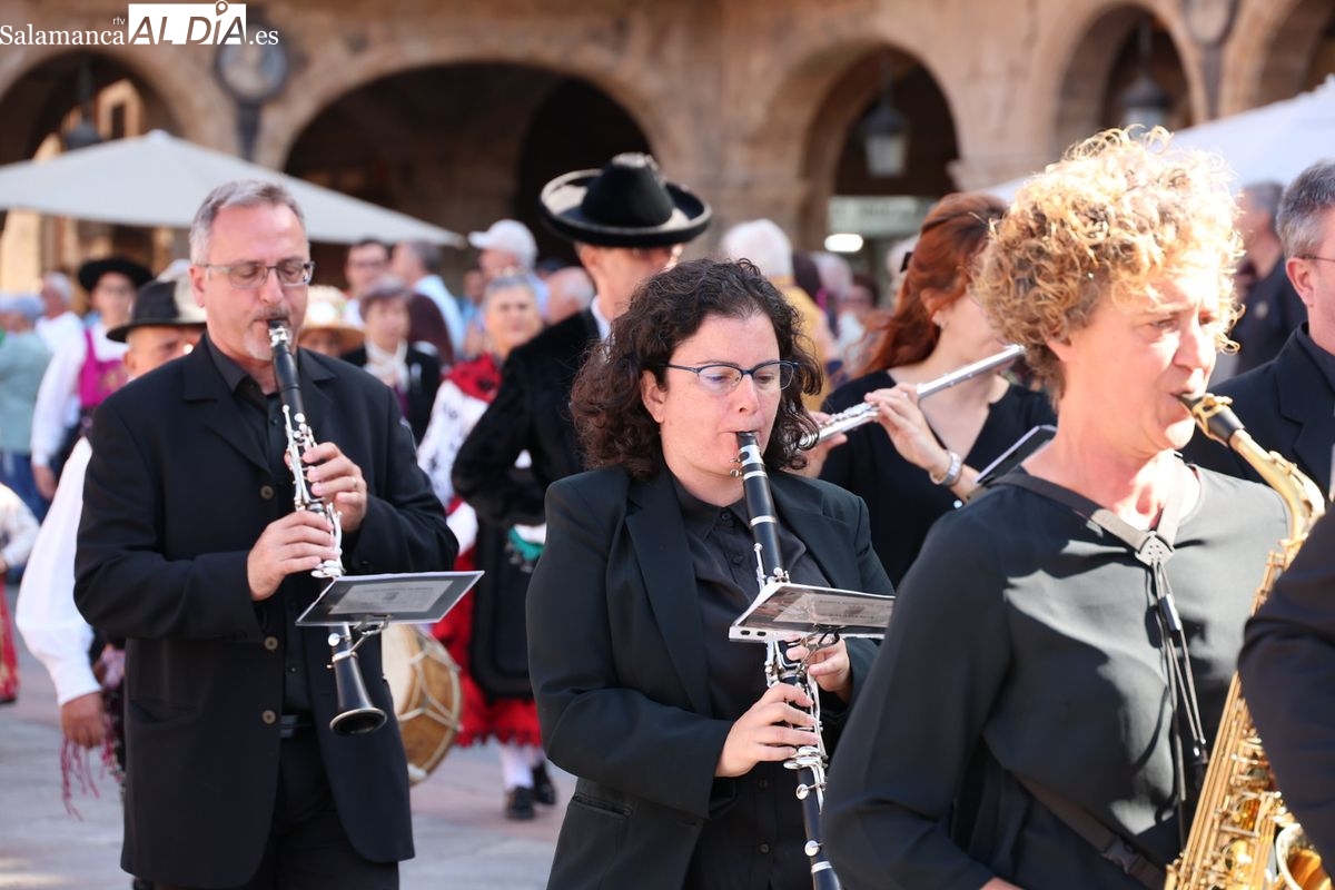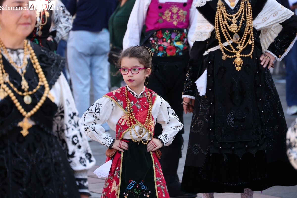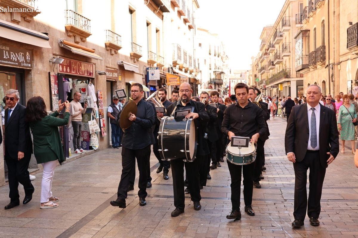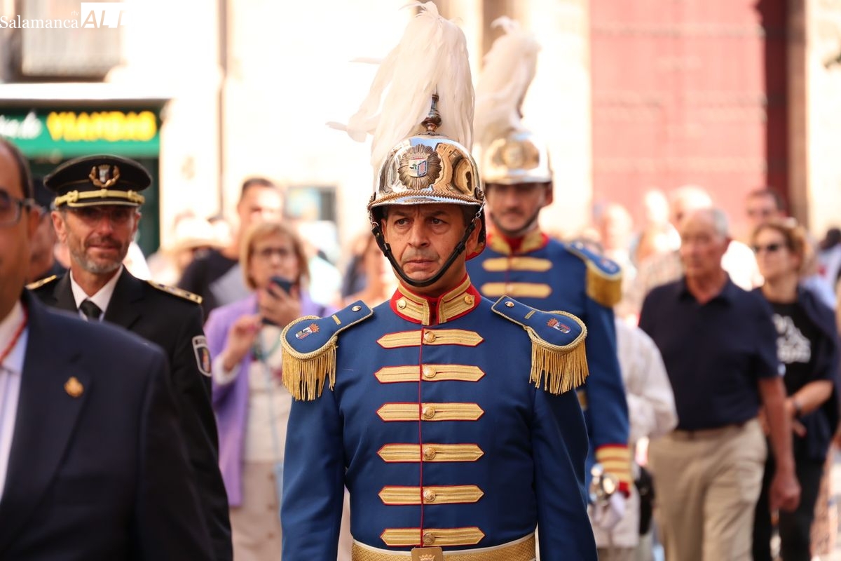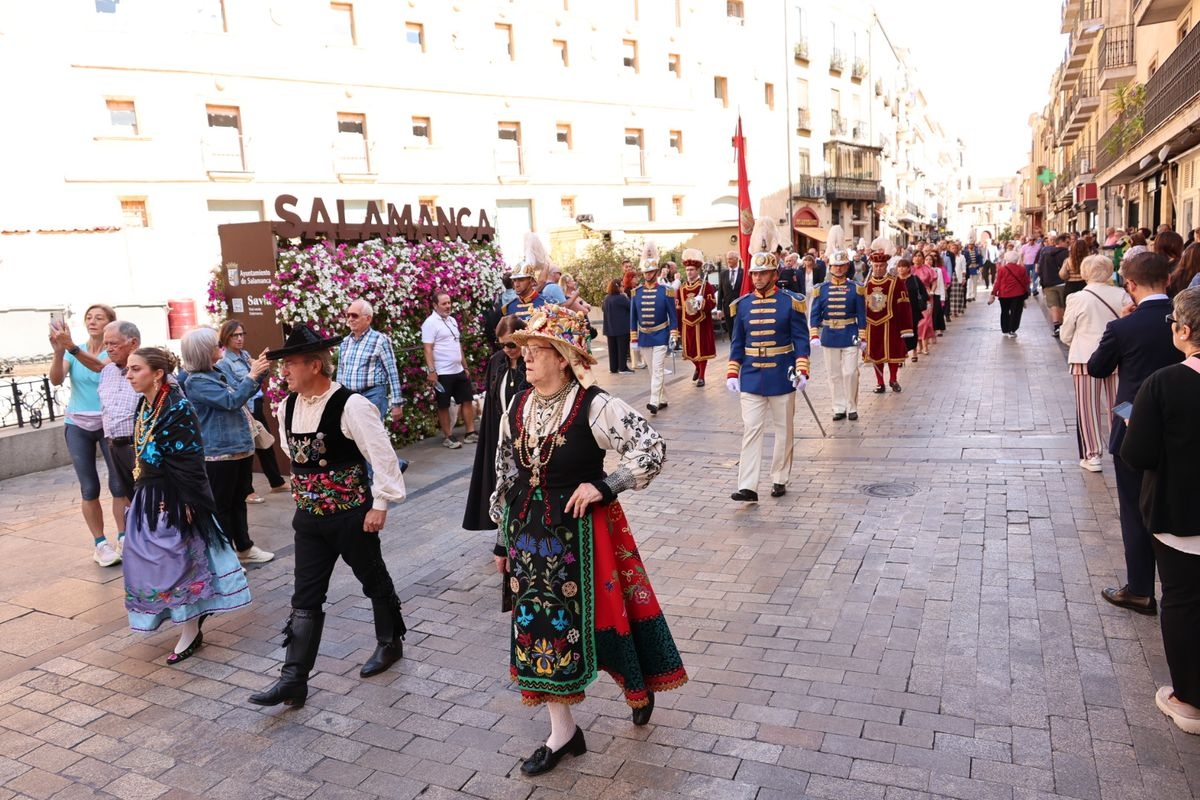 El acompañamiento ha estado formado por la Banda Municipal de Música, que puso la nota solemne al recorrido, varios grupos de charras y charros, que aportaron el color y la esencia del folclore salmantino con sus trajes típicos y la escolta de la Policía Local.