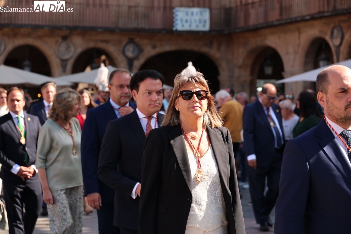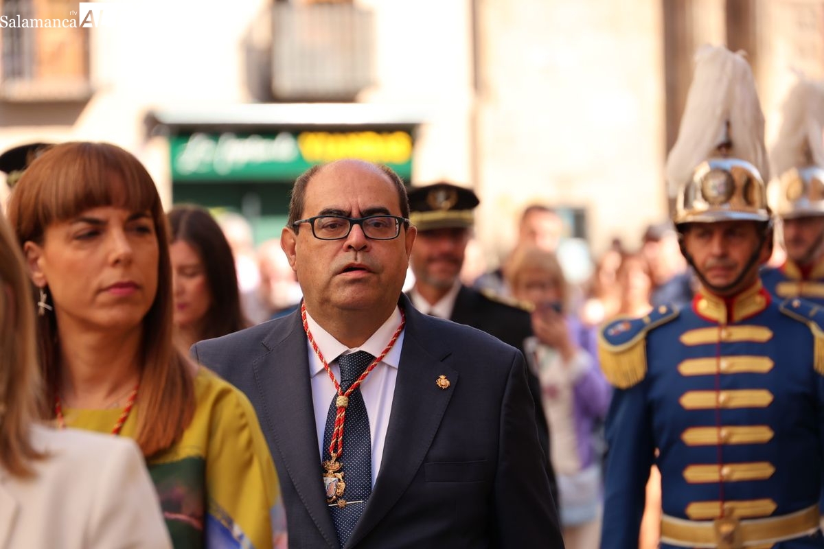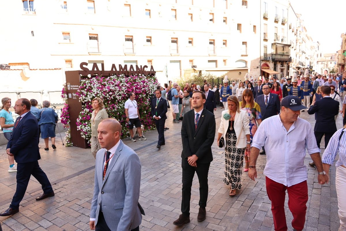 Salamanca ha renovado este lunes, 8 de septiembre, uno de sus ritos más solemnes y tradicionales con motivo de la festividad de su patrona, la Virgen de la Vega. Como marca la costumbre, el alcalde, Carlos García Carbayo, junto a los miembros de la Corporación Municipal, ha encabezado la comitiva oficial que ha partido desde el Ayuntamiento con destino a la Catedral Nueva para asistir a la misa en honor a la Virgen.