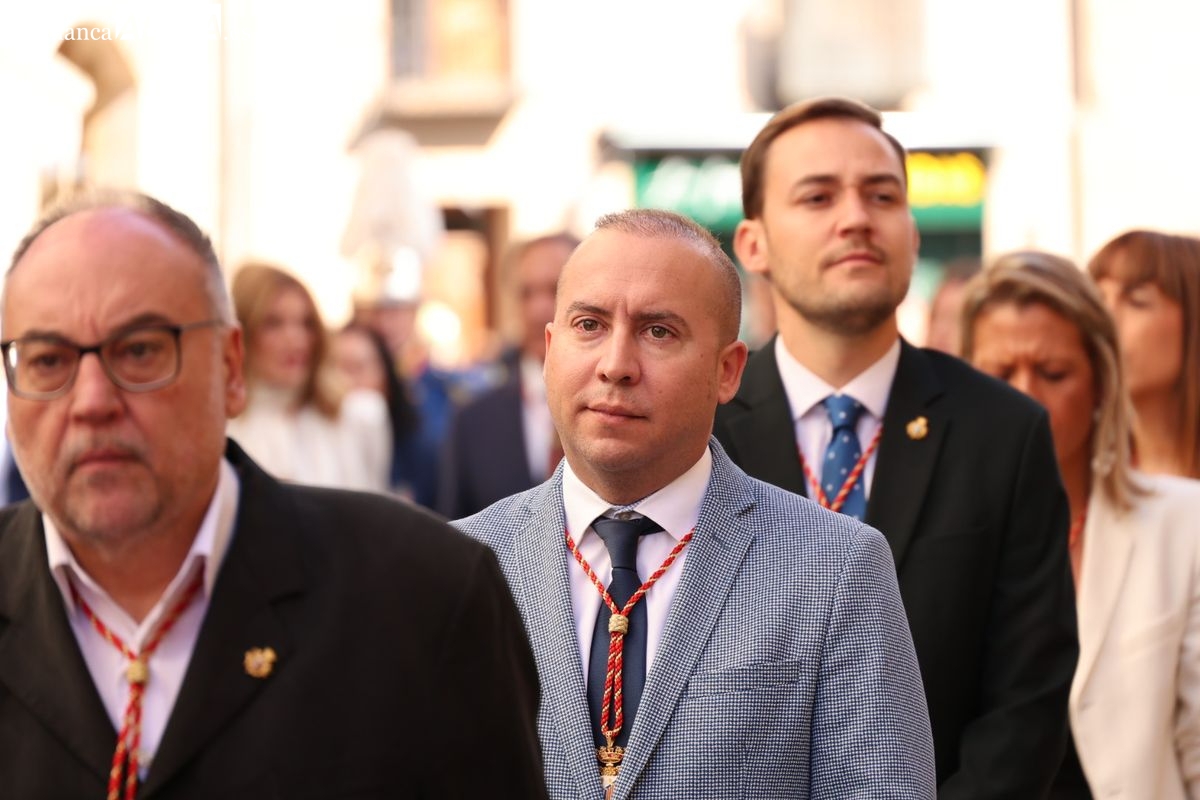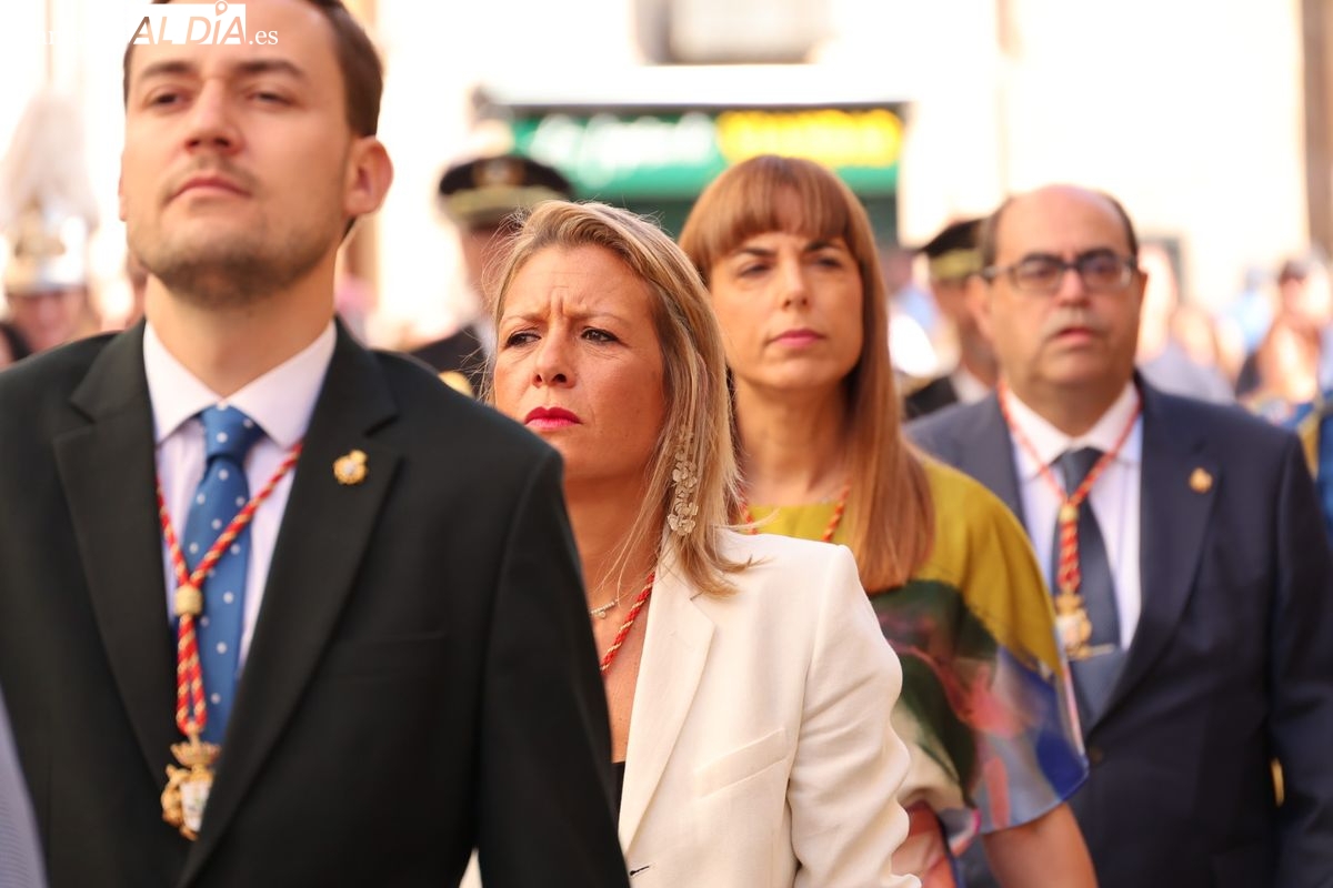 La comitiva ha desfilado desde el Ayuntamiento hasta la Catedral Nueva para asistir a la tradicional misa en honor a la patrona, arropada por la música, el folclore y la Policía de gala