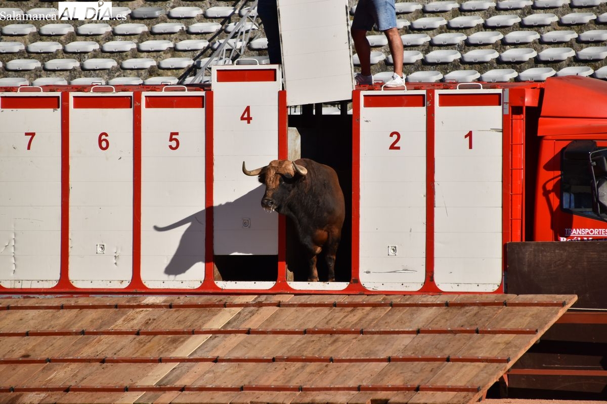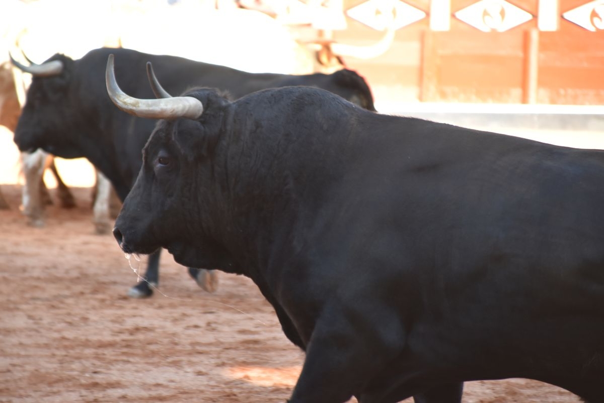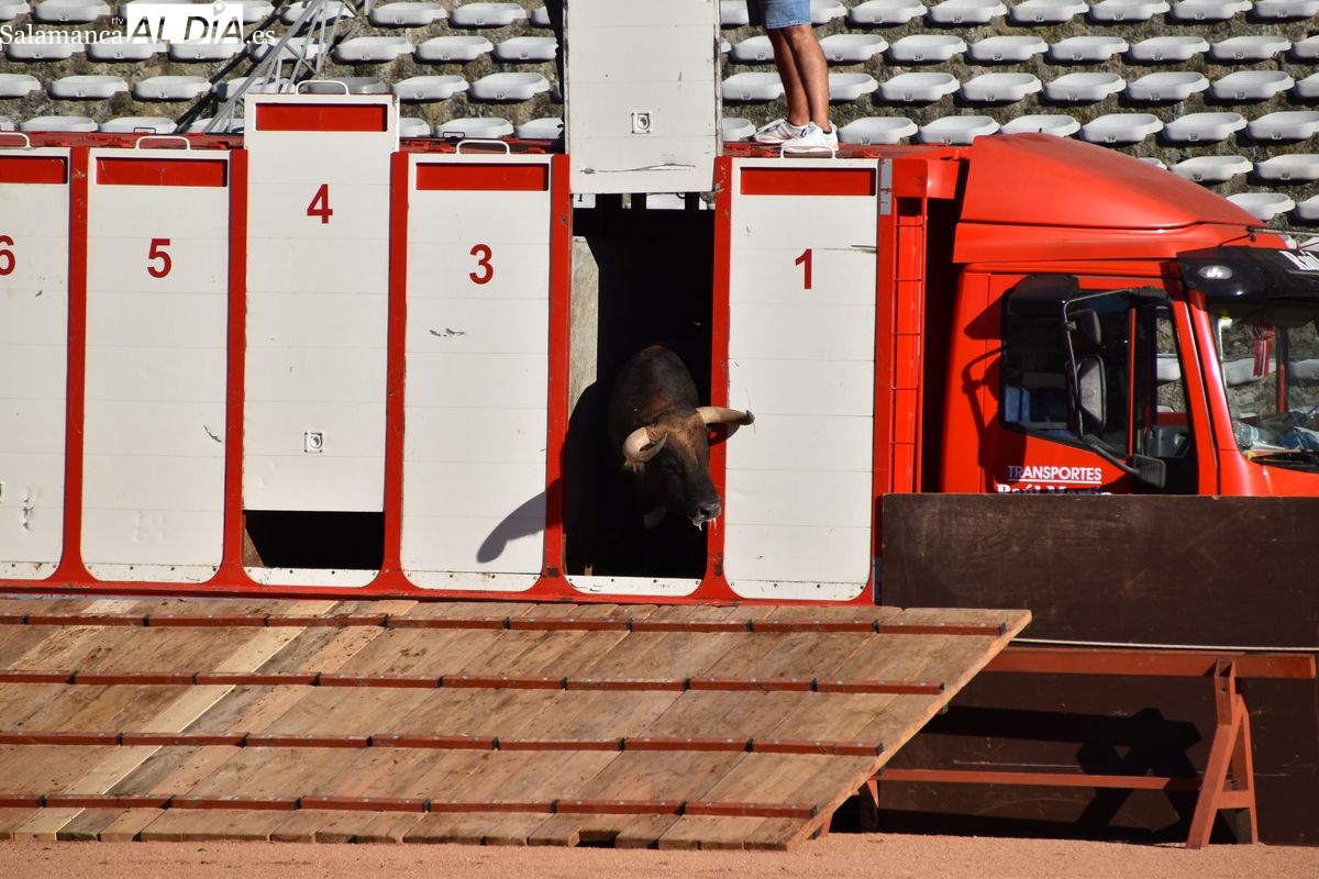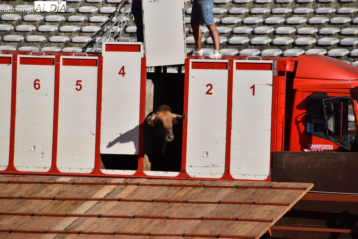 Pasadas las seis y cuarto de la tarde saltó al ruedo 'Almendrito', de García Jiménez, que hizo los honores de ser el primer astado en pisar el albero de La Glorieta en el desenjaule. Bien presentada la corrida que será lidiada el día 19 de septiembre por Morante de la Puebla, José María Manzanares y Marco Pérez. Cuatro toros negros y dos coloraos conforman el envío de García Jiménez, que fue aplaudido por su buena presencia. Muy parejos, musculados y con remate los astados de la divisa azul y rosa.