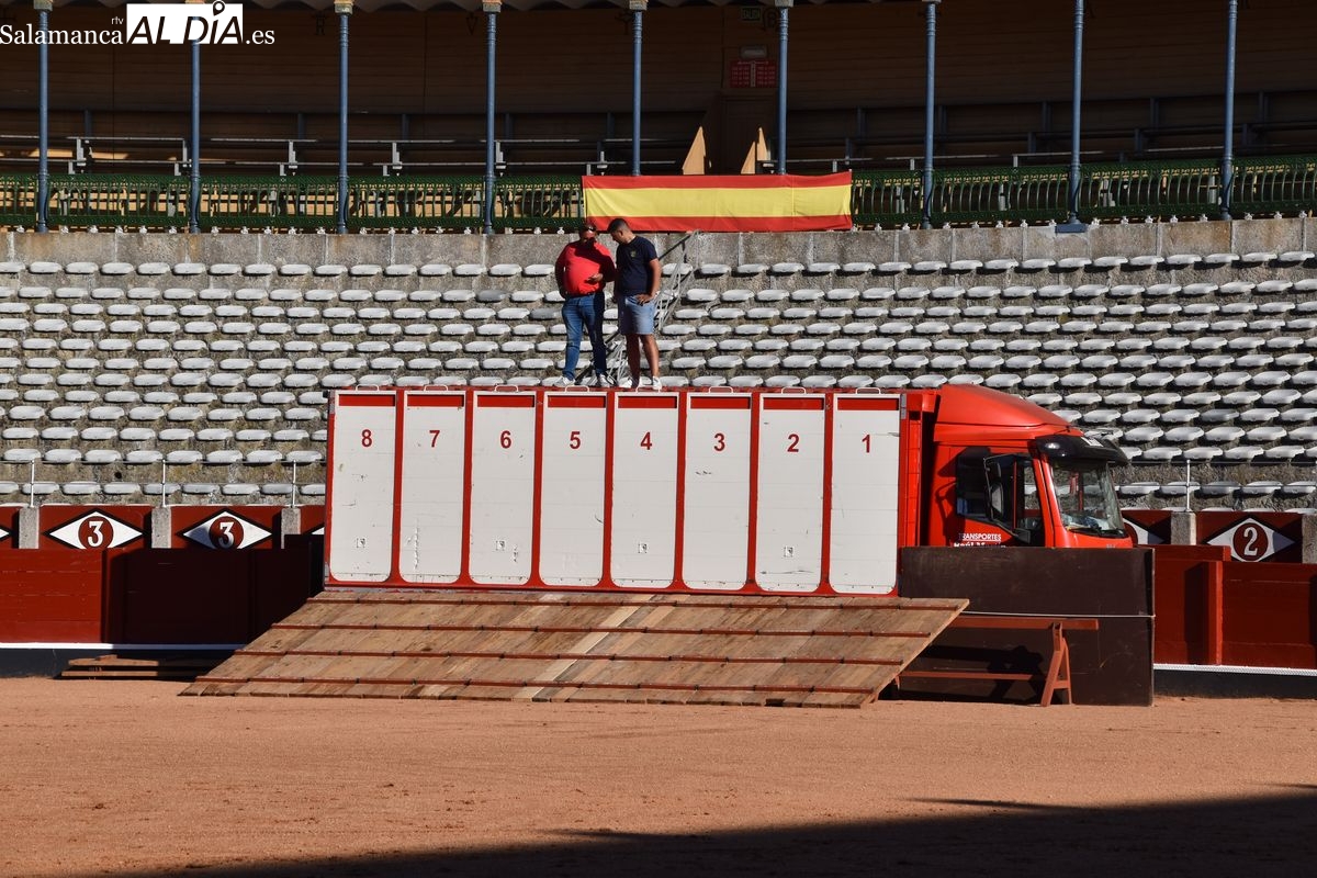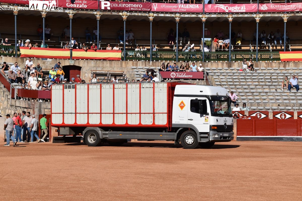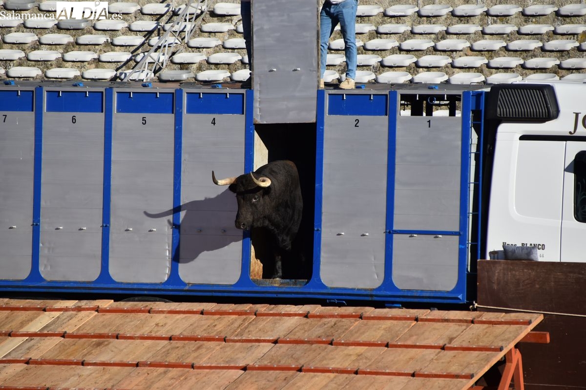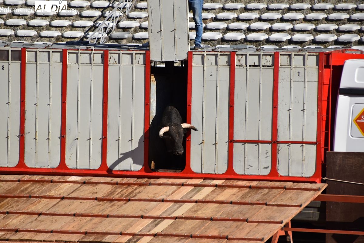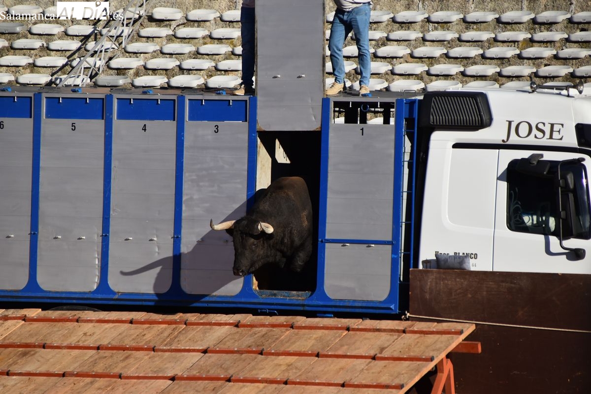 Pasadas las seis y cuarto de la tarde saltó al ruedo 'Almendrito', de García Jiménez, que hizo los honores de ser el primer astado en pisar el albero de La Glorieta en el desenjaule. Bien presentada la corrida que será lidiada el día 19 de septiembre por Morante de la Puebla, José María Manzanares y Marco Pérez. Cuatro toros negros y dos coloraos conforman el envío de García Jiménez, que fue aplaudido por su buena presencia. Muy parejos, musculados y con remate los astados de la divisa azul y rosa.