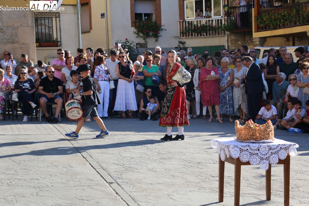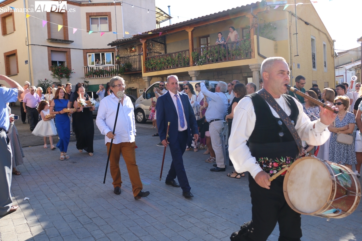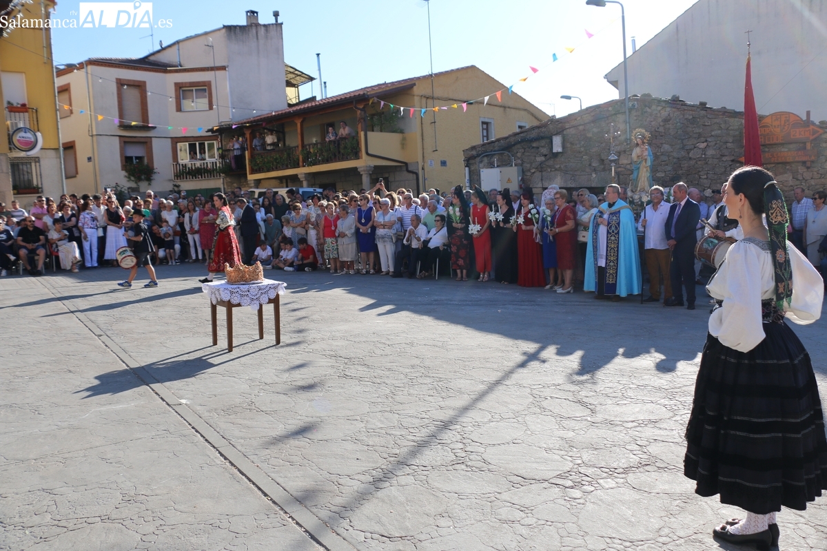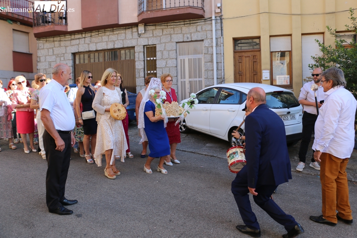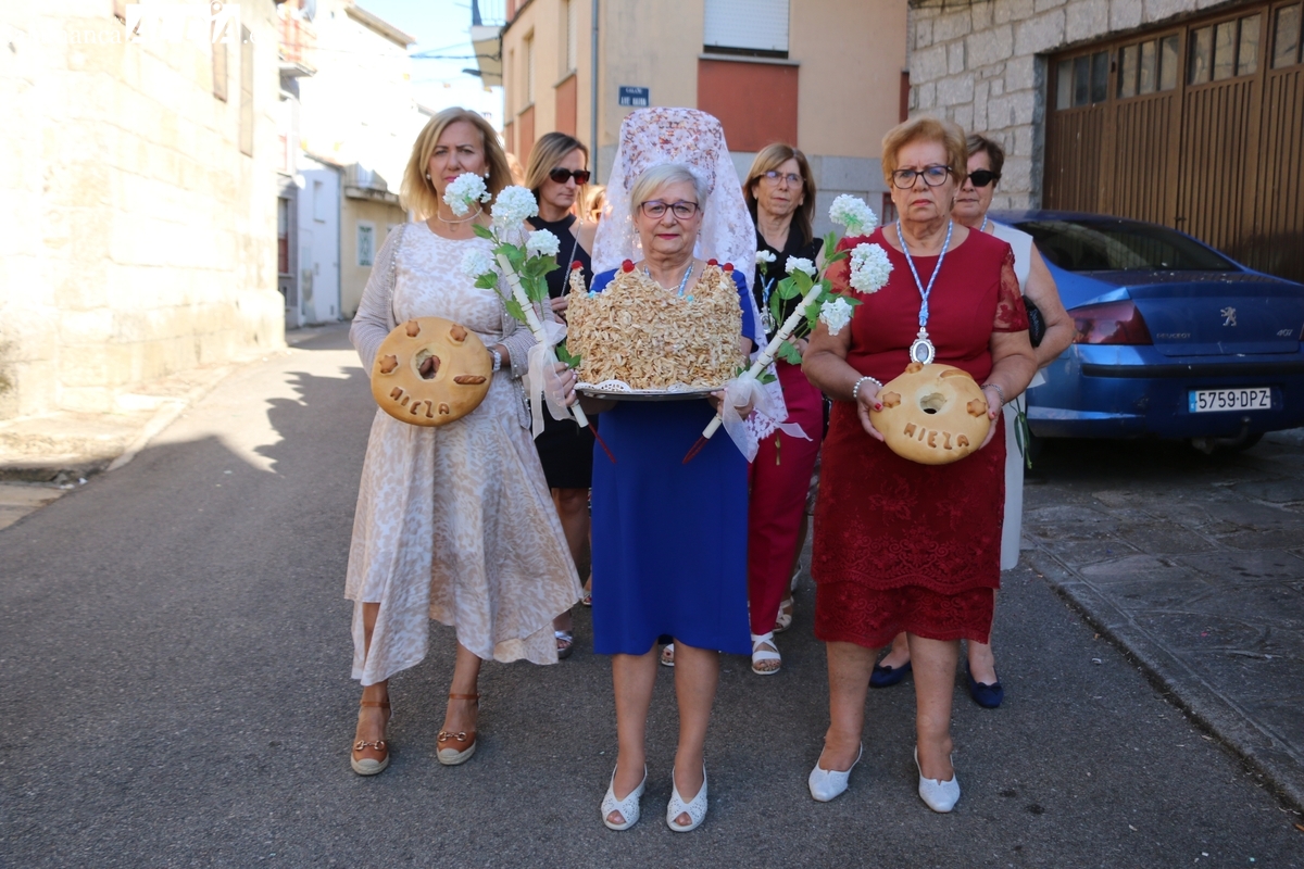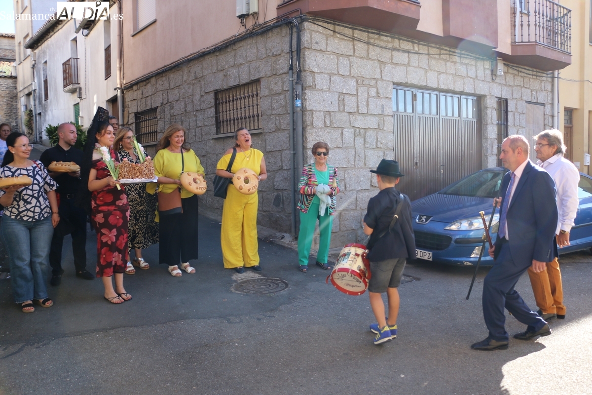 Bajo el pasacalles interpretado por el joven tamborilero de 10 años, Mateo Vicente, acompañado de su padre Jesús Vicente, el alcalde de la localidad, Ismael García Carreto, y luciendo el bastón municipal, acompañaba al mayordomo de este año, Luis Alberto Holgado Lopo, para recibir a cada una de las madrinas en calles diferentes que confluyen en el ágora miezuca. Con el saludo a modo de reverencia comenzaba el pasacalles de regreso a la plaza, para concluir con la ofrenda de sus roscas a la patrona, acto oficiado por el párroco Miguel Ángel García Miguel y en el que cada madrina se hacía acompañar de sus familiares.