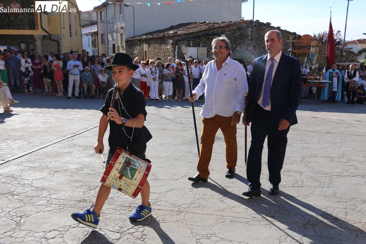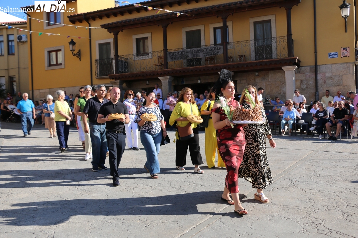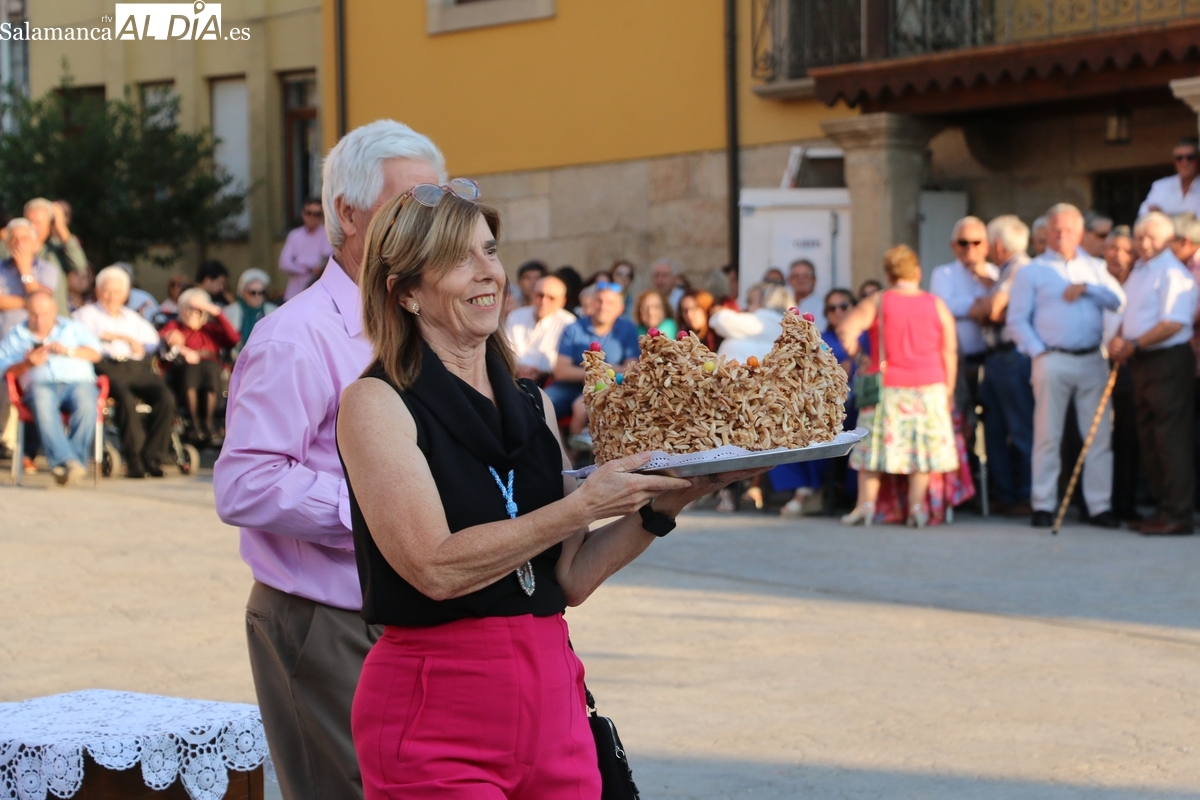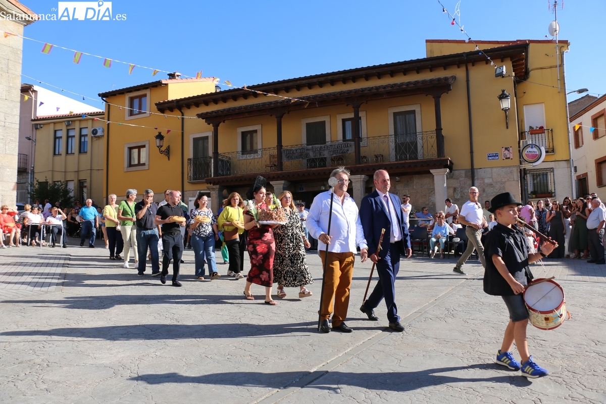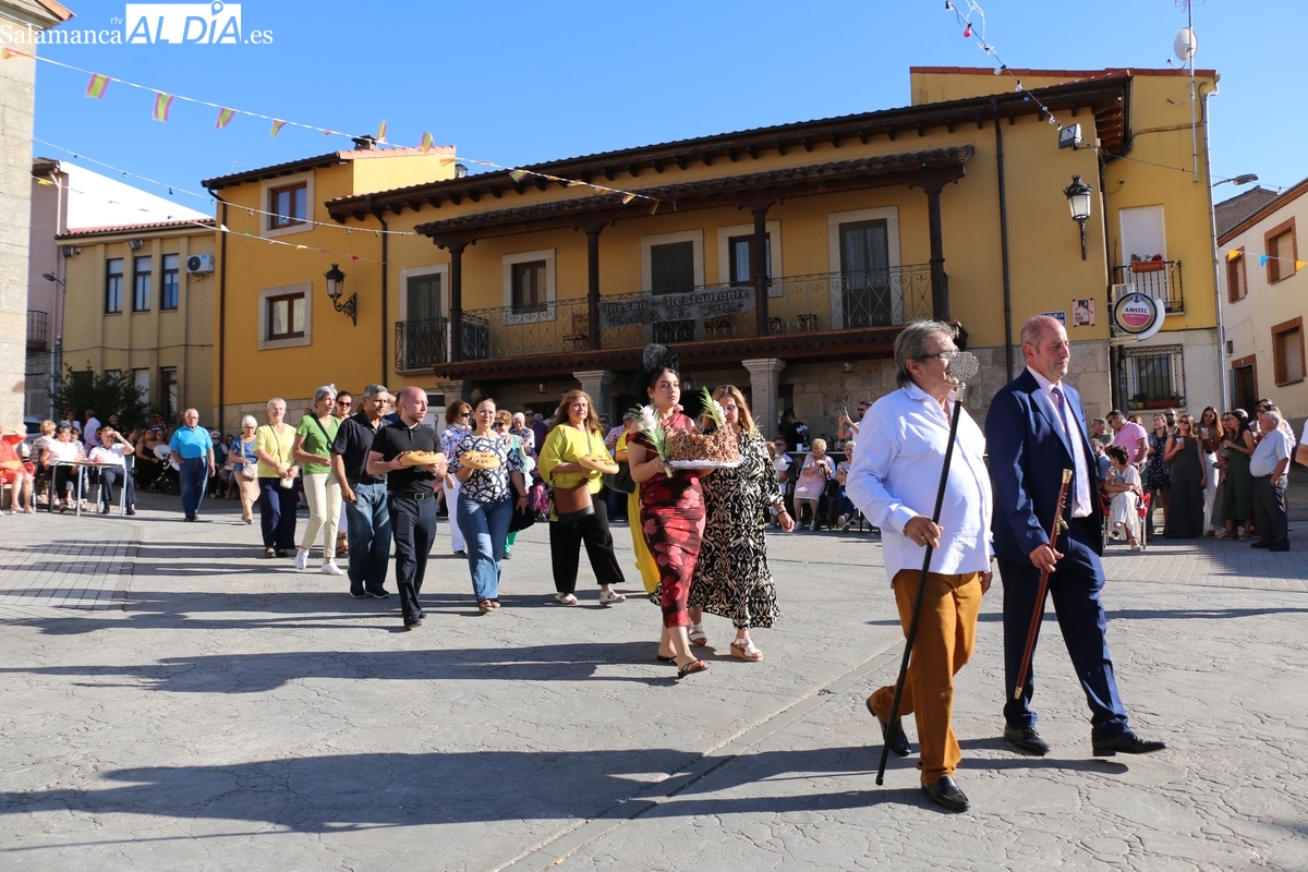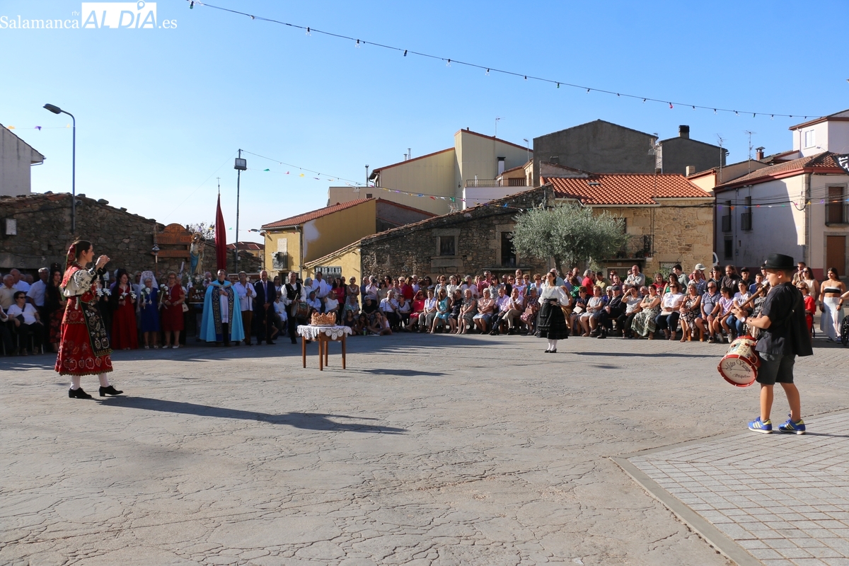 Bajo el pasacalles interpretado por el joven tamborilero de 10 años, Mateo Vicente, acompañado de su padre Jesús Vicente, el alcalde de la localidad, Ismael García Carreto, y luciendo el bastón municipal, acompañaba al mayordomo de este año, Luis Alberto Holgado Lopo, para recibir a cada una de las madrinas en calles diferentes que confluyen en el ágora miezuca. Con el saludo a modo de reverencia comenzaba el pasacalles de regreso a la plaza, para concluir con la ofrenda de sus roscas a la patrona, acto oficiado por el párroco Miguel Ángel García Miguel y en el que cada madrina se hacía acompañar de sus familiares.