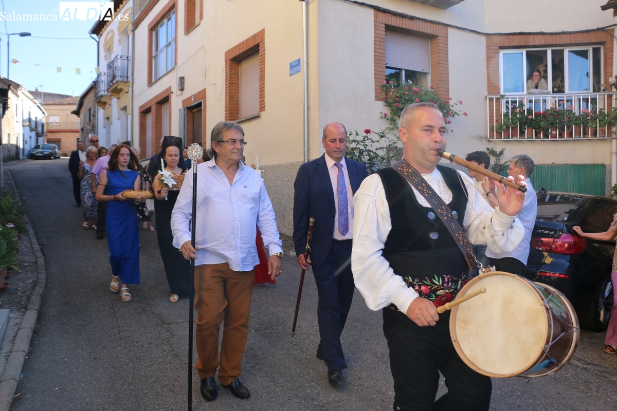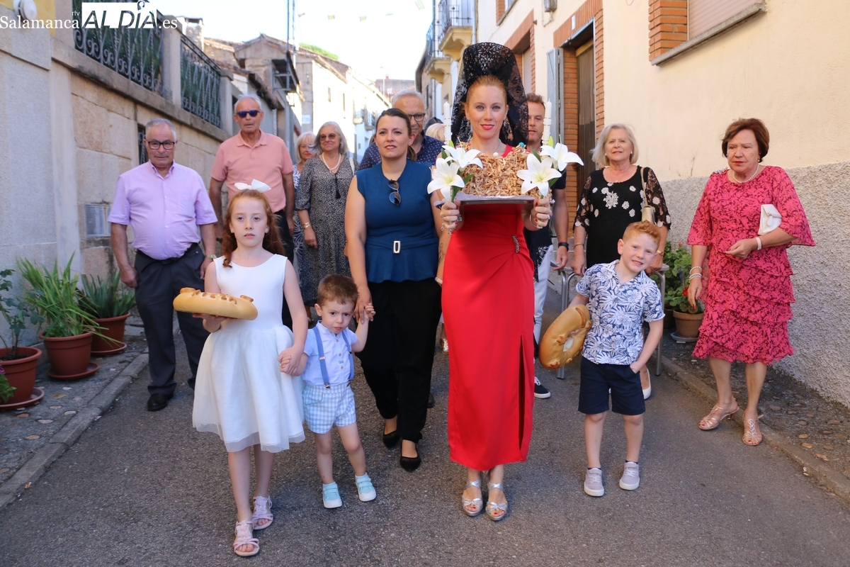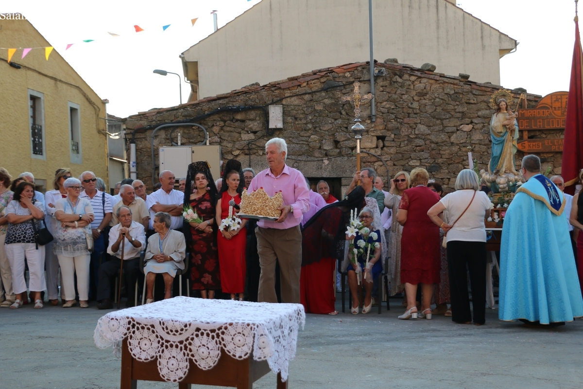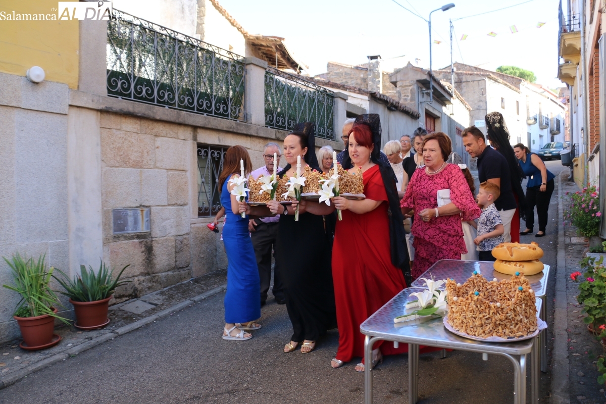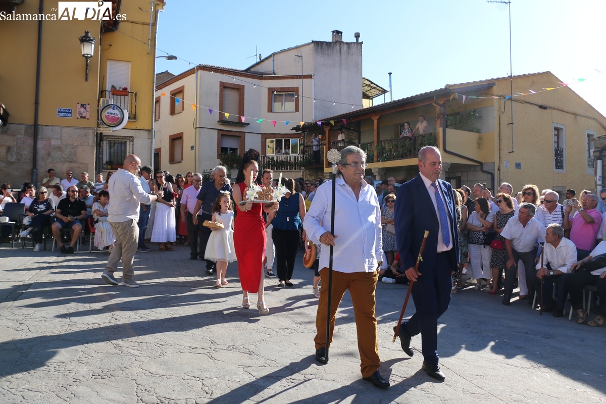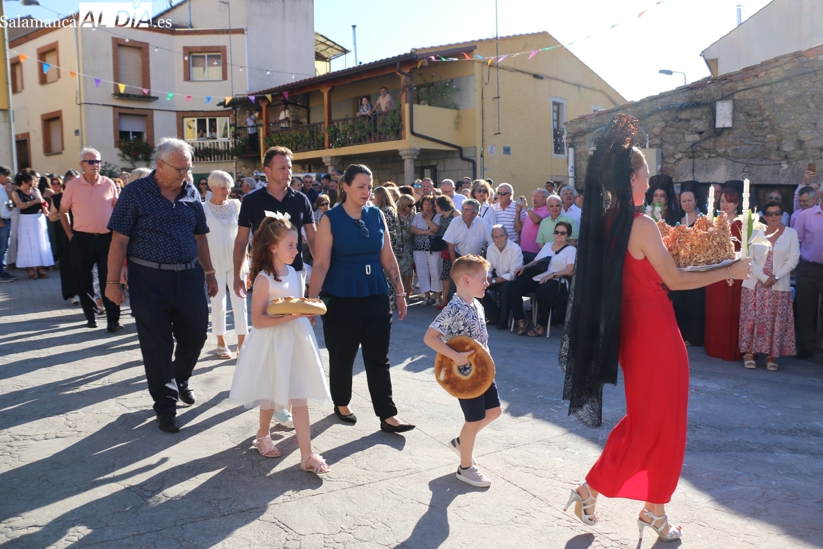 Bajo el pasacalles interpretado por el joven tamborilero de 10 años, Mateo Vicente, acompañado de su padre Jesús Vicente, el alcalde de la localidad, Ismael García Carreto, y luciendo el bastón municipal, acompañaba al mayordomo de este año, Luis Alberto Holgado Lopo, para recibir a cada una de las madrinas en calles diferentes que confluyen en el ágora miezuca. Con el saludo a modo de reverencia comenzaba el pasacalles de regreso a la plaza, para concluir con la ofrenda de sus roscas a la patrona, acto oficiado por el párroco Miguel Ángel García Miguel y en el que cada madrina se hacía acompañar de sus familiares.