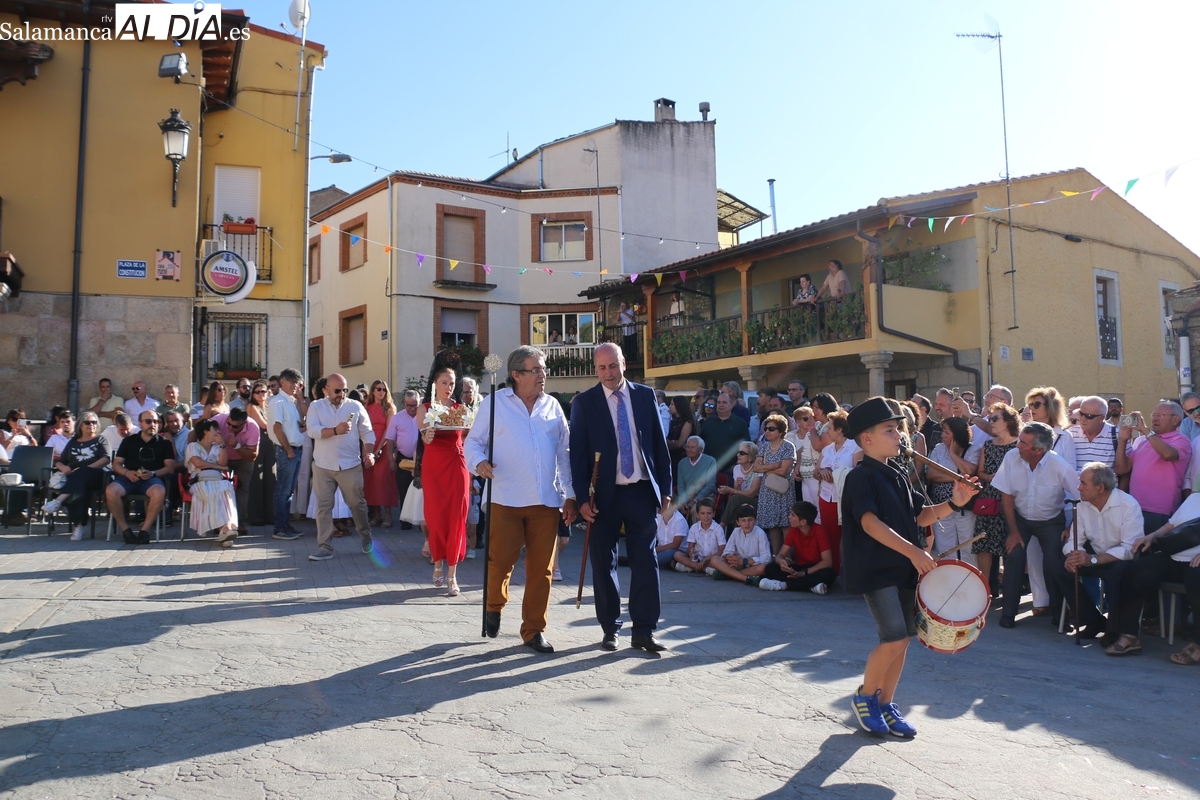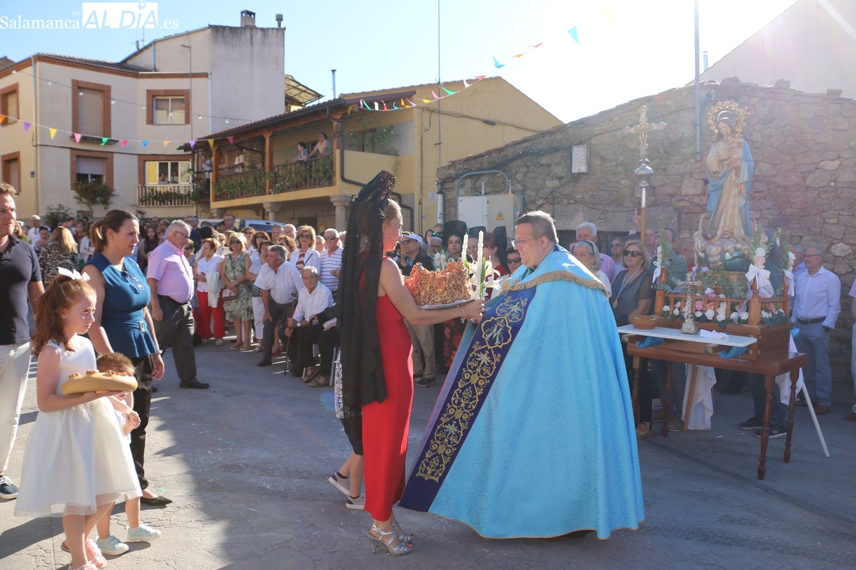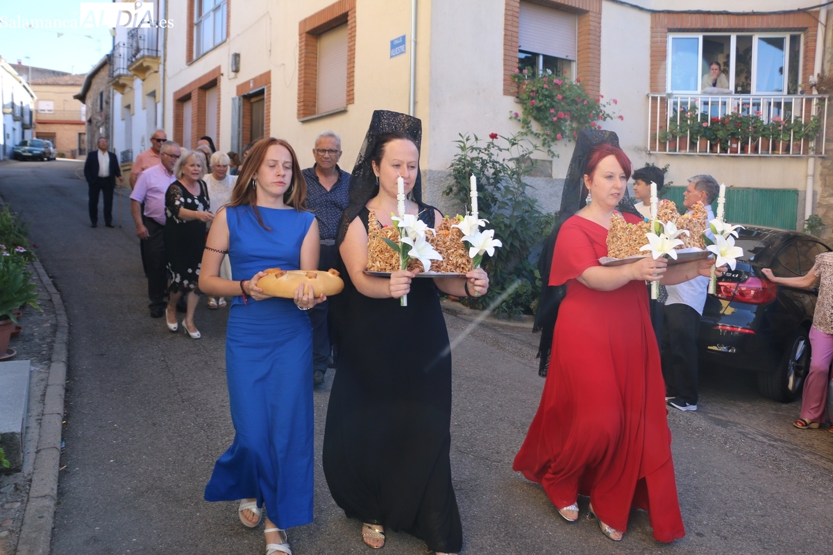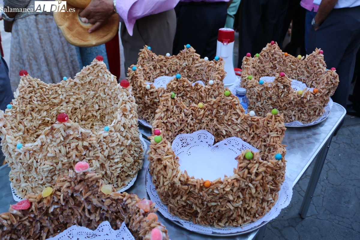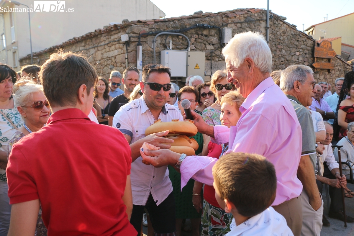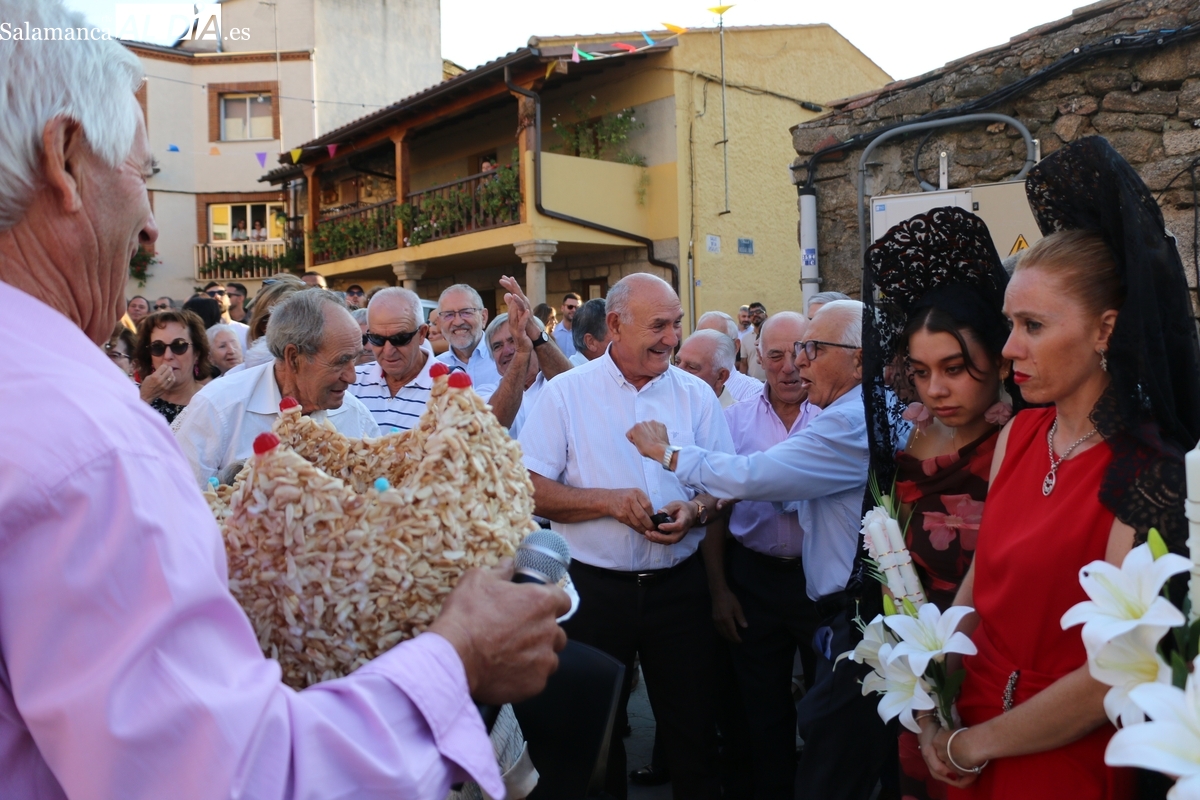 Bajo el pasacalles interpretado por el joven tamborilero de 10 años, Mateo Vicente, acompañado de su padre Jesús Vicente, el alcalde de la localidad, Ismael García Carreto, y luciendo el bastón municipal, acompañaba al mayordomo de este año, Luis Alberto Holgado Lopo, para recibir a cada una de las madrinas en calles diferentes que confluyen en el ágora miezuca. Con el saludo a modo de reverencia comenzaba el pasacalles de regreso a la plaza, para concluir con la ofrenda de sus roscas a la patrona, acto oficiado por el párroco Miguel Ángel García Miguel y en el que cada madrina se hacía acompañar de sus familiares.