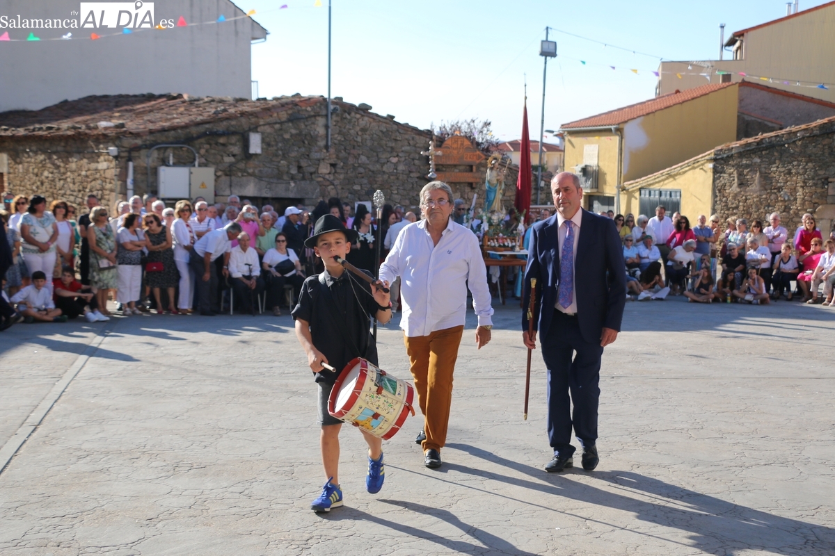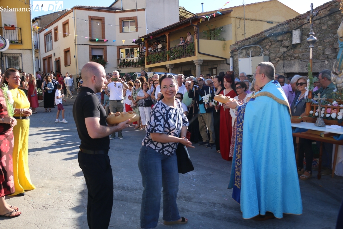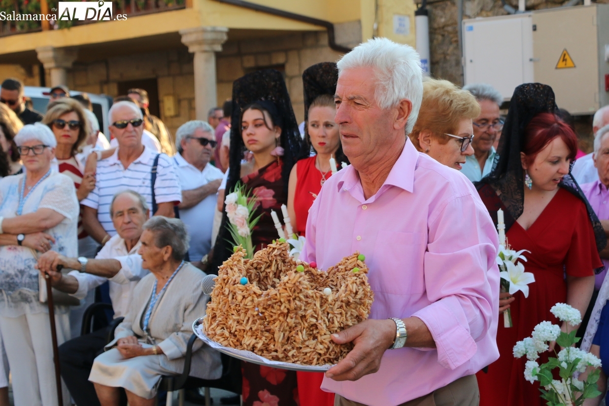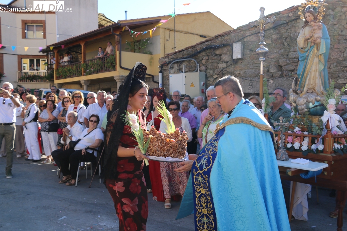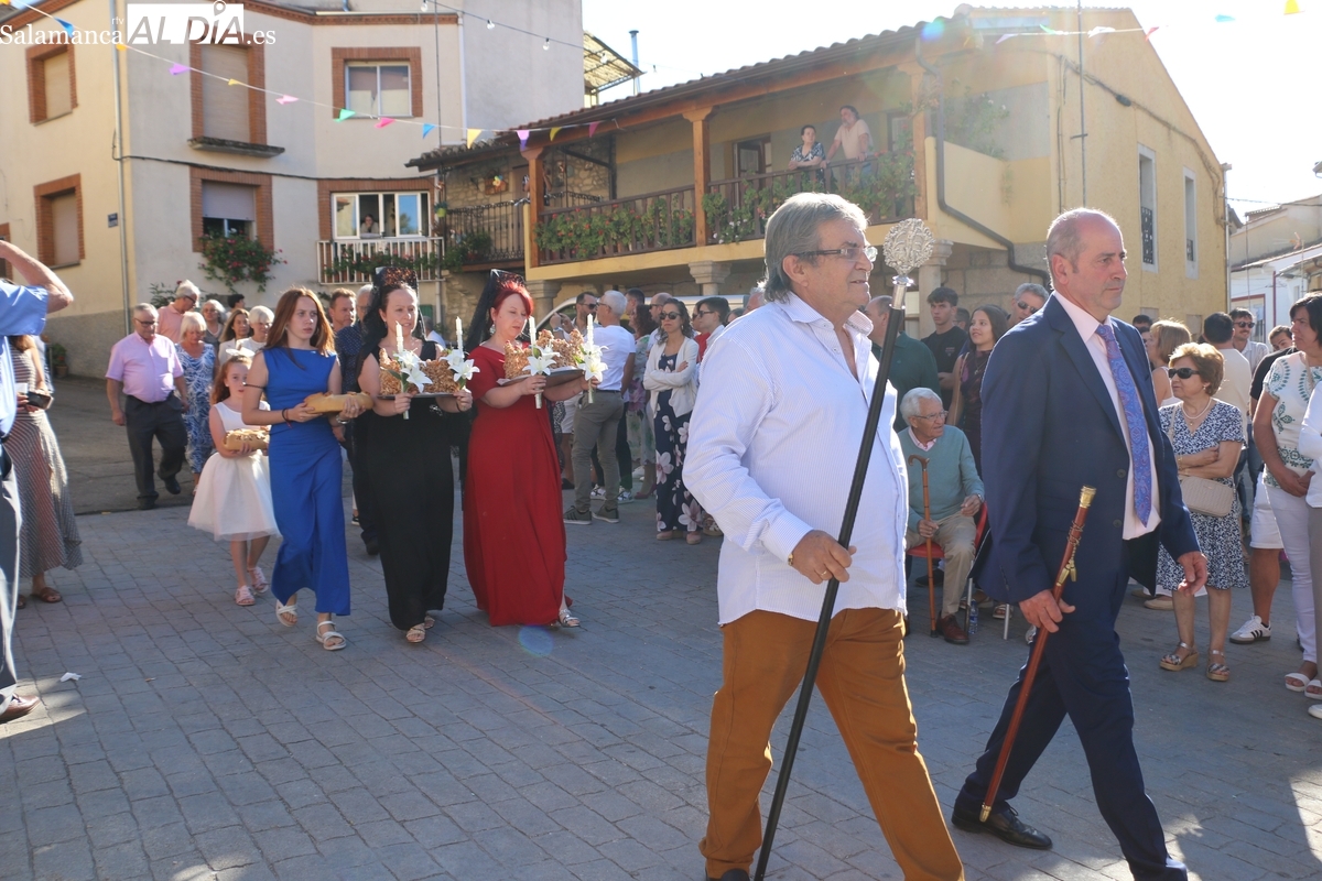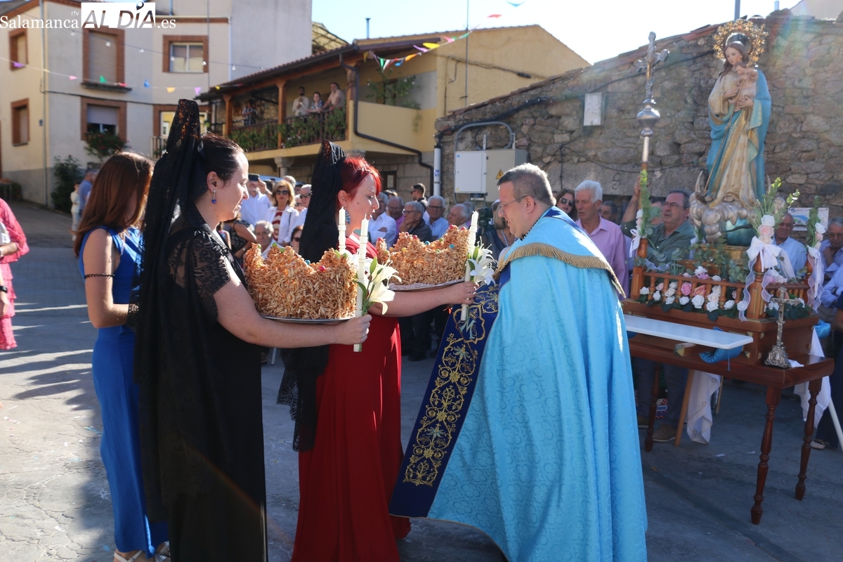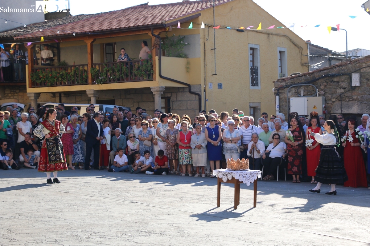 Bajo el pasacalles interpretado por el joven tamborilero de 10 años, Mateo Vicente, acompañado de su padre Jesús Vicente, el alcalde de la localidad, Ismael García Carreto, y luciendo el bastón municipal, acompañaba al mayordomo de este año, Luis Alberto Holgado Lopo, para recibir a cada una de las madrinas en calles diferentes que confluyen en el ágora miezuca. Con el saludo a modo de reverencia comenzaba el pasacalles de regreso a la plaza, para concluir con la ofrenda de sus roscas a la patrona, acto oficiado por el párroco Miguel Ángel García Miguel y en el que cada madrina se hacía acompañar de sus familiares.