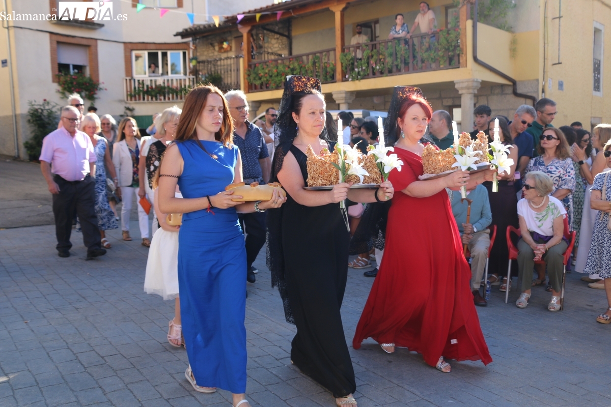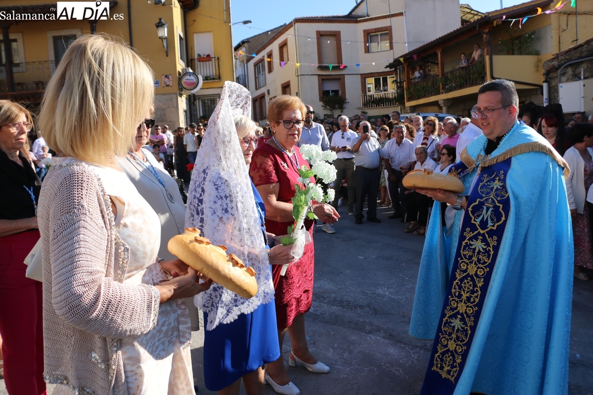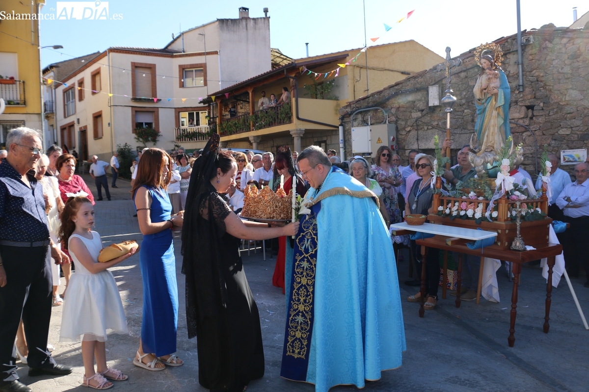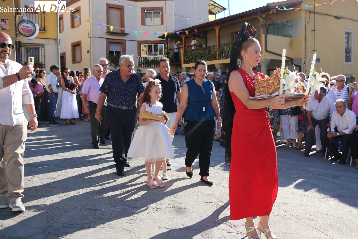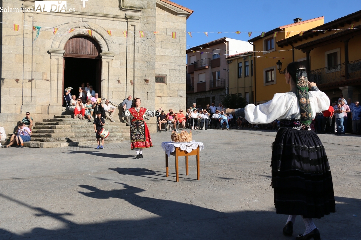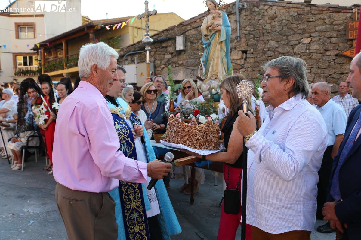 Bajo el pasacalles interpretado por el joven tamborilero de 10 años, Mateo Vicente, acompañado de su padre Jesús Vicente, el alcalde de la localidad, Ismael García Carreto, y luciendo el bastón municipal, acompañaba al mayordomo de este año, Luis Alberto Holgado Lopo, para recibir a cada una de las madrinas en calles diferentes que confluyen en el ágora miezuca. Con el saludo a modo de reverencia comenzaba el pasacalles de regreso a la plaza, para concluir con la ofrenda de sus roscas a la patrona, acto oficiado por el párroco Miguel Ángel García Miguel y en el que cada madrina se hacía acompañar de sus familiares.
