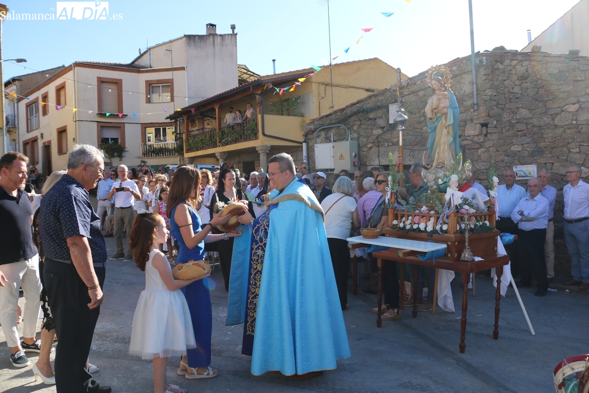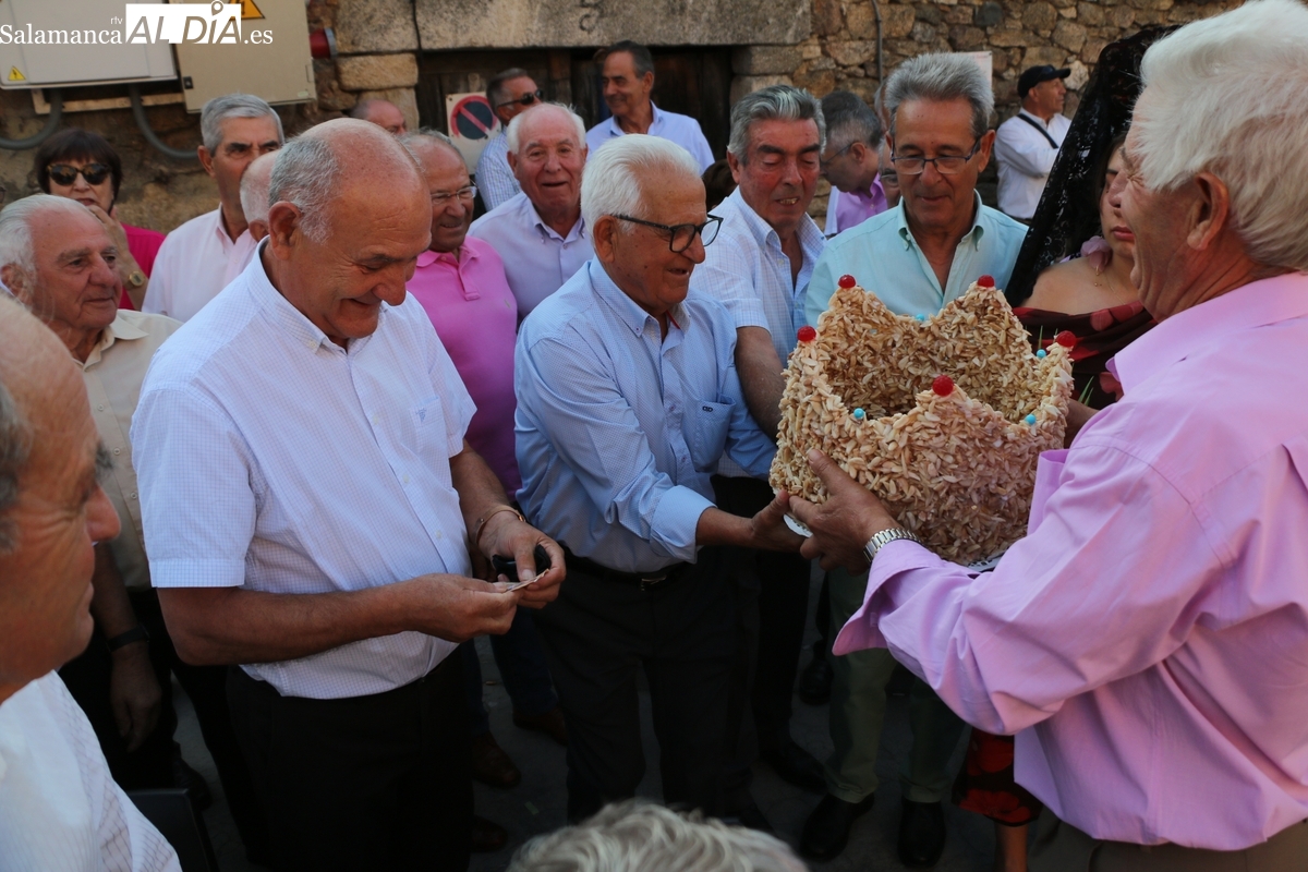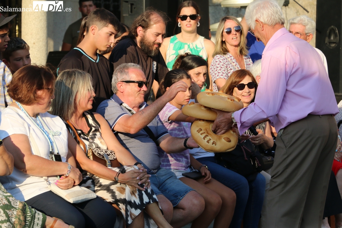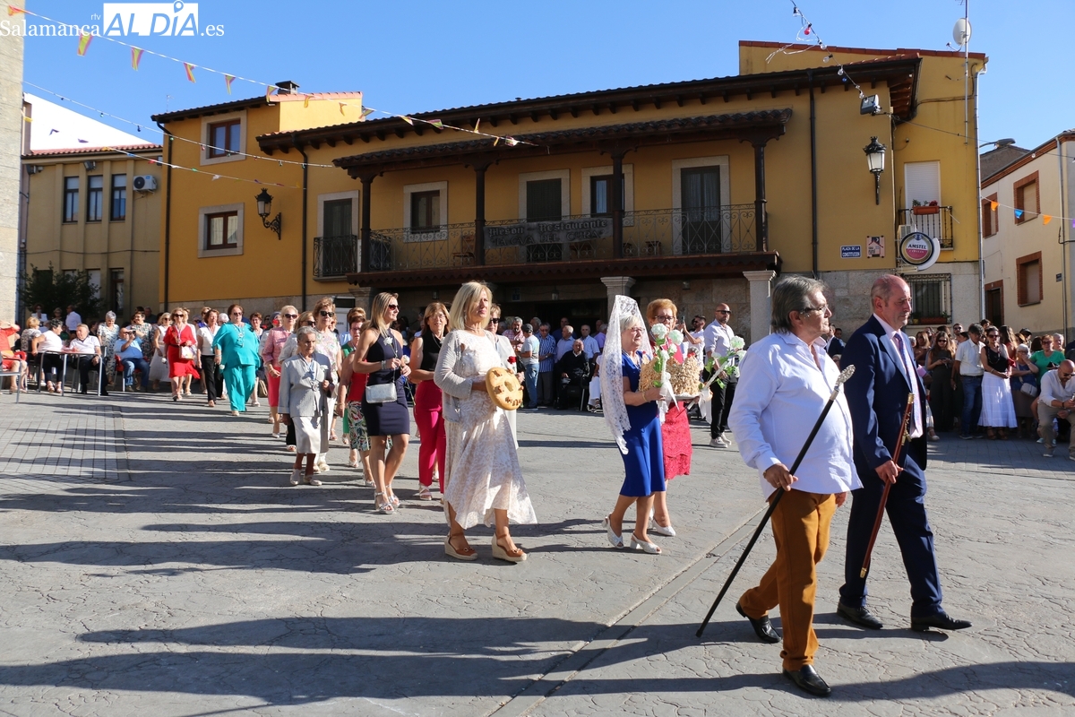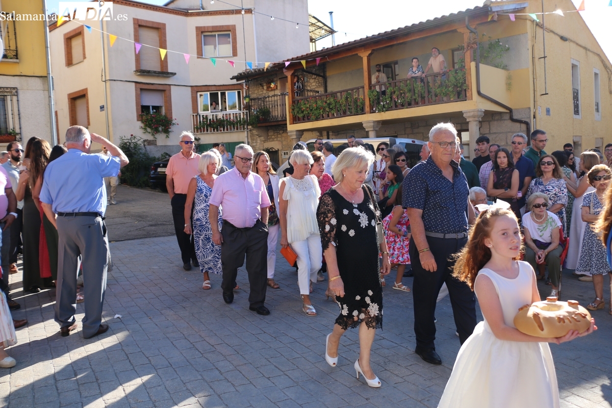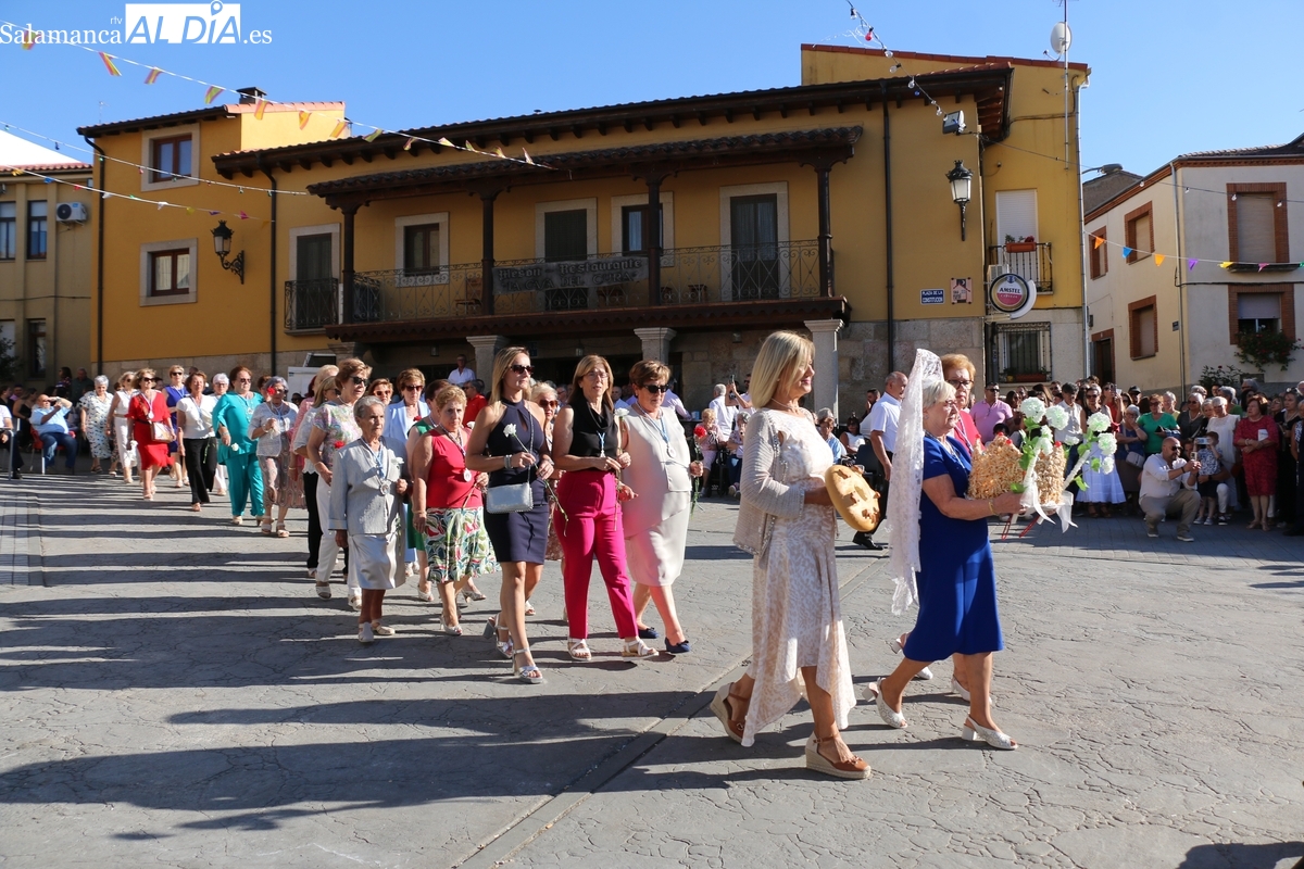 Bajo el pasacalles interpretado por el joven tamborilero de 10 años, Mateo Vicente, acompañado de su padre Jesús Vicente, el alcalde de la localidad, Ismael García Carreto, y luciendo el bastón municipal, acompañaba al mayordomo de este año, Luis Alberto Holgado Lopo, para recibir a cada una de las madrinas en calles diferentes que confluyen en el ágora miezuca. Con el saludo a modo de reverencia comenzaba el pasacalles de regreso a la plaza, para concluir con la ofrenda de sus roscas a la patrona, acto oficiado por el párroco Miguel Ángel García Miguel y en el que cada madrina se hacía acompañar de sus familiares.