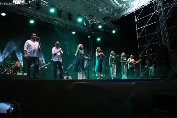 Hacia el final de su actuación, las primeras notas de la Salve Rociera comenzaron a sonar, y lo que siguió fue un instante de pura emoción. Las voces de los integrantes del grupo sevillano se fundieron con las de un público completamente entregado. De forma espontánea y unánime, toda la Plaza Mayor se convirtió en un impresionante coro al aire libre, acompañando cada estrofa del conocido tema.