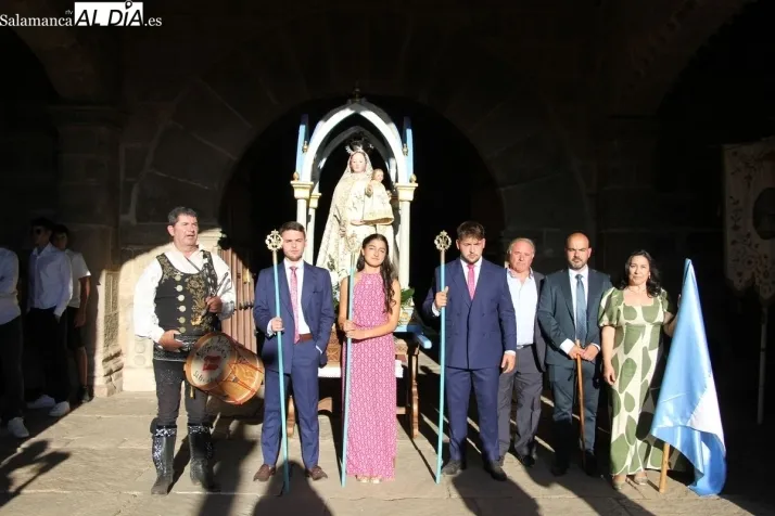 Los hermanos Miguel y Alejandro Ramos Ruano, junto a su prima, Julia García Ruano, presidieron los actos en honor a la patrona empuñando las varas de la Mayordomía en el homenaje que finalizaba con la subasta de la bandera amenizada por El Mariquelo y su grupo de charros