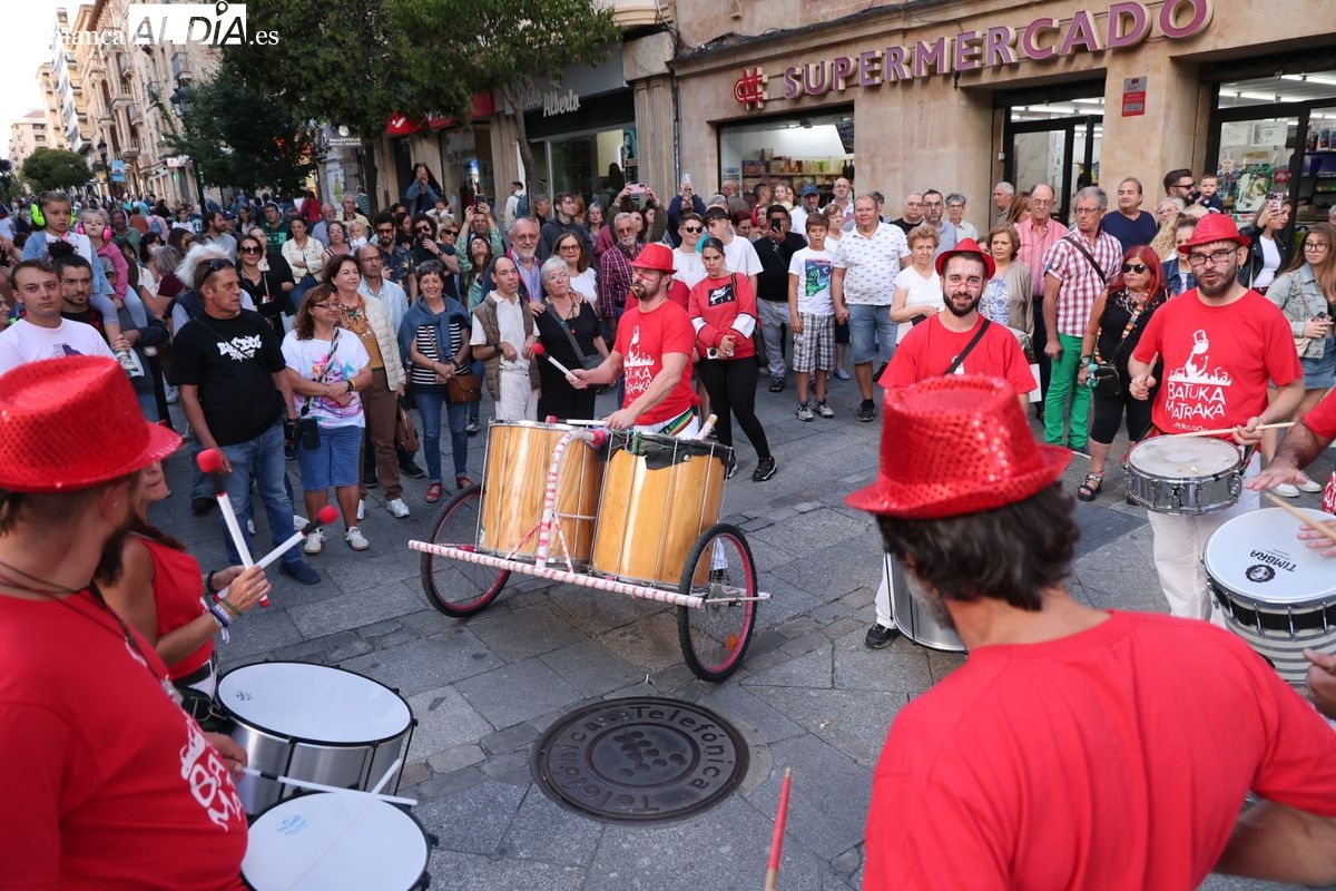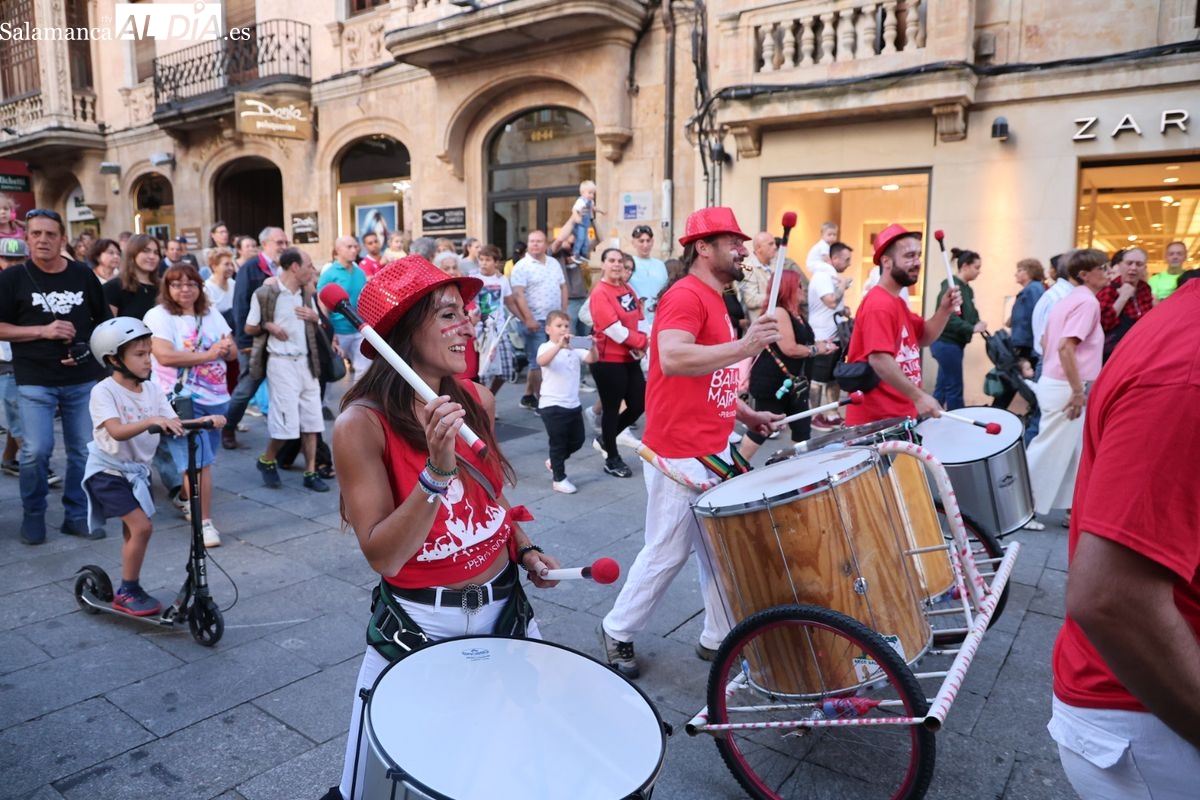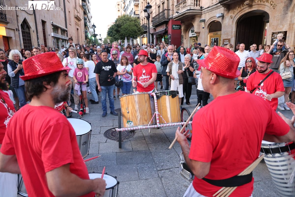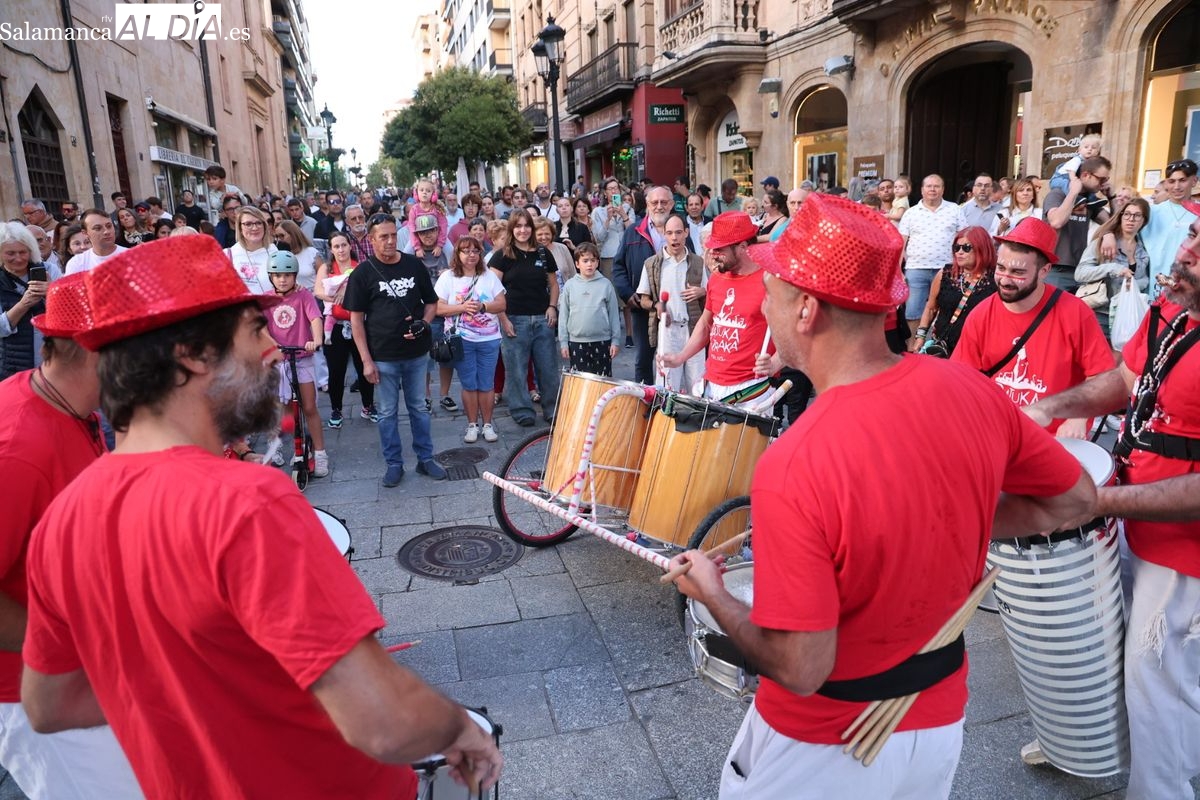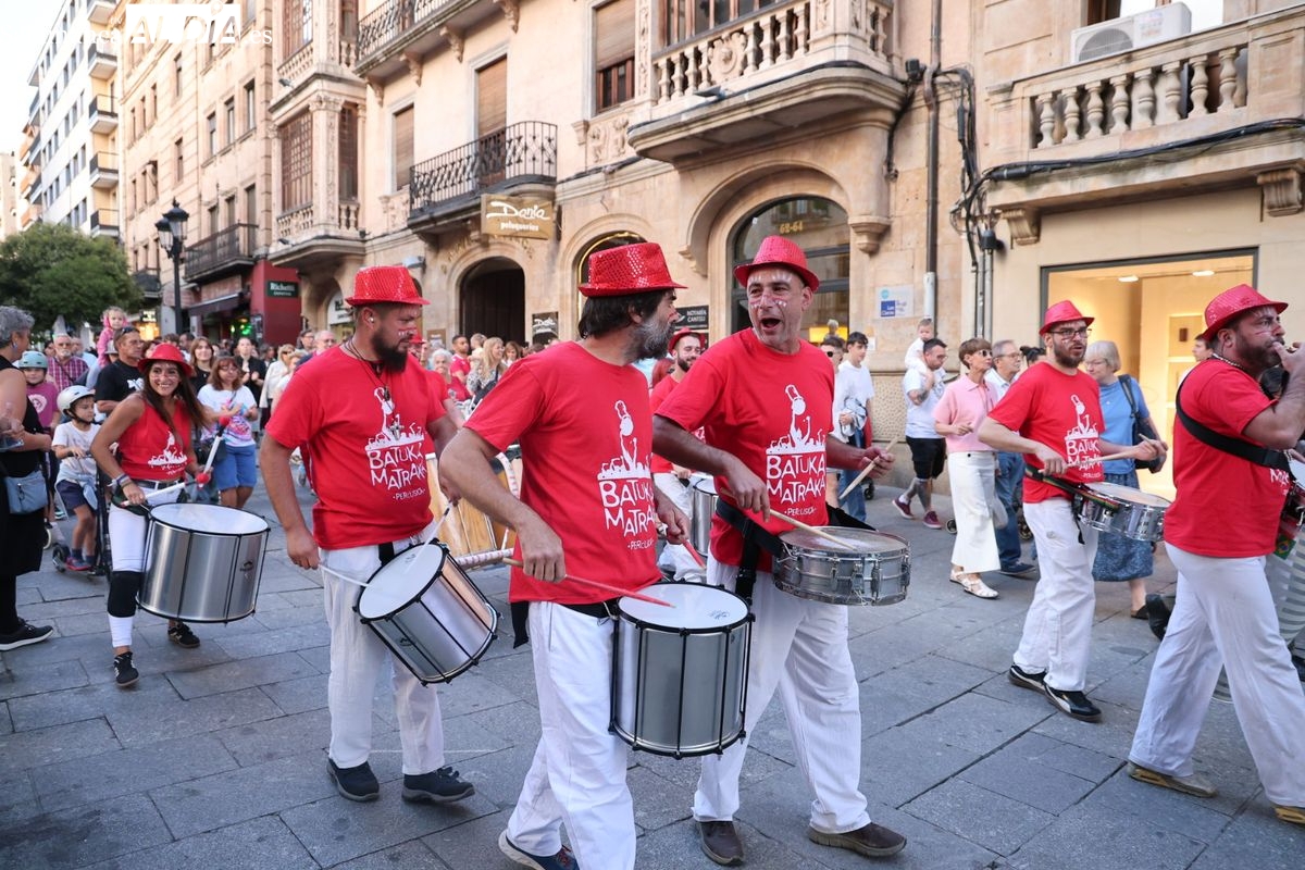 El ritmo y la energía de los tambores ha tomado las calles del centro de Salamanca este martes. La batucada Batukamatraka ha protagonizado un vibrante pasacalles con un recorrido que partirá desde la plaza del Liceo para continuar por la calle Toro, la calle Zamora y la Plaza Mayor, finalizando de nuevo en el punto de origen.