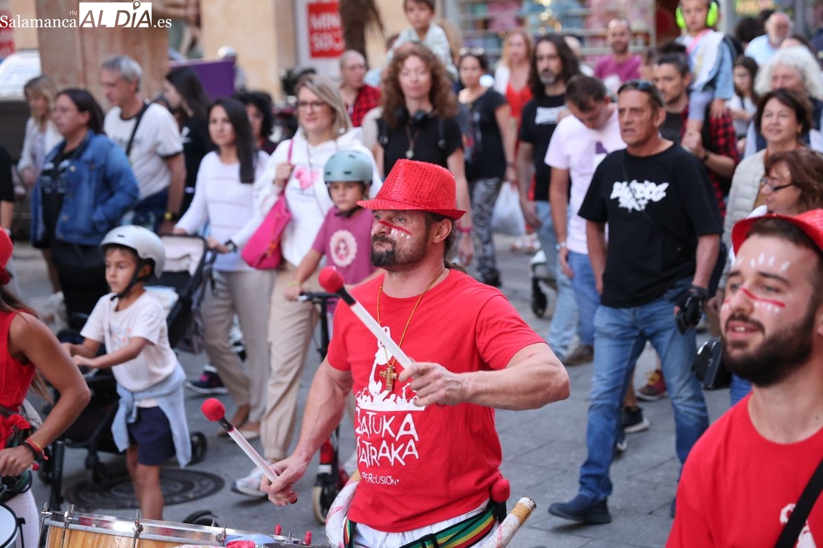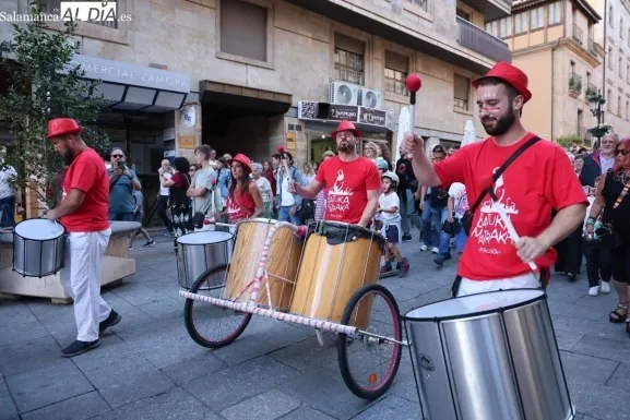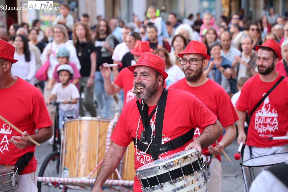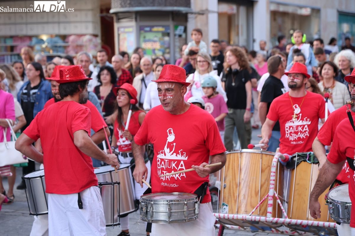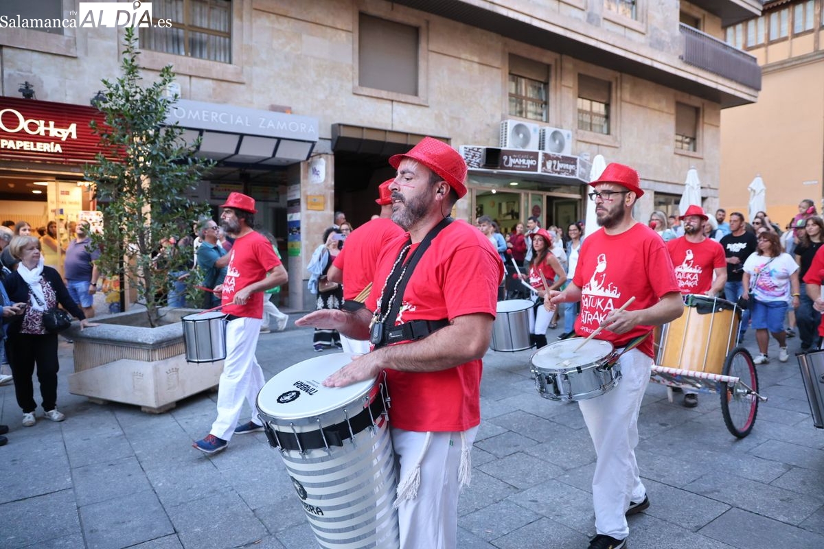 El ritmo y la energía de los tambores ha tomado las calles del centro de Salamanca este martes. La batucada Batukamatraka ha protagonizado un vibrante pasacalles con un recorrido que partirá desde la plaza del Liceo para continuar por la calle Toro, la calle Zamora y la Plaza Mayor, finalizando de nuevo en el punto de origen.