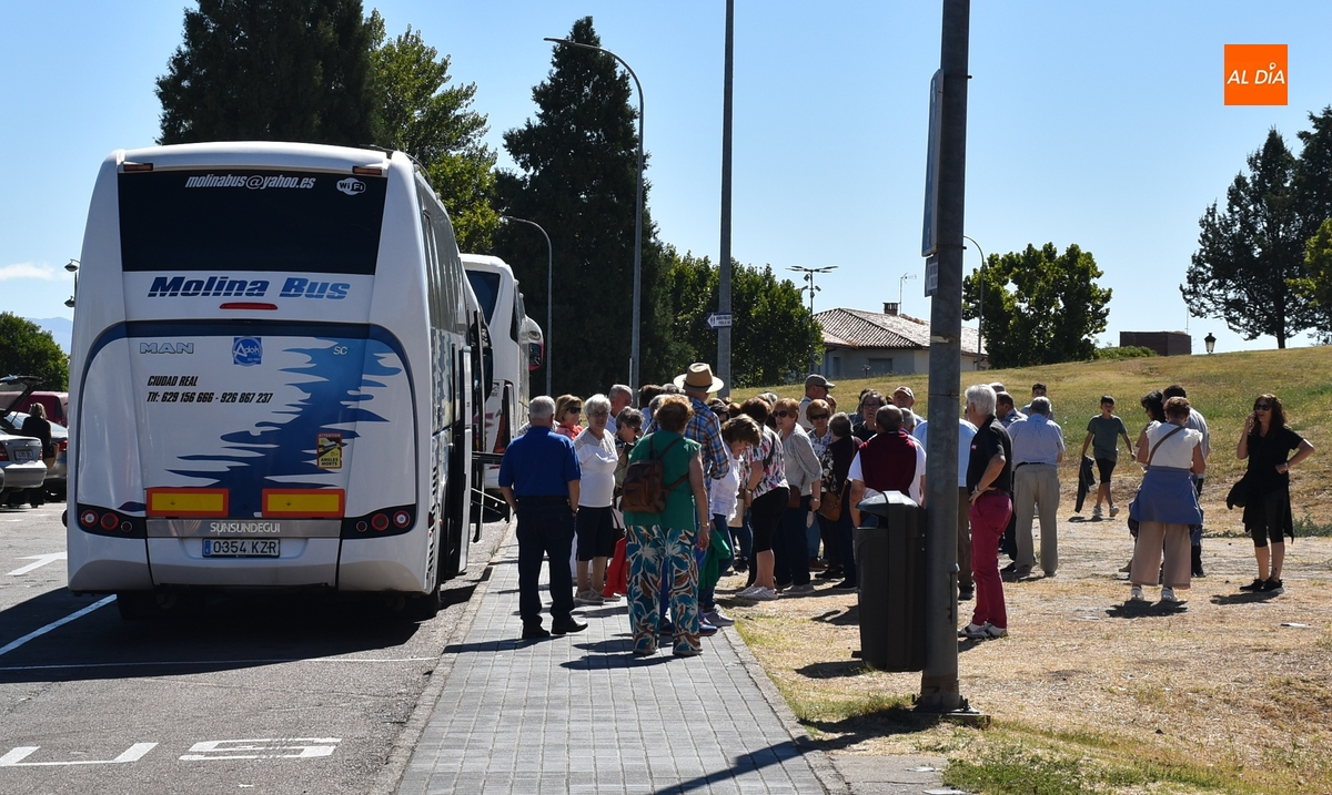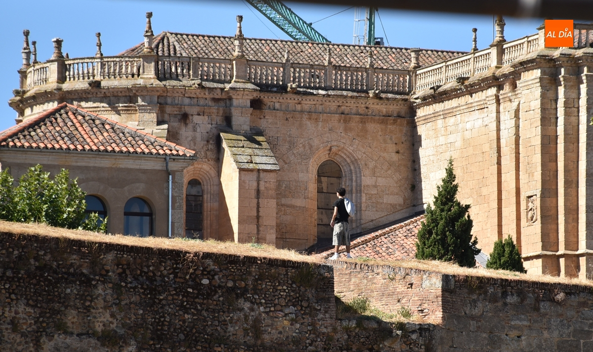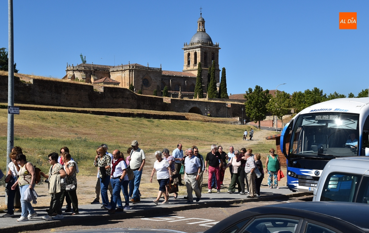 Esta pancarta es contemplada de forma directa por los turistas que llegan a Ciudad Rodrigo en los autobuses que estacionan en la Avenida de Sefarad, contándose en la mañana del jueves con tres. En la minigalería figura uno de estos autobuses junto a sus ocupantes, que una vez se bajaron del mismo pusieron rumbo al recinto amurallado, donde también se pudieron ver varias familias (a una de las cuales pertenece un joven que aparece en la minigalería oteando la ciudad desde la muralla).