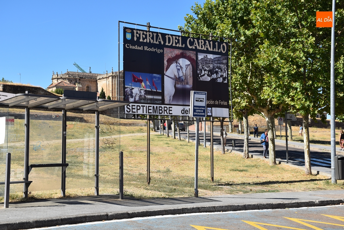 El cruce de las avenidas Sefarad y Yurramendi de Ciudad Rodrigo alberga estos días la pancarta promocional de la Feria del Caballo que se celebrará en la ciudad del viernes 19 al domingo 21, como se refleja de forma específica en la parte inferior de esa pancarta, siendo el único elemento que cambia año tras año (el componente principal son tres fotografías con los caballos como protagonistas).