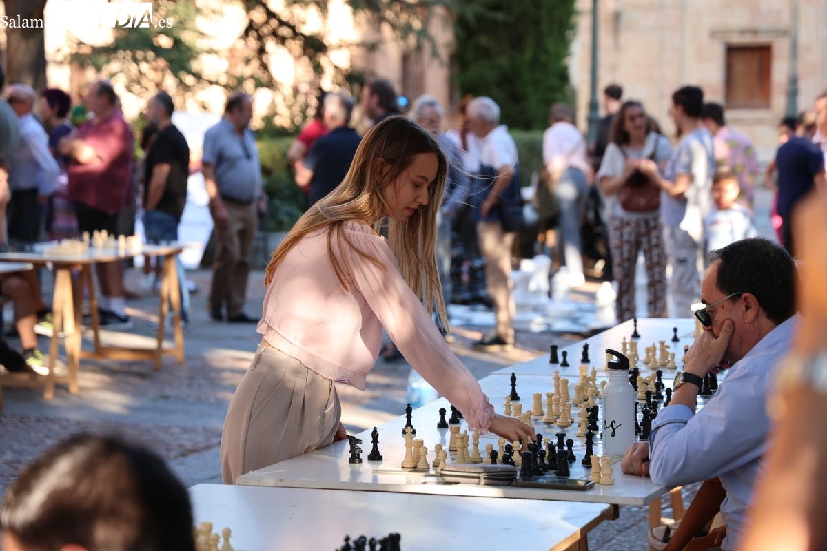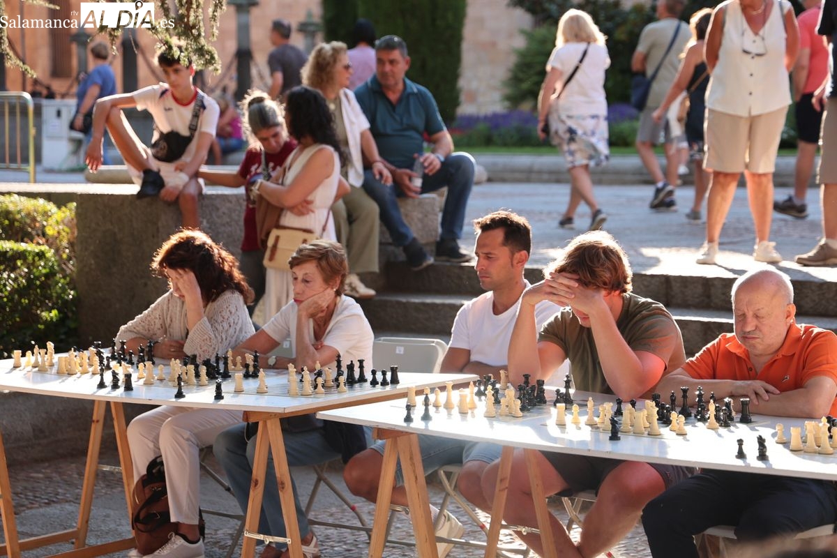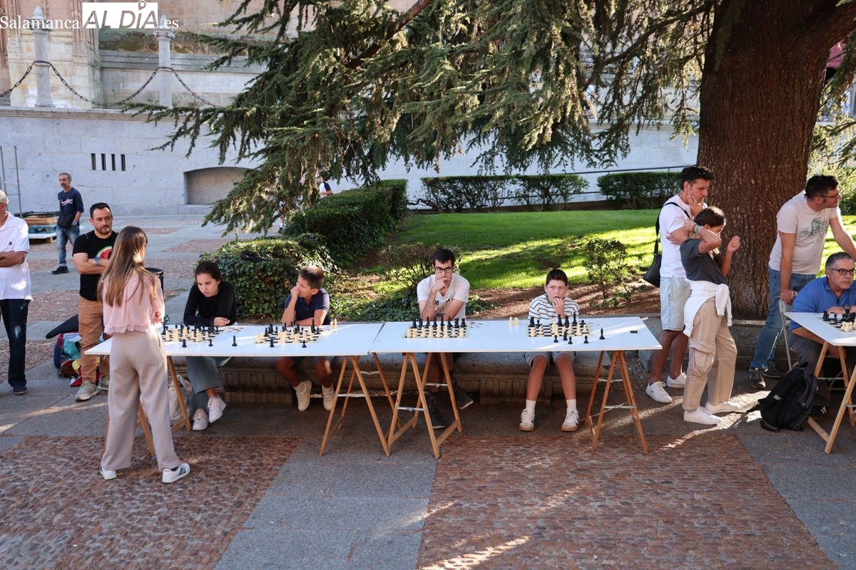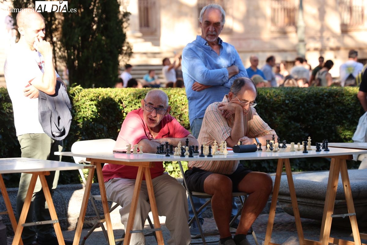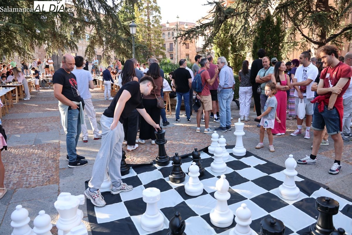 La Plaza de Anaya se ha convertido durante la tarde de este viernes en un gran tablero al aire libre con la celebración de la Feria de Ajedrez. Esta iniciativa, enmarcada dentro del programa de las Ferias y Fiestas de Salamanca, ha congregado a numerosos curiosos y aficionados para disfrutar de esta disciplina.
