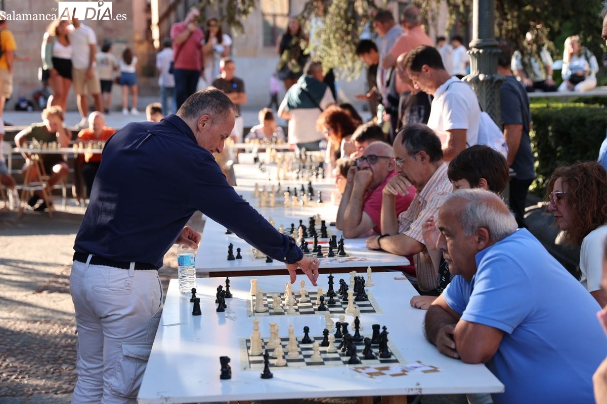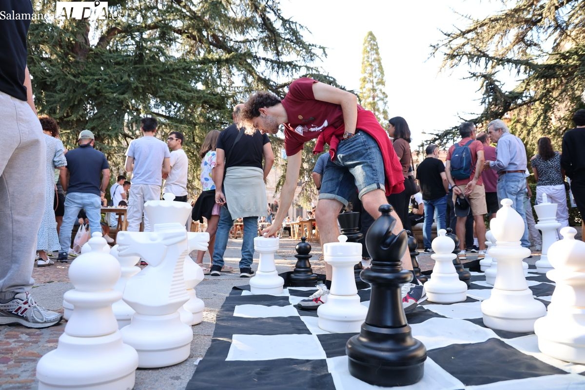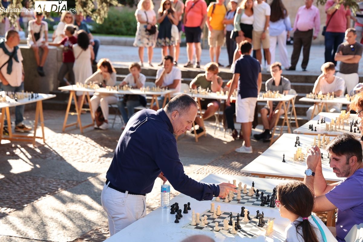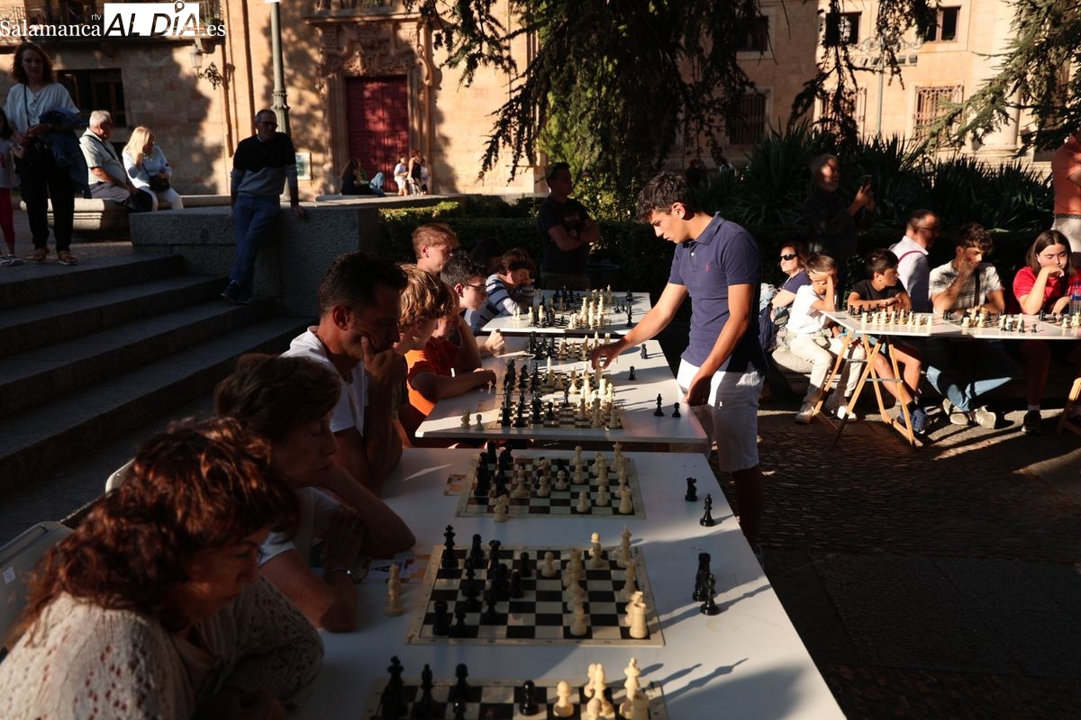 La Plaza de Anaya se ha convertido durante la tarde de este viernes en un gran tablero al aire libre con la celebración de la Feria de Ajedrez. Esta iniciativa, enmarcada dentro del programa de las Ferias y Fiestas de Salamanca, ha congregado a numerosos curiosos y aficionados para disfrutar de esta disciplina.
