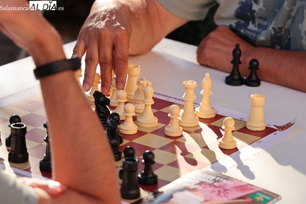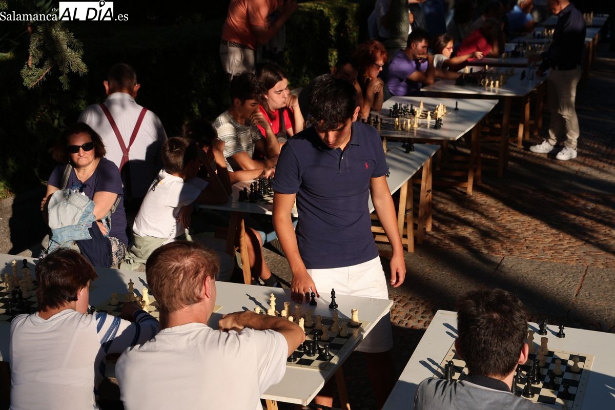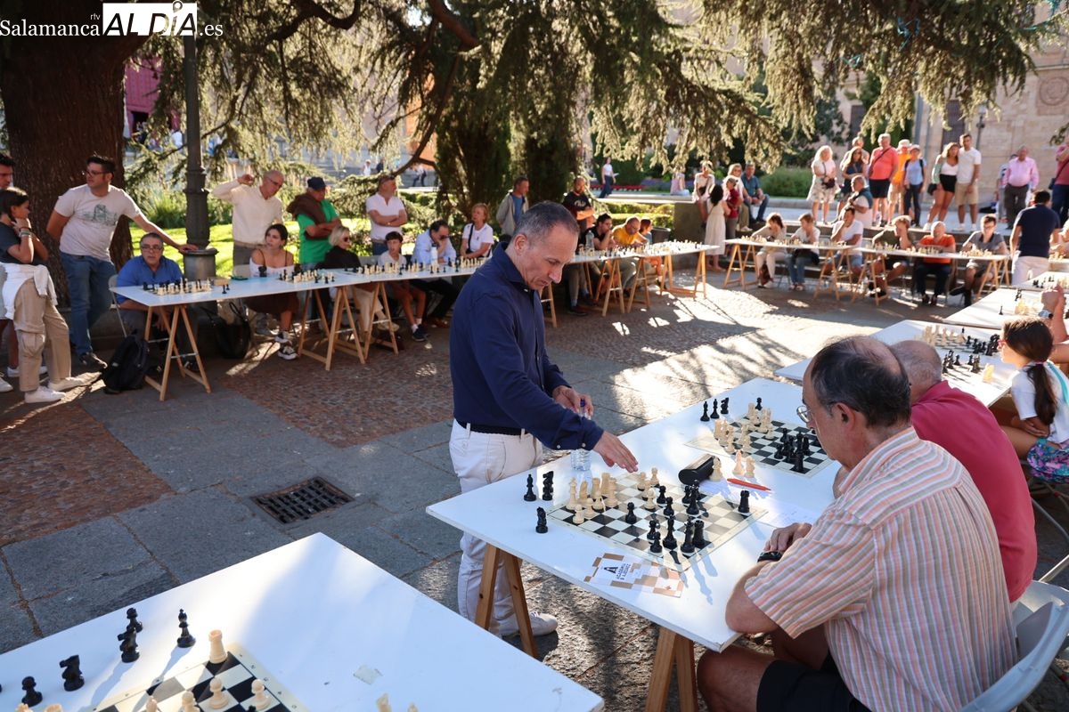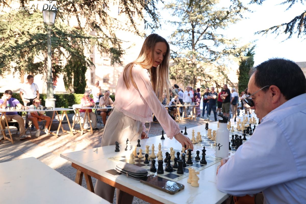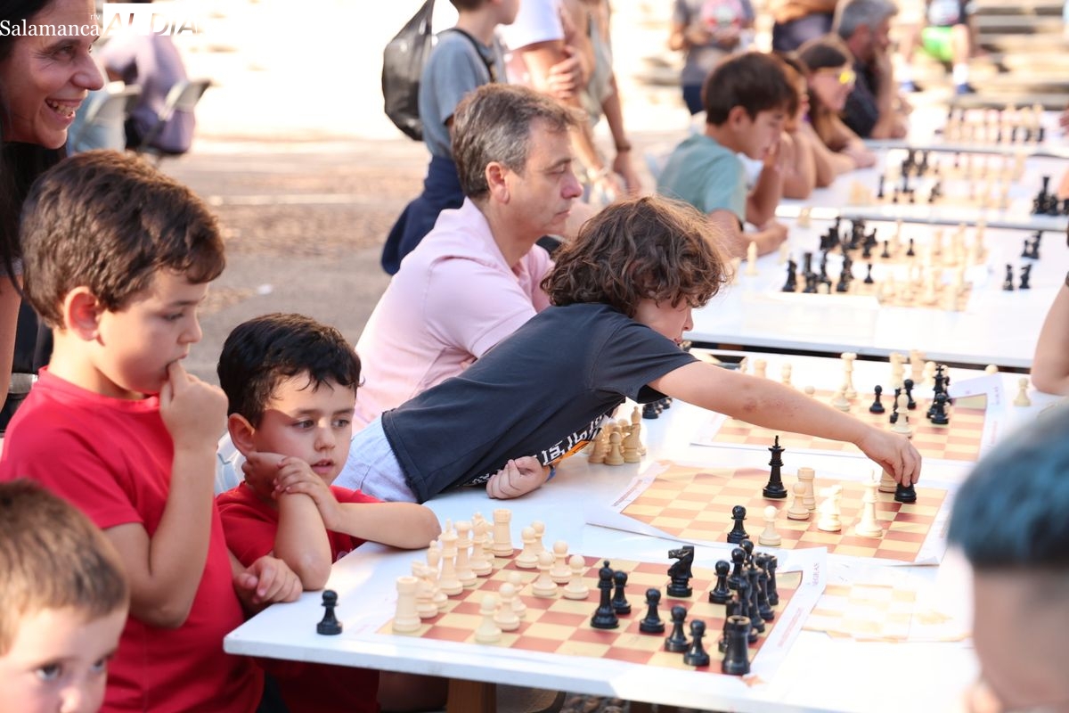 La Plaza de Anaya se ha convertido durante la tarde de este viernes en un gran tablero al aire libre con la celebración de la Feria de Ajedrez. Esta iniciativa, enmarcada dentro del programa de las Ferias y Fiestas de Salamanca, ha congregado a numerosos curiosos y aficionados para disfrutar de esta disciplina.