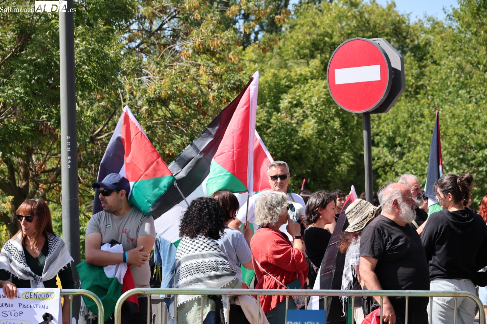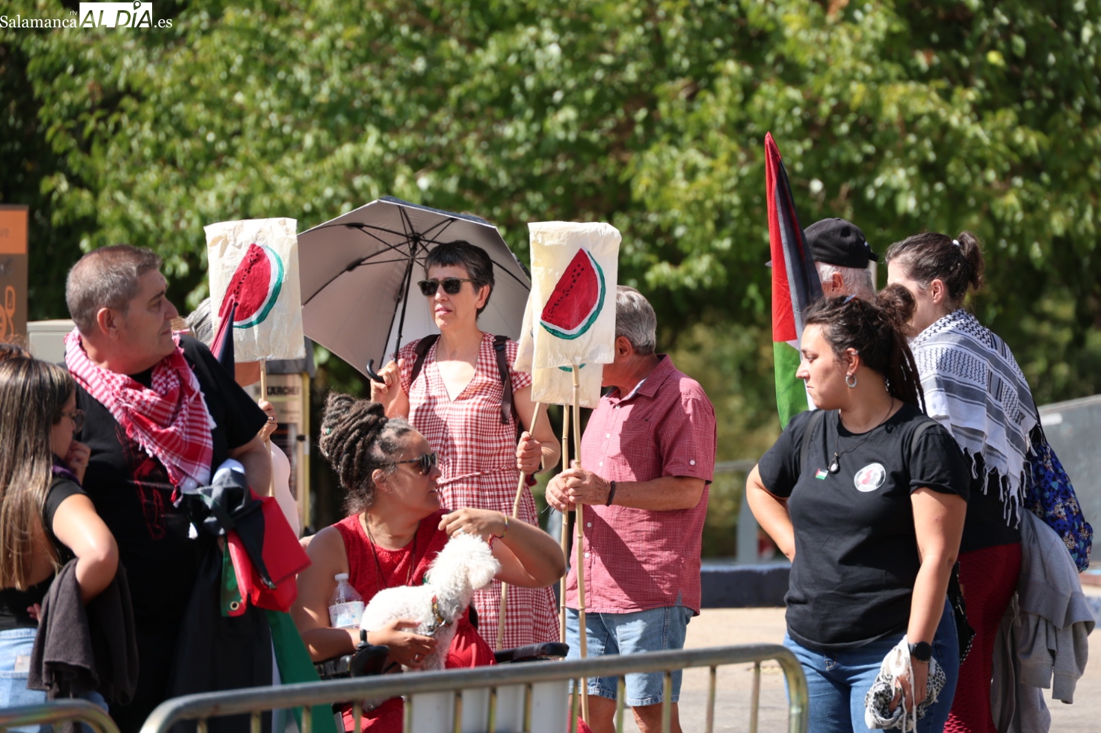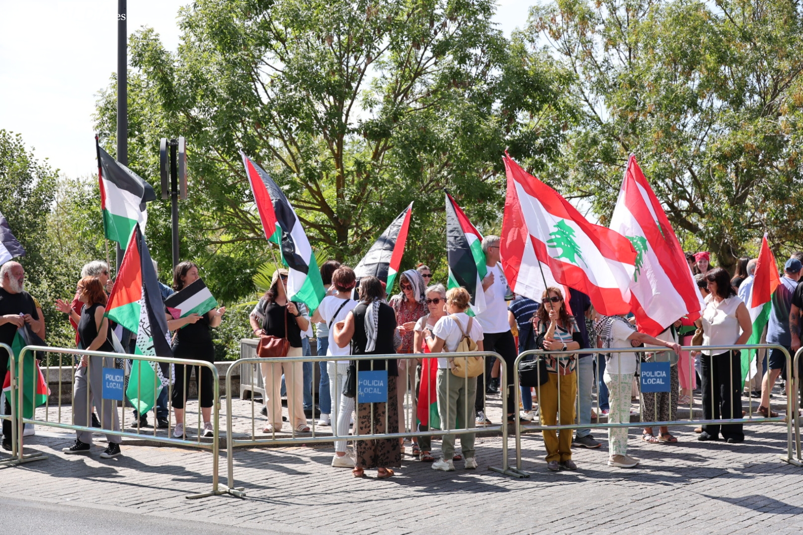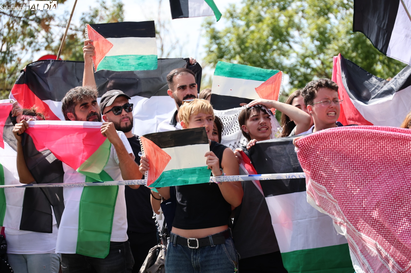 Un grupo de manifestantes pro-Palestina se ha concentrado en la calle Reyes Católicos, a la altura de la gasolinera, a la espera del paso del pelotón de La Vuelta Ciclista a España 2025. La protesta se ha desarrollado en un ambiente reivindicativo, bajo la mirada de un importante dispositivo de seguridad que se ha desplegado para garantizar tanto la seguridad de los ciclistas como la de los asistentes.
