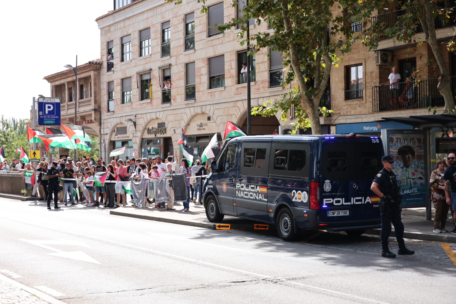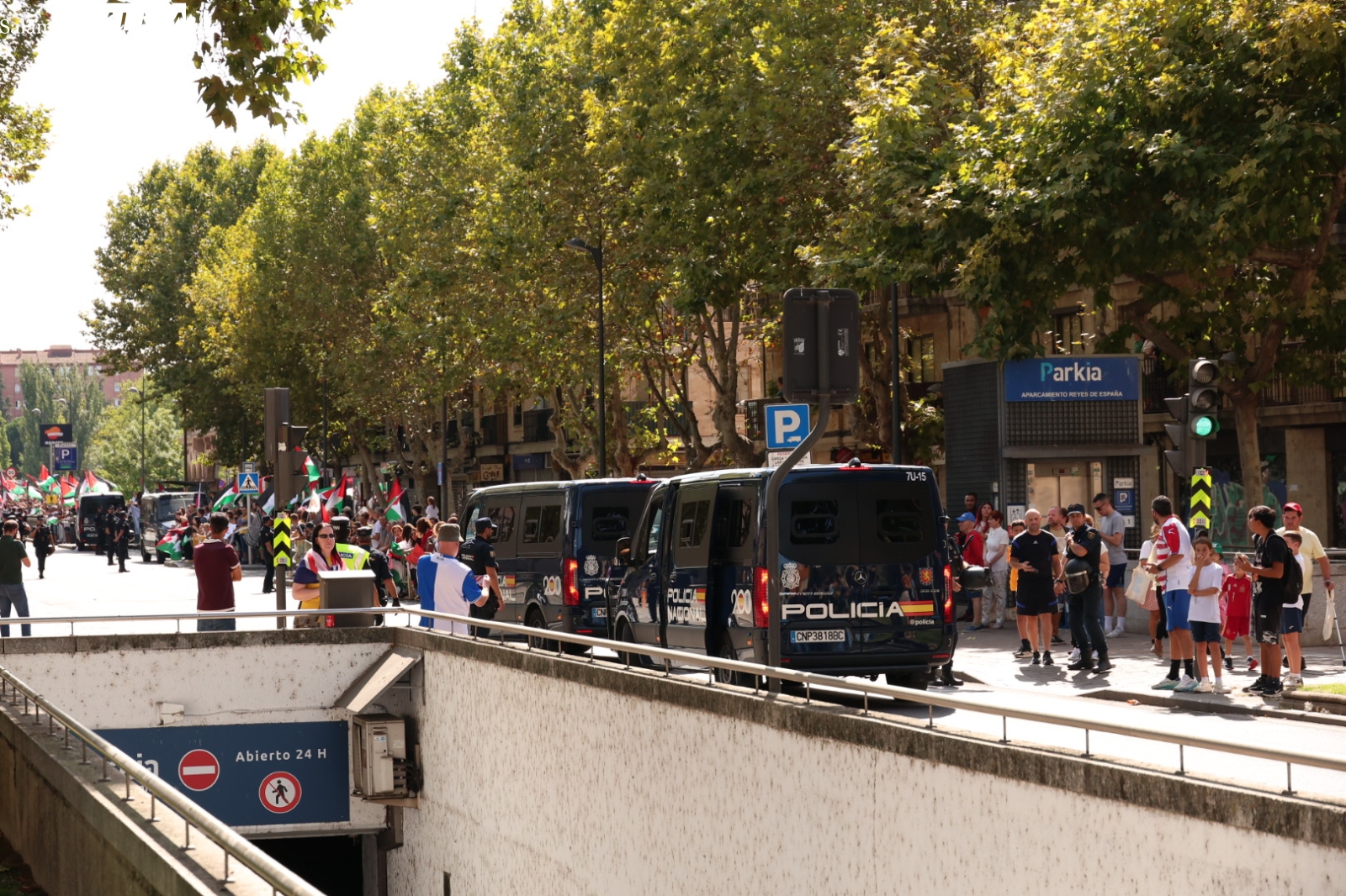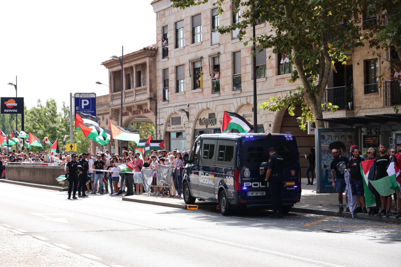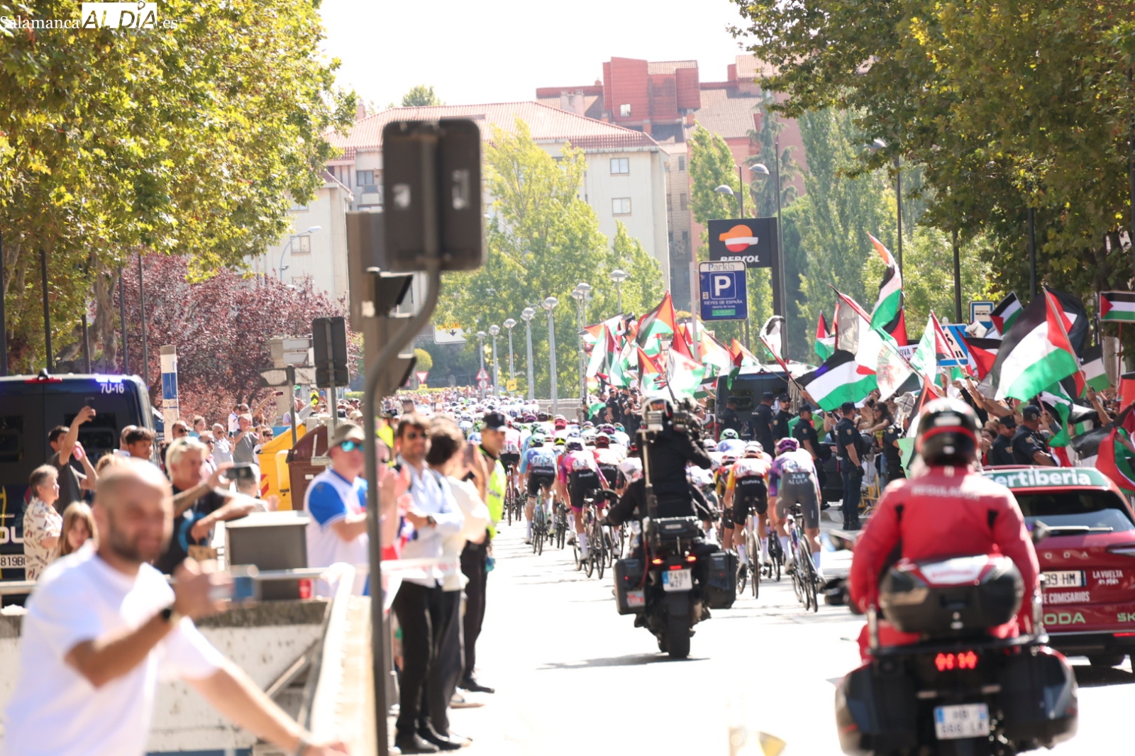 Los participantes han portado pancartas y consignas en apoyo al pueblo palestino, aprovechando la visibilidad que ha generado el evento deportivo. Mientras tanto, agentes de la Policía Nacional y efectivos de seguridad local han mantenido el control de la situación, regulando los accesos y vigilando de cerca la marcha del pelotón.