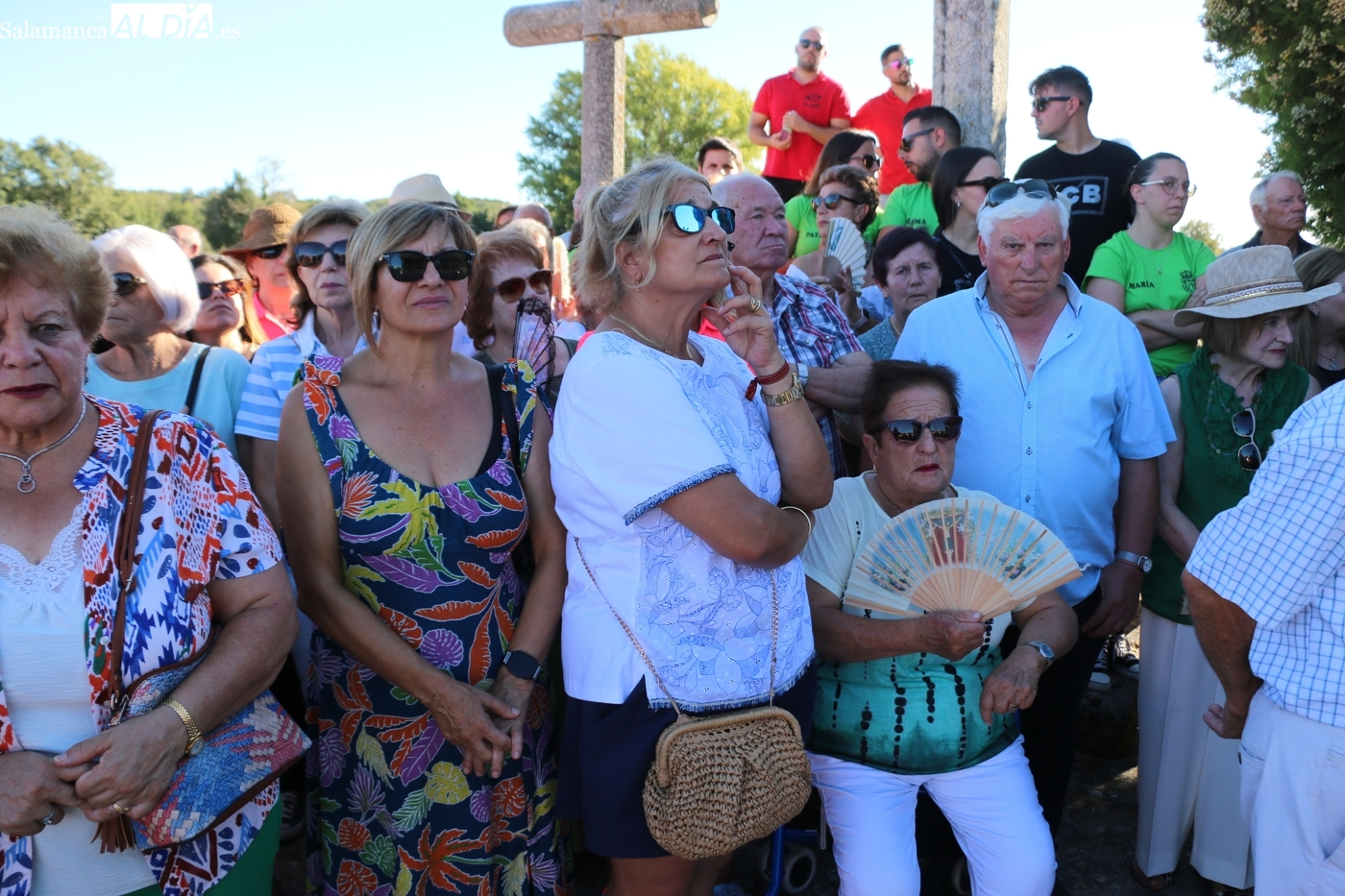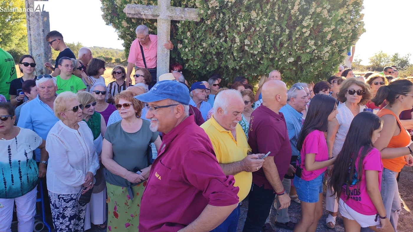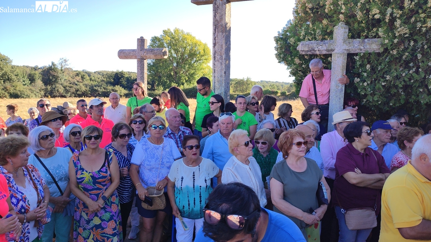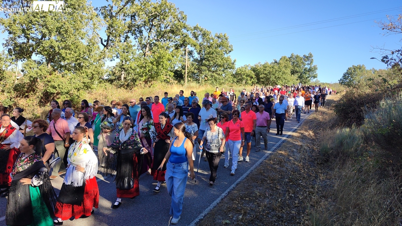 Cientos de vecinos acompañaron al patrón en la procesión hasta la ermita para acompañar a las mayordomas María José Bustillo y María Santamaría Vicente, asistir al ofertorio y al cambio de varas a favor de Maricruz Vicente y Sonsoles Santamaría
