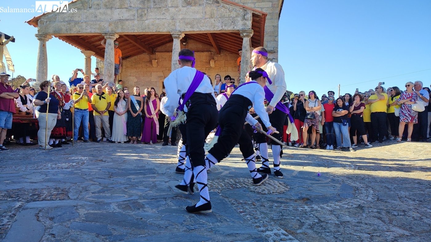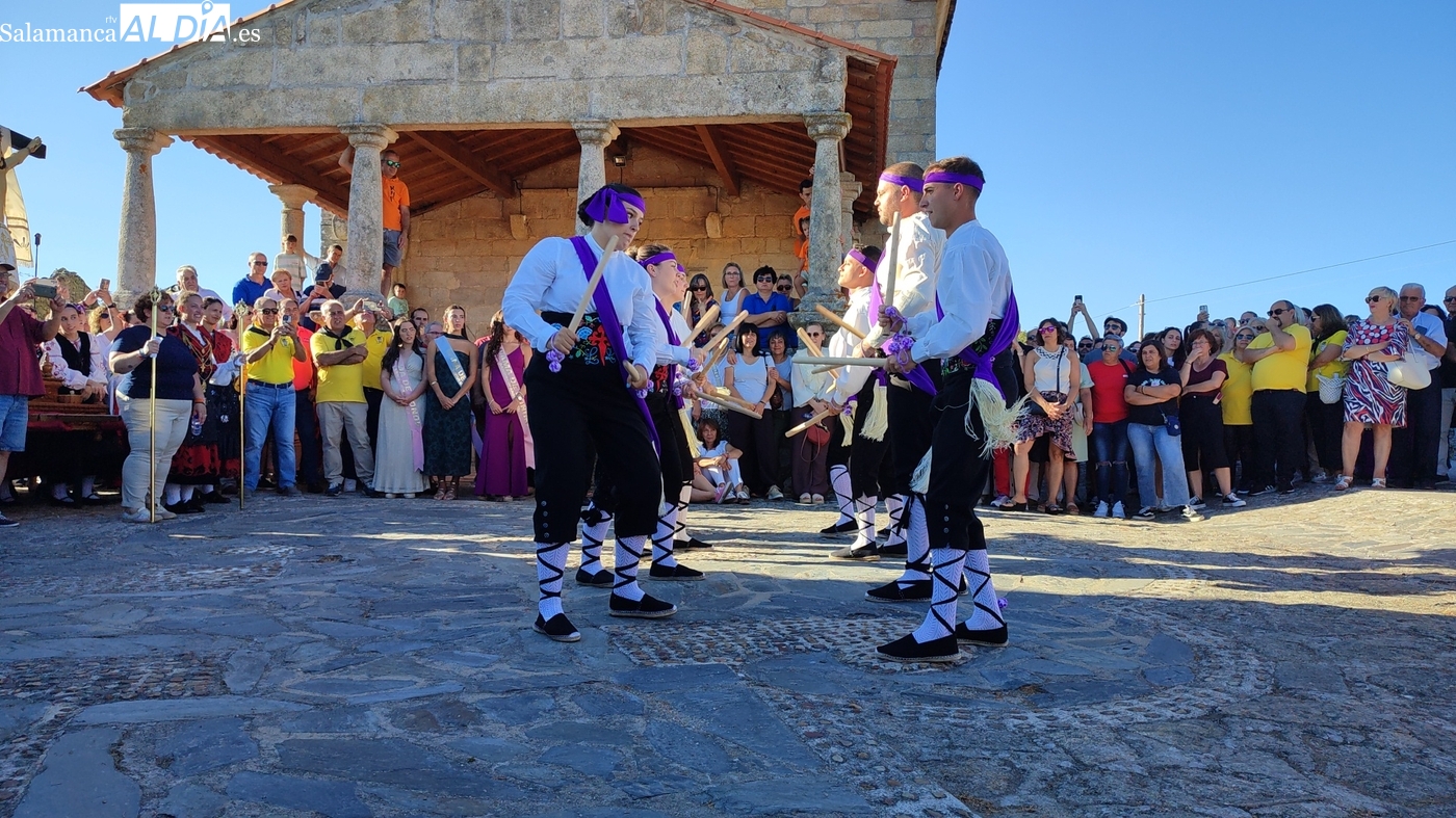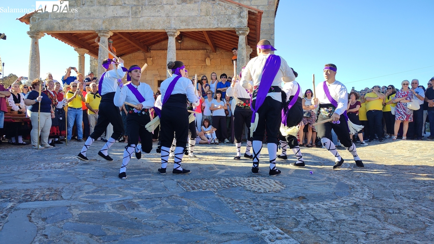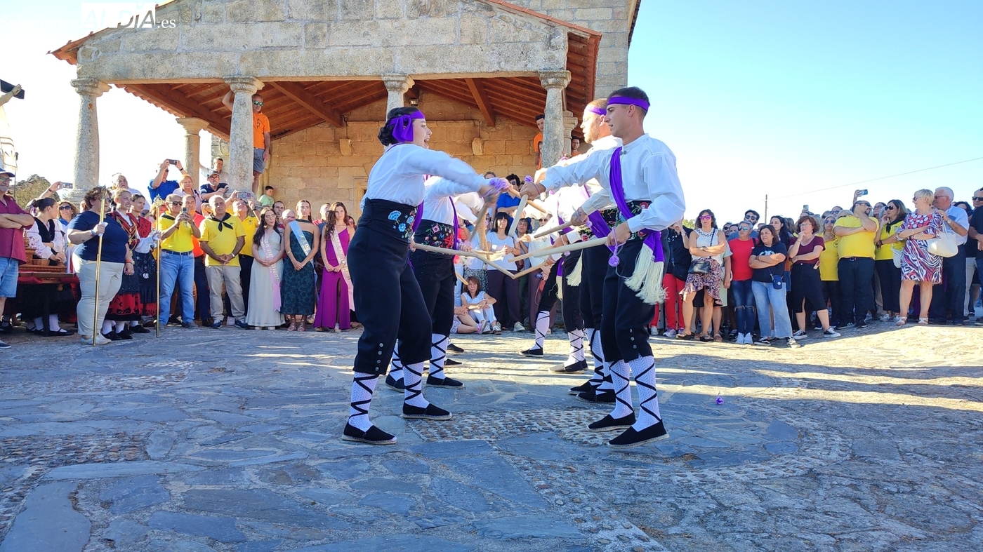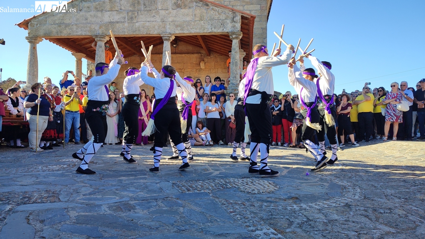 Una vez a las puertas de la ermita, comenzaba el ofertorio para continuar con el baile de la bandera interpretado con la gaita y el tamboril por Leonardo Alburquerque. Finalizada esta ancestral danza llegaba el turno del grupo de paleos con tres interpretaciones de este tipo de danza y que finalizaban con un caluroso aplauso del público congregado en torno a la ermita. Seguidamente tendría lugar el cambio de varas a favor de las nuevas mayordomas, que lo serán por un año Maricruz Vicente y Sonsoles Santamaría.