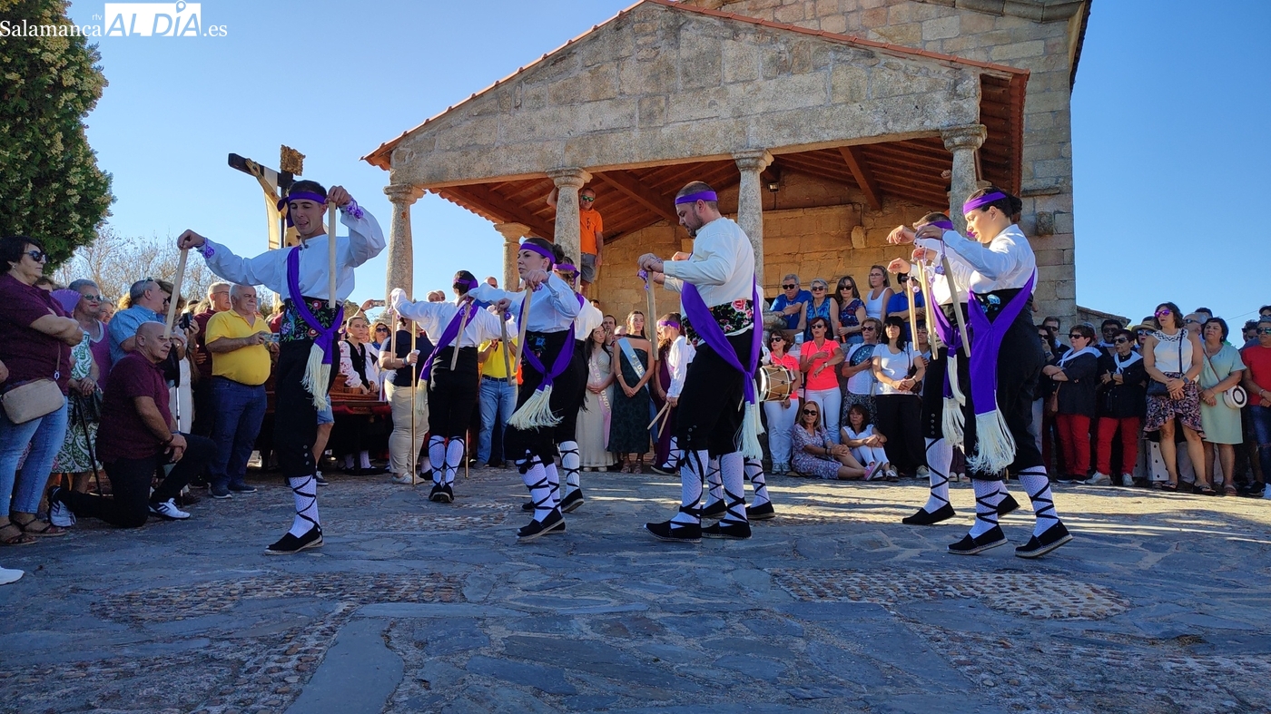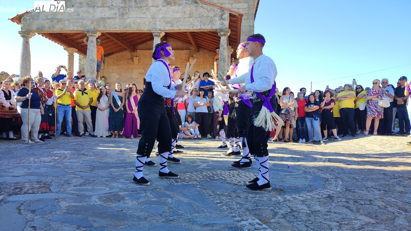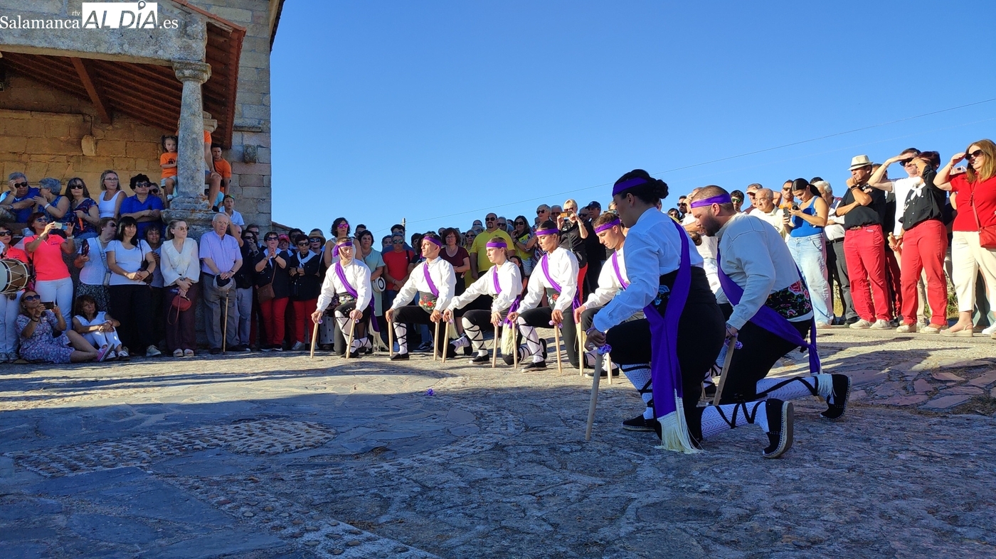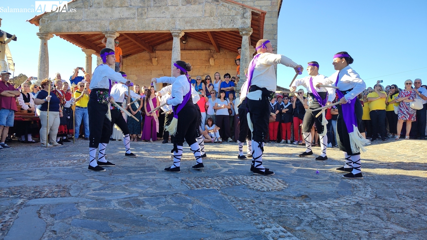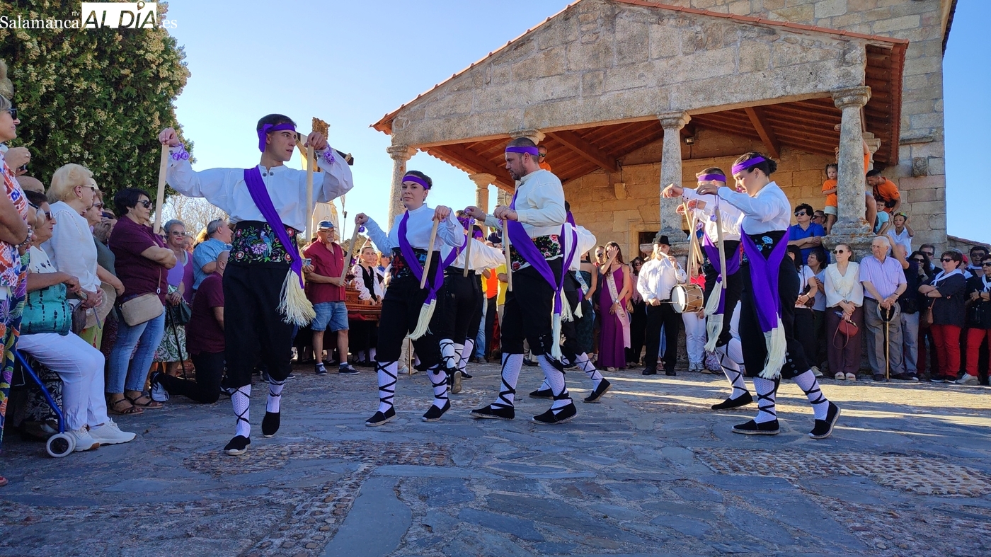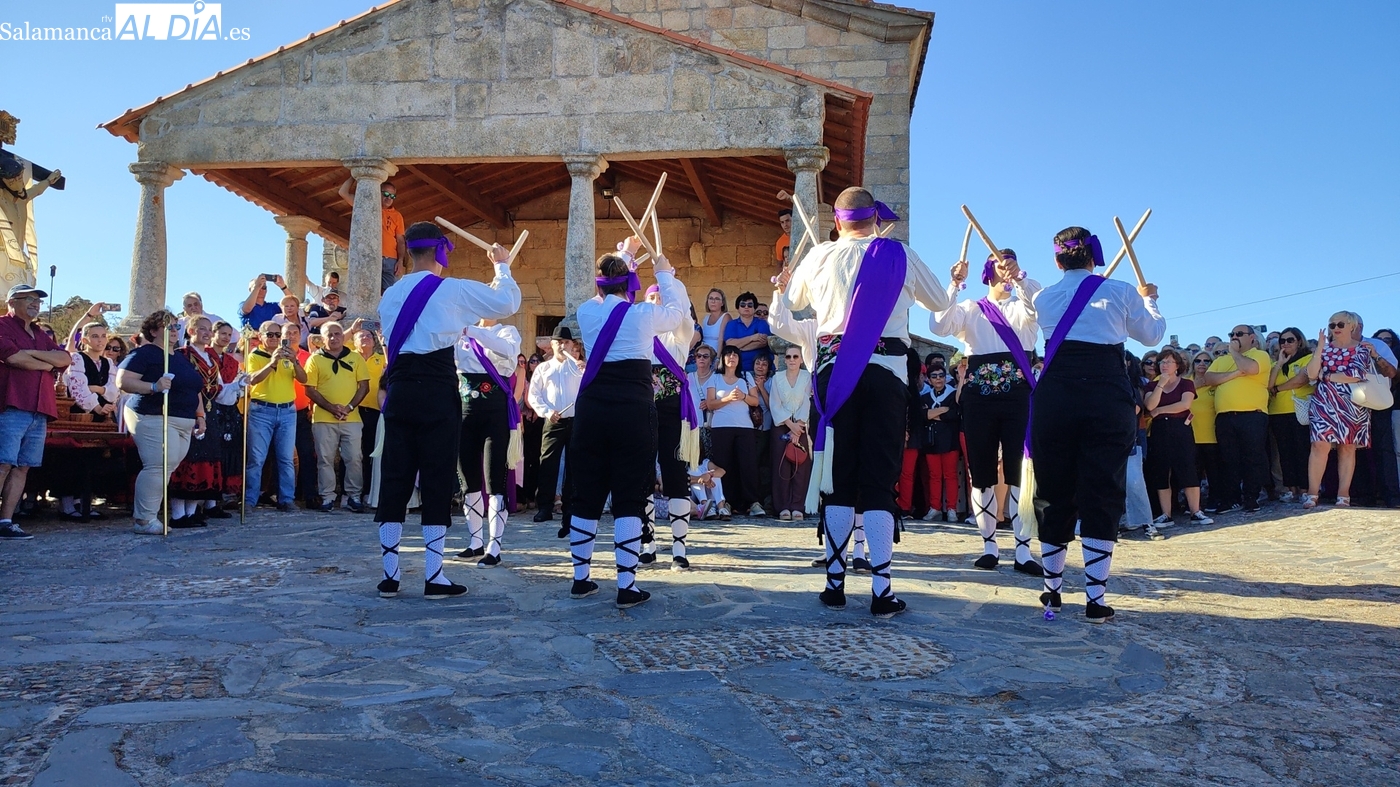Una vez a las puertas de la ermita, comenzaba el ofertorio para continuar con el baile de la bandera interpretado con la gaita y el tamboril por Leonardo Alburquerque. Finalizada esta ancestral danza llegaba el turno del grupo de paleos con tres interpretaciones de este tipo de danza y que finalizaban con un caluroso aplauso del público congregado en torno a la ermita. Seguidamente tendría lugar el cambio de varas a favor de las nuevas mayordomas, que lo serán por un año Maricruz Vicente y Sonsoles Santamaría.
