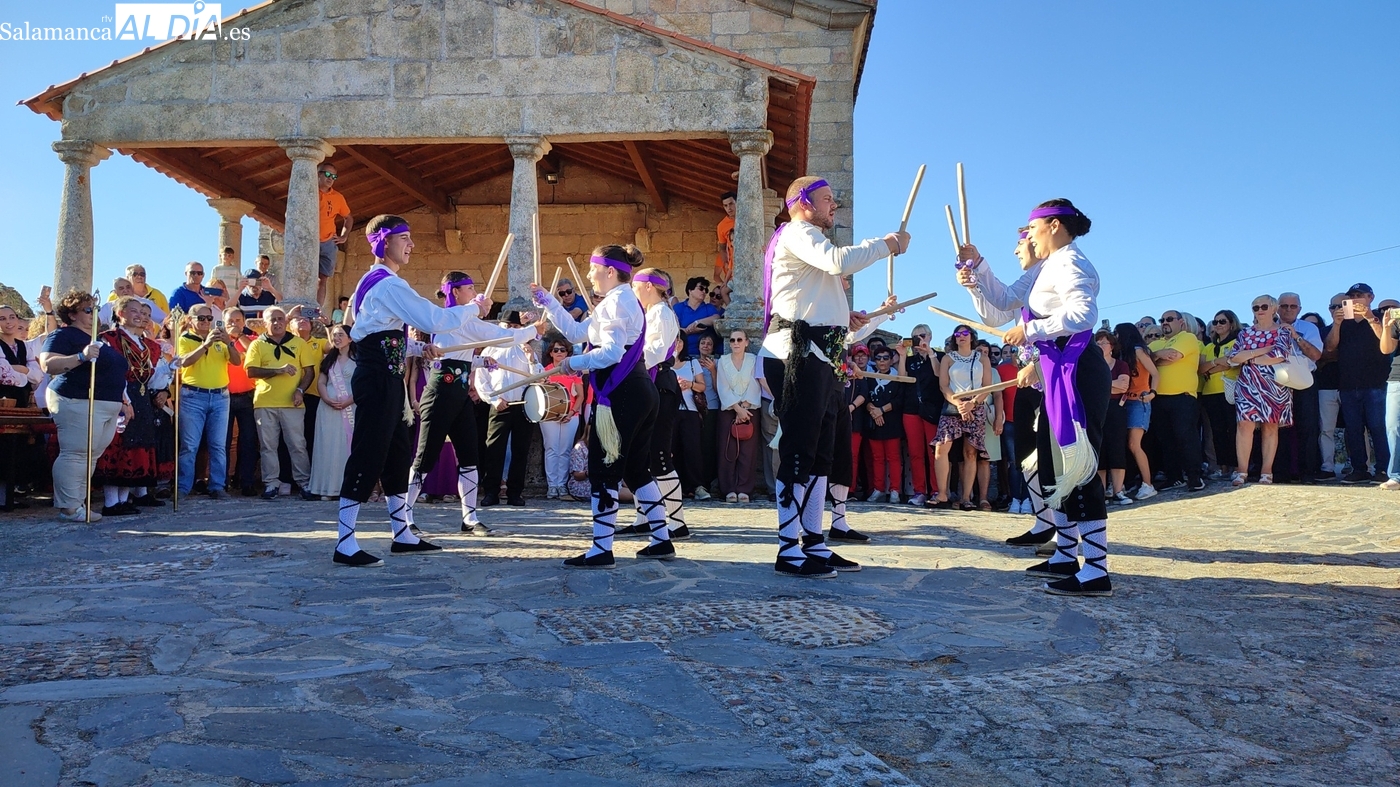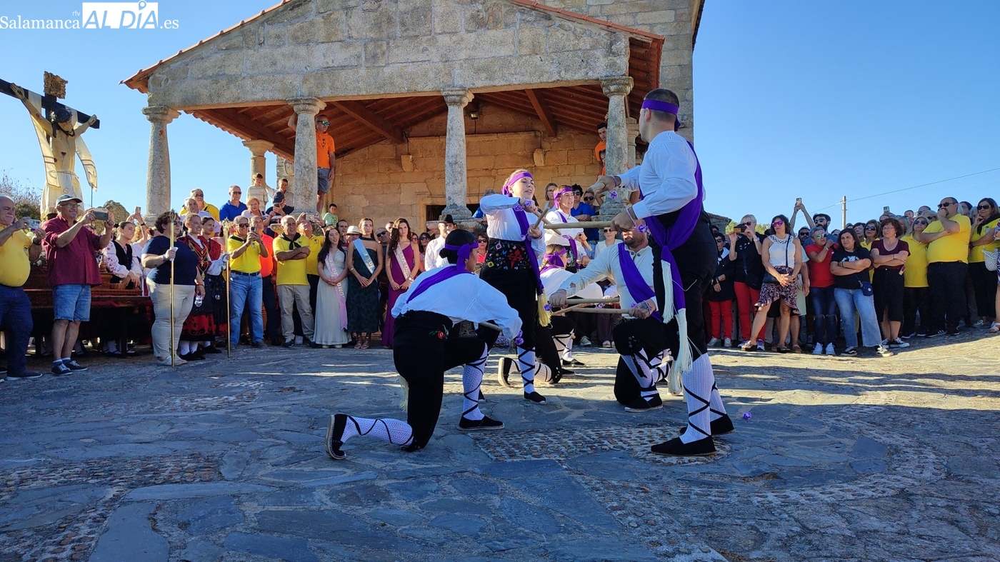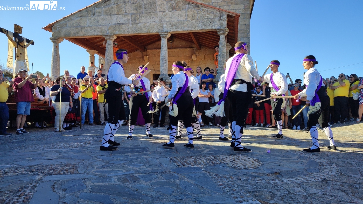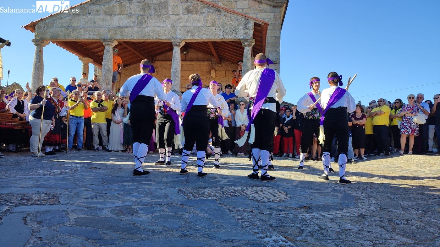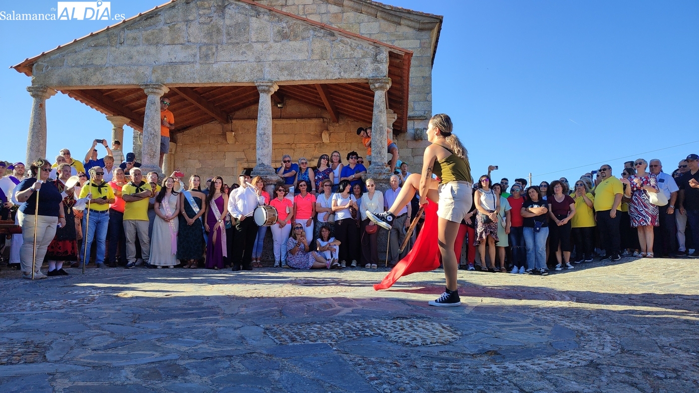 Una vez a las puertas de la ermita, comenzaba el ofertorio para continuar con el baile de la bandera interpretado con la gaita y el tamboril por Leonardo Alburquerque. Finalizada esta ancestral danza llegaba el turno del grupo de paleos con tres interpretaciones de este tipo de danza y que finalizaban con un caluroso aplauso del público congregado en torno a la ermita. Seguidamente tendría lugar el cambio de varas a favor de las nuevas mayordomas, que lo serán por un año Maricruz Vicente y Sonsoles Santamaría.