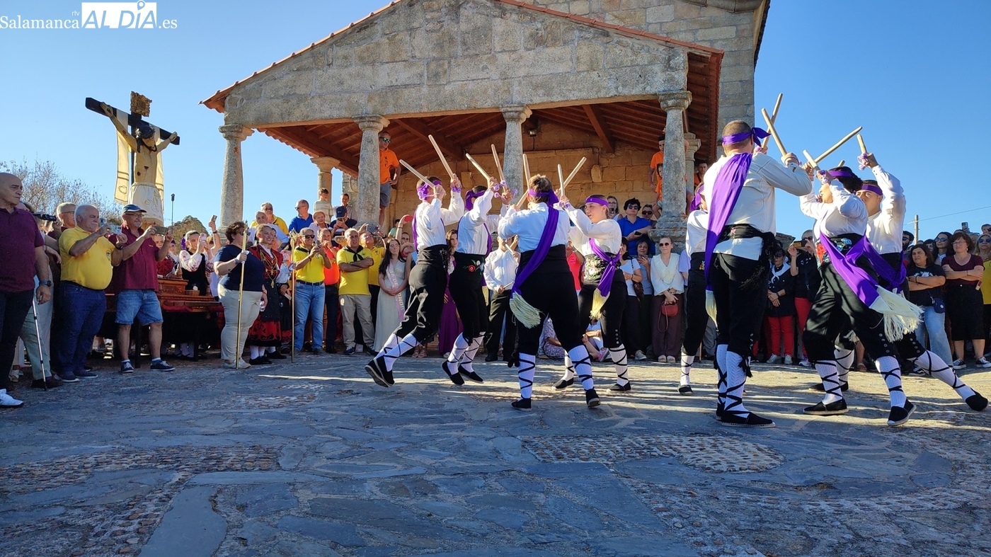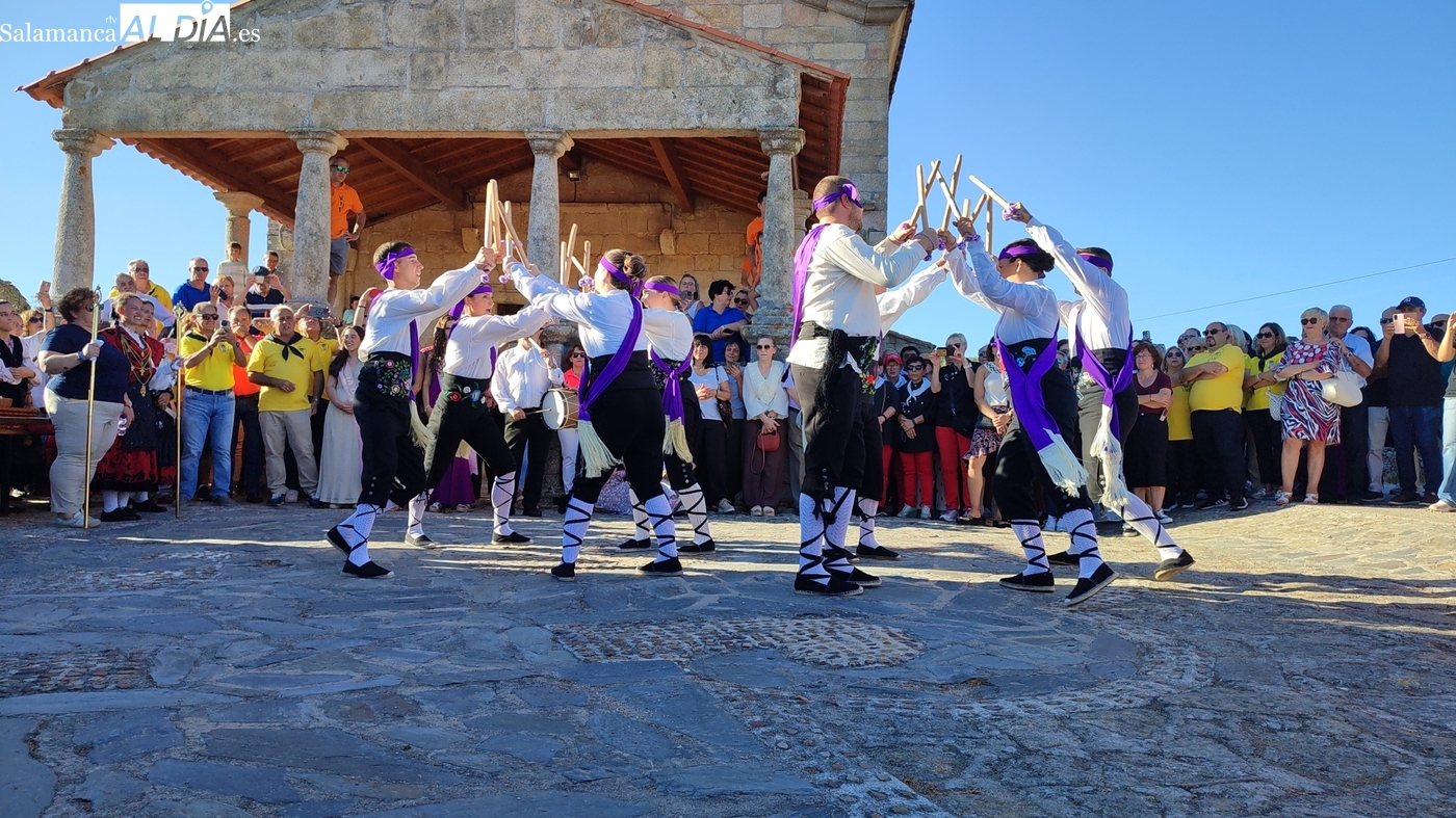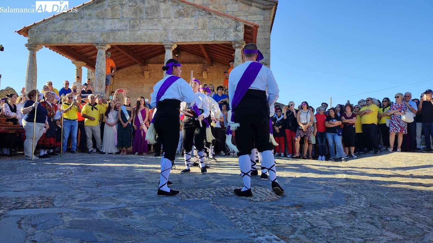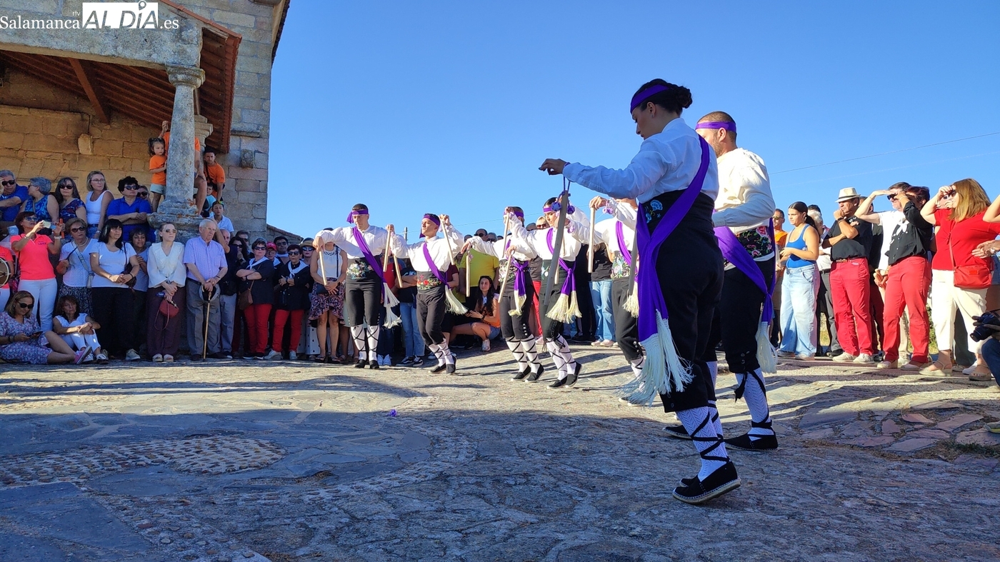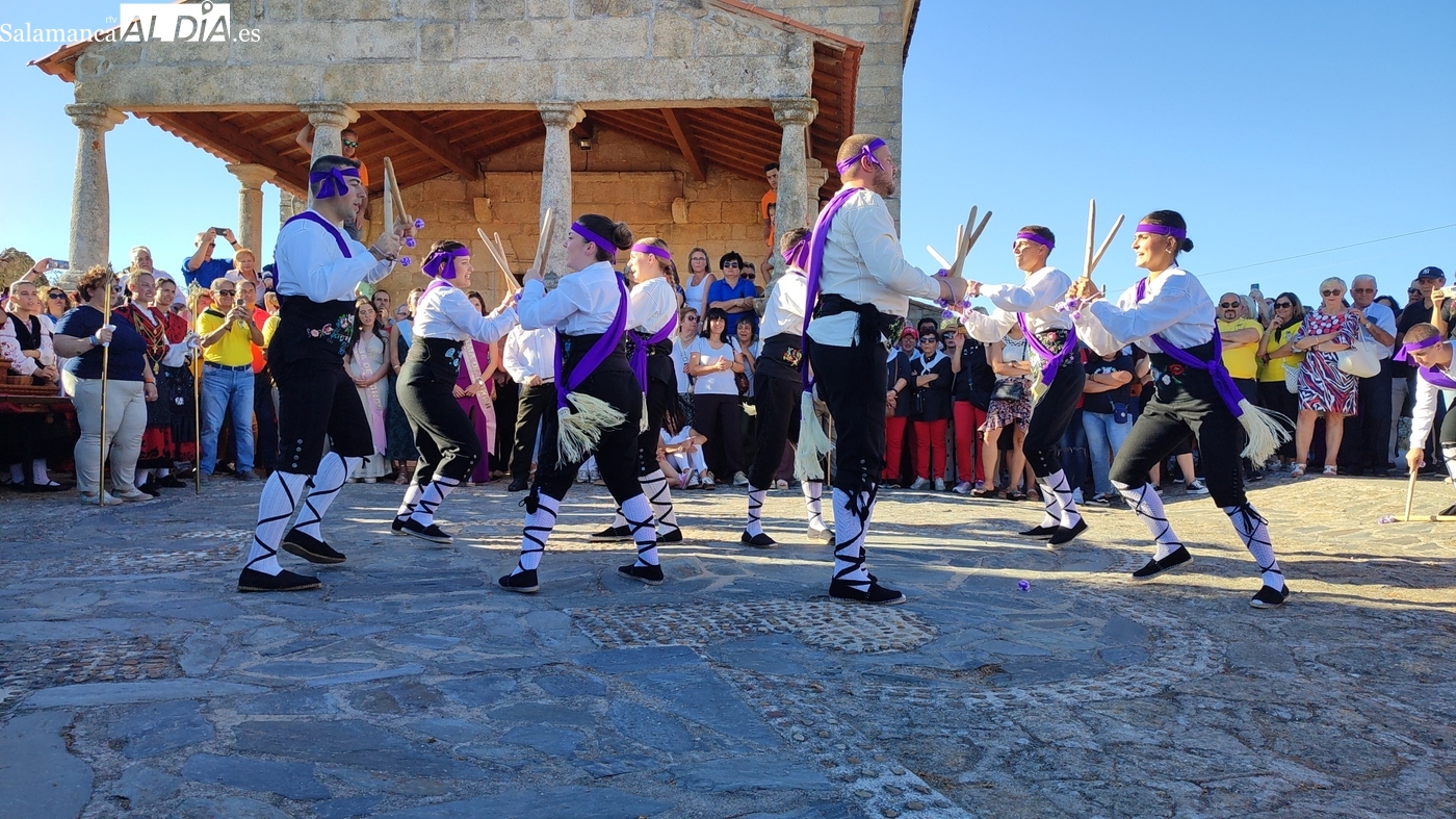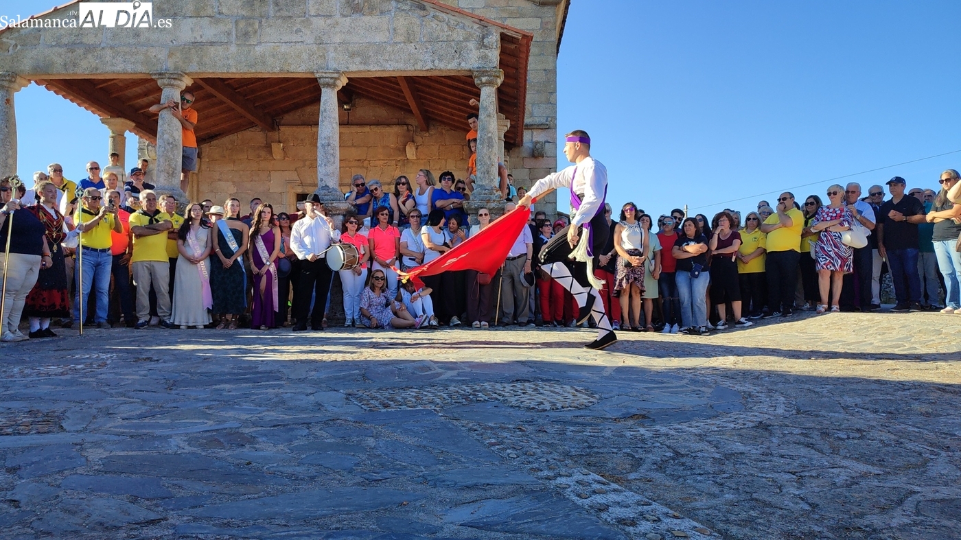 Una vez a las puertas de la ermita, comenzaba el ofertorio para continuar con el baile de la bandera interpretado con la gaita y el tamboril por Leonardo Alburquerque. Finalizada esta ancestral danza llegaba el turno del grupo de paleos con tres interpretaciones de este tipo de danza y que finalizaban con un caluroso aplauso del público congregado en torno a la ermita. Seguidamente tendría lugar el cambio de varas a favor de las nuevas mayordomas, que lo serán por un año Maricruz Vicente y Sonsoles Santamaría.