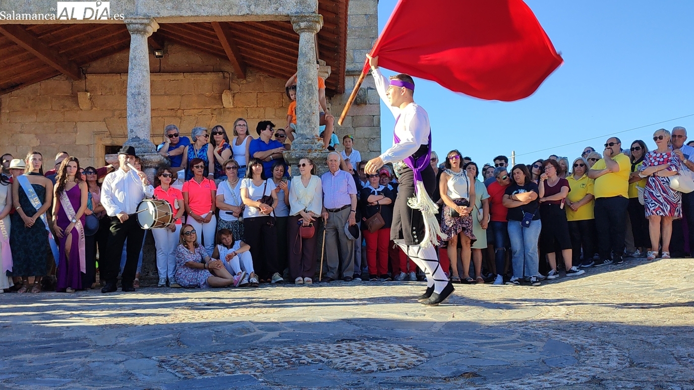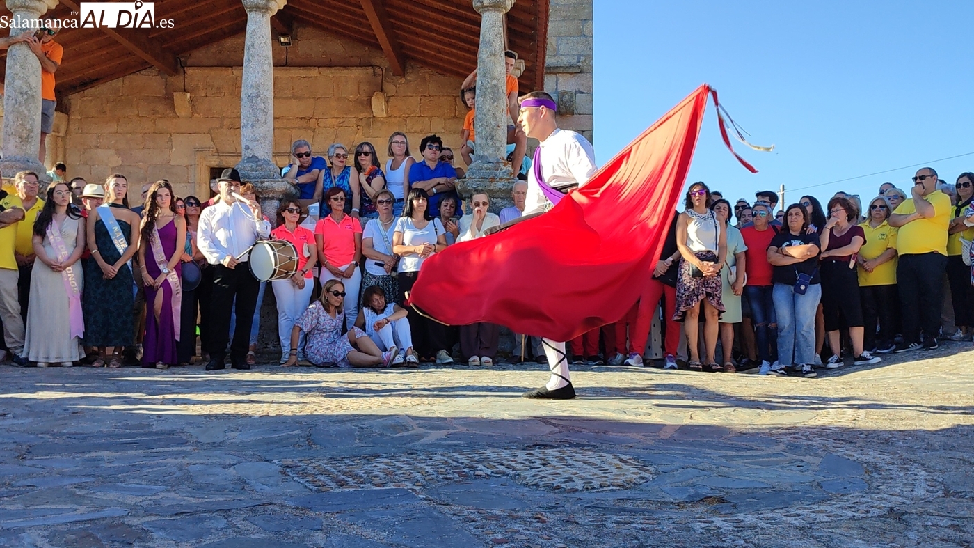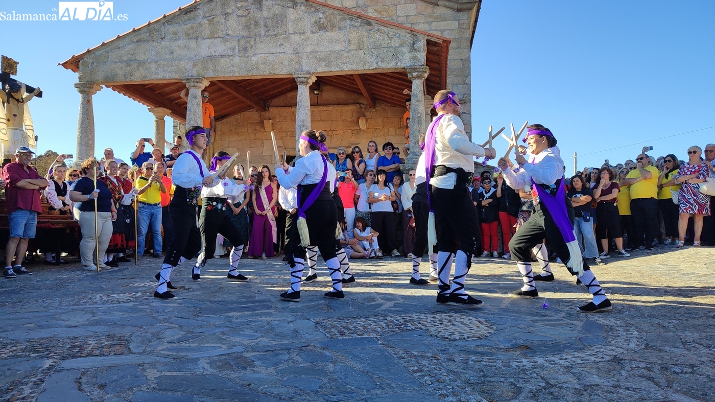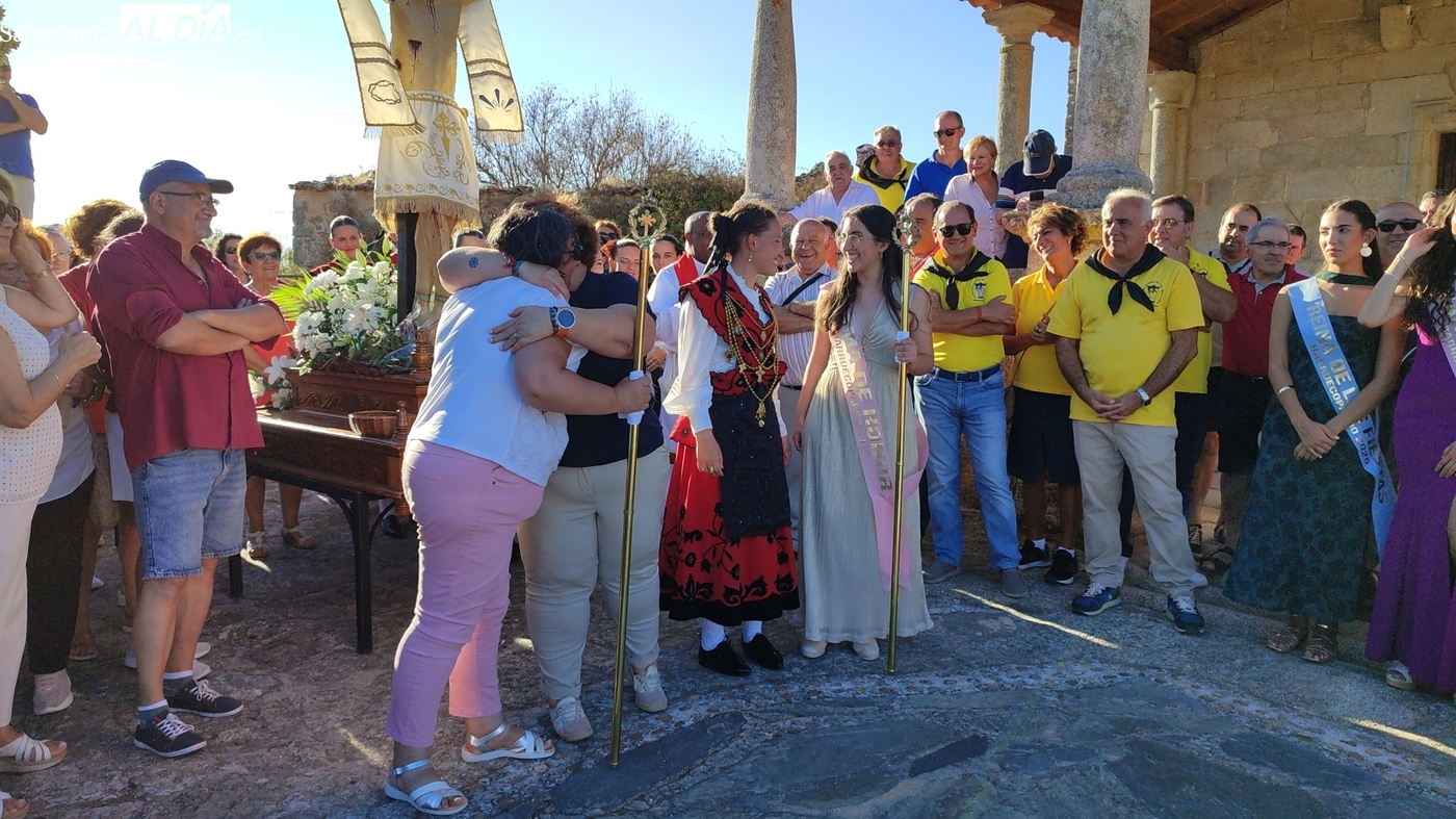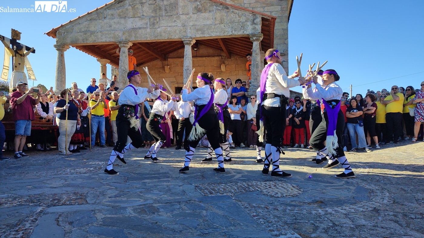 Una vez a las puertas de la ermita, comenzaba el ofertorio para continuar con el baile de la bandera interpretado con la gaita y el tamboril por Leonardo Alburquerque. Finalizada esta ancestral danza llegaba el turno del grupo de paleos con tres interpretaciones de este tipo de danza y que finalizaban con un caluroso aplauso del público congregado en torno a la ermita. Seguidamente tendría lugar el cambio de varas a favor de las nuevas mayordomas, que lo serán por un año Maricruz Vicente y Sonsoles Santamaría.
