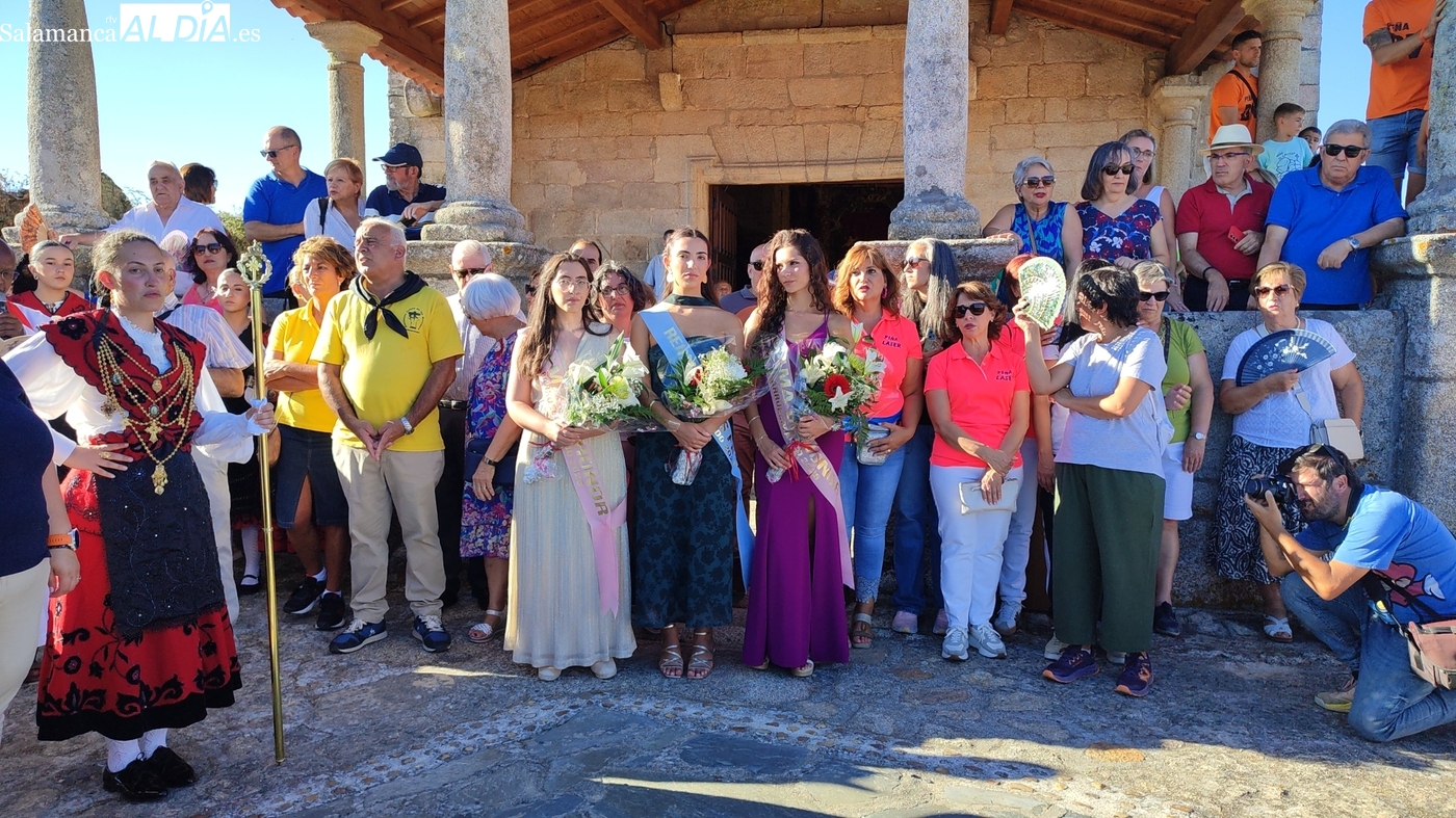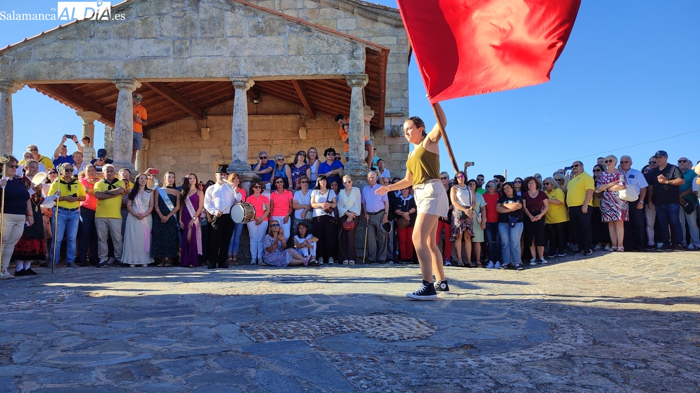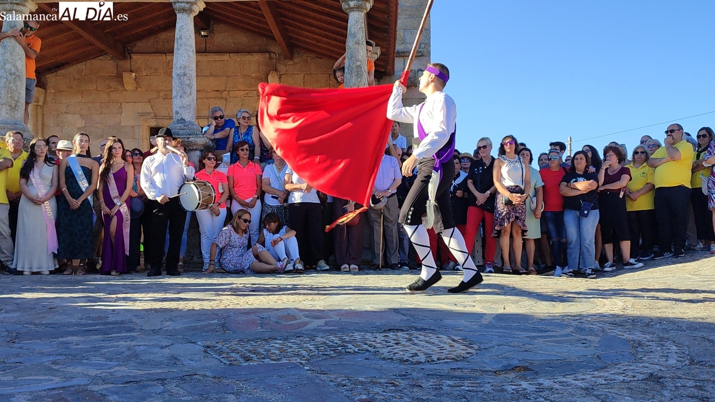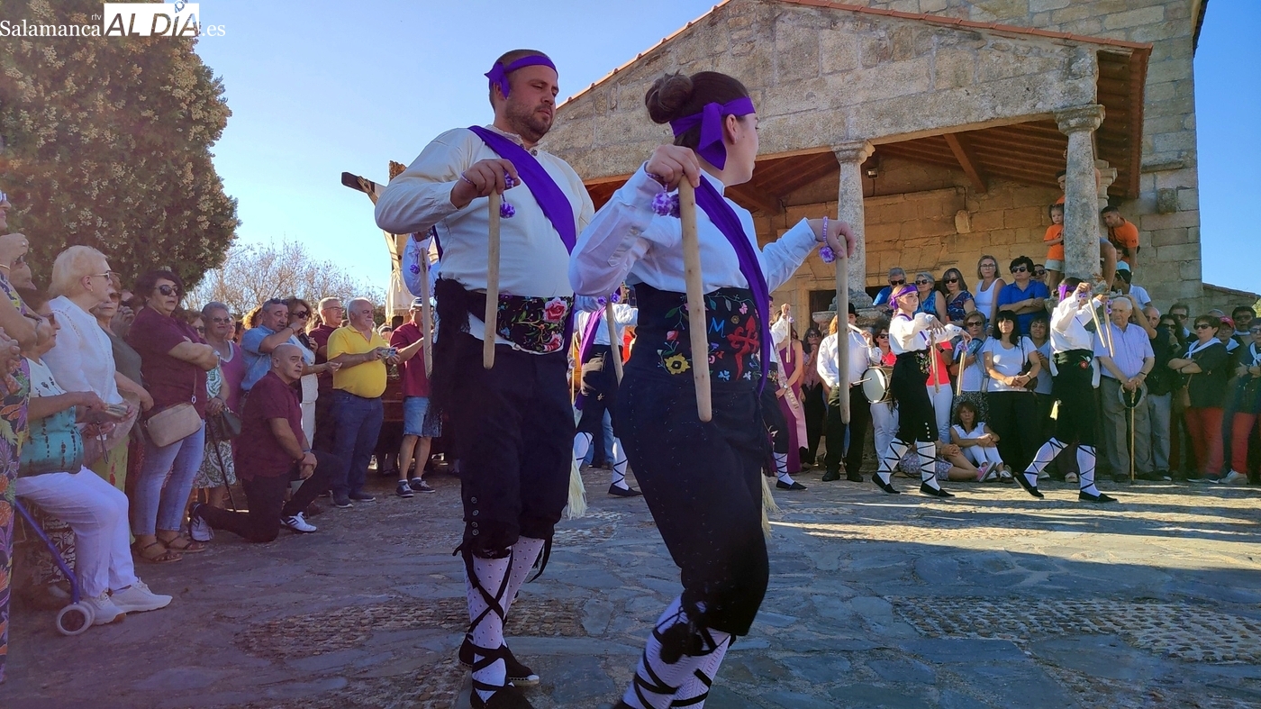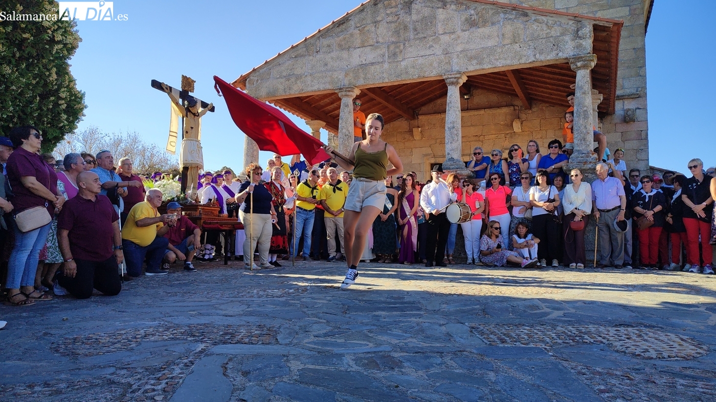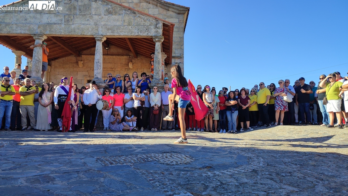 Una vez a las puertas de la ermita, comenzaba el ofertorio para continuar con el baile de la bandera interpretado con la gaita y el tamboril por Leonardo Alburquerque. Finalizada esta ancestral danza llegaba el turno del grupo de paleos con tres interpretaciones de este tipo de danza y que finalizaban con un caluroso aplauso del público congregado en torno a la ermita. Seguidamente tendría lugar el cambio de varas a favor de las nuevas mayordomas, que lo serán por un año Maricruz Vicente y Sonsoles Santamaría.