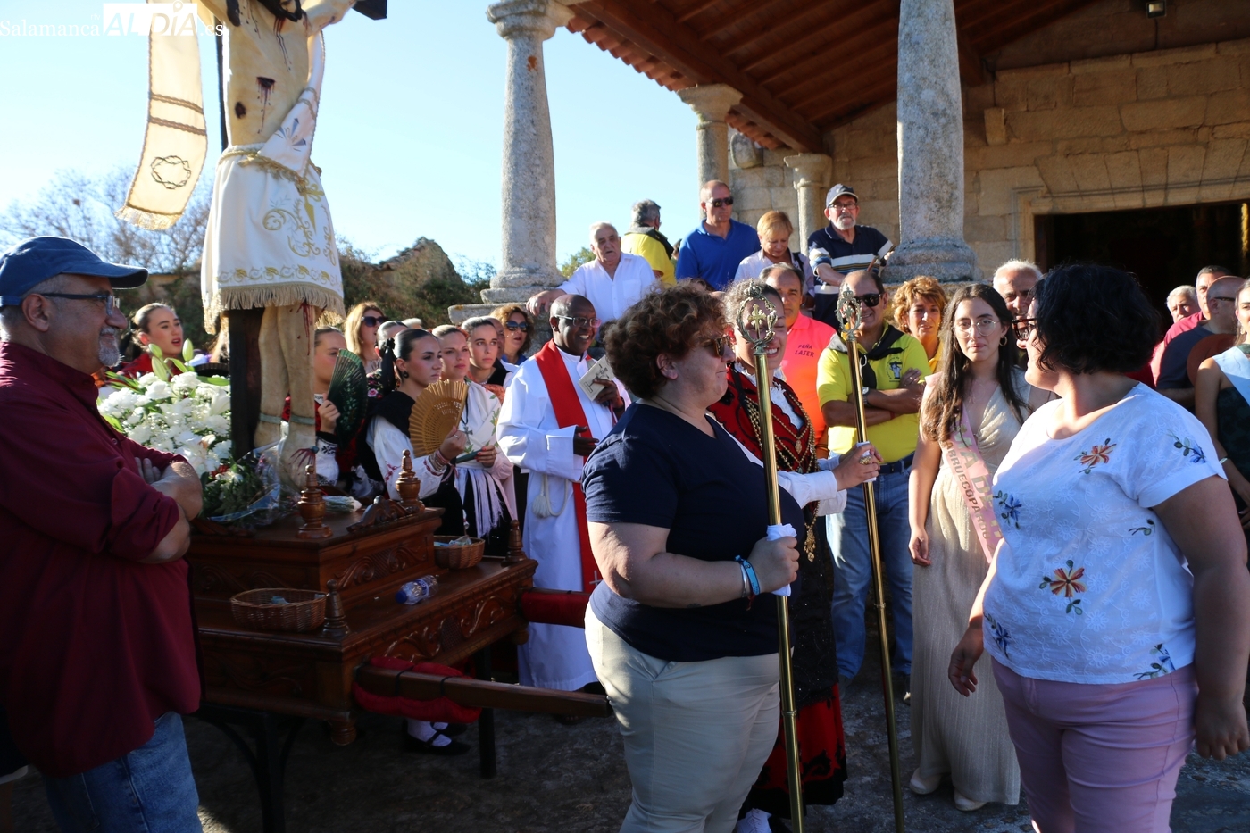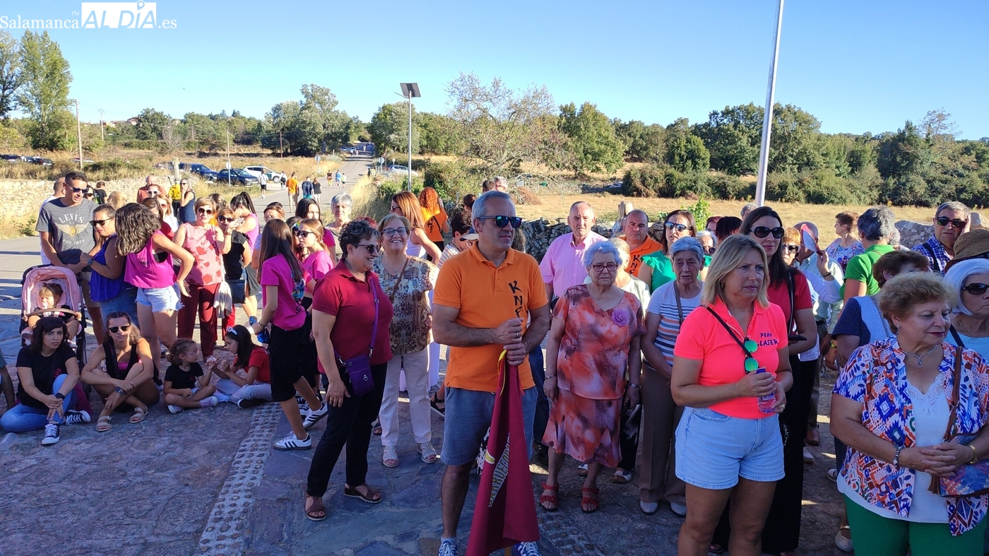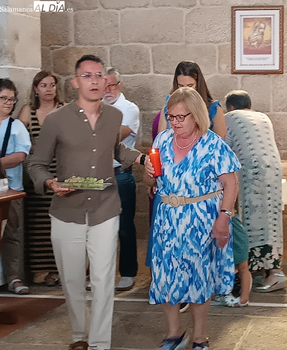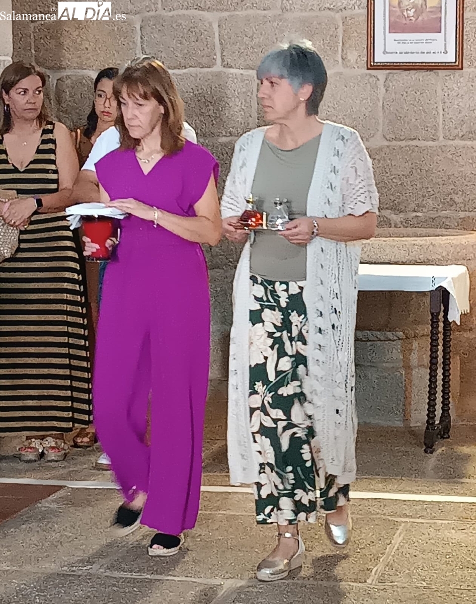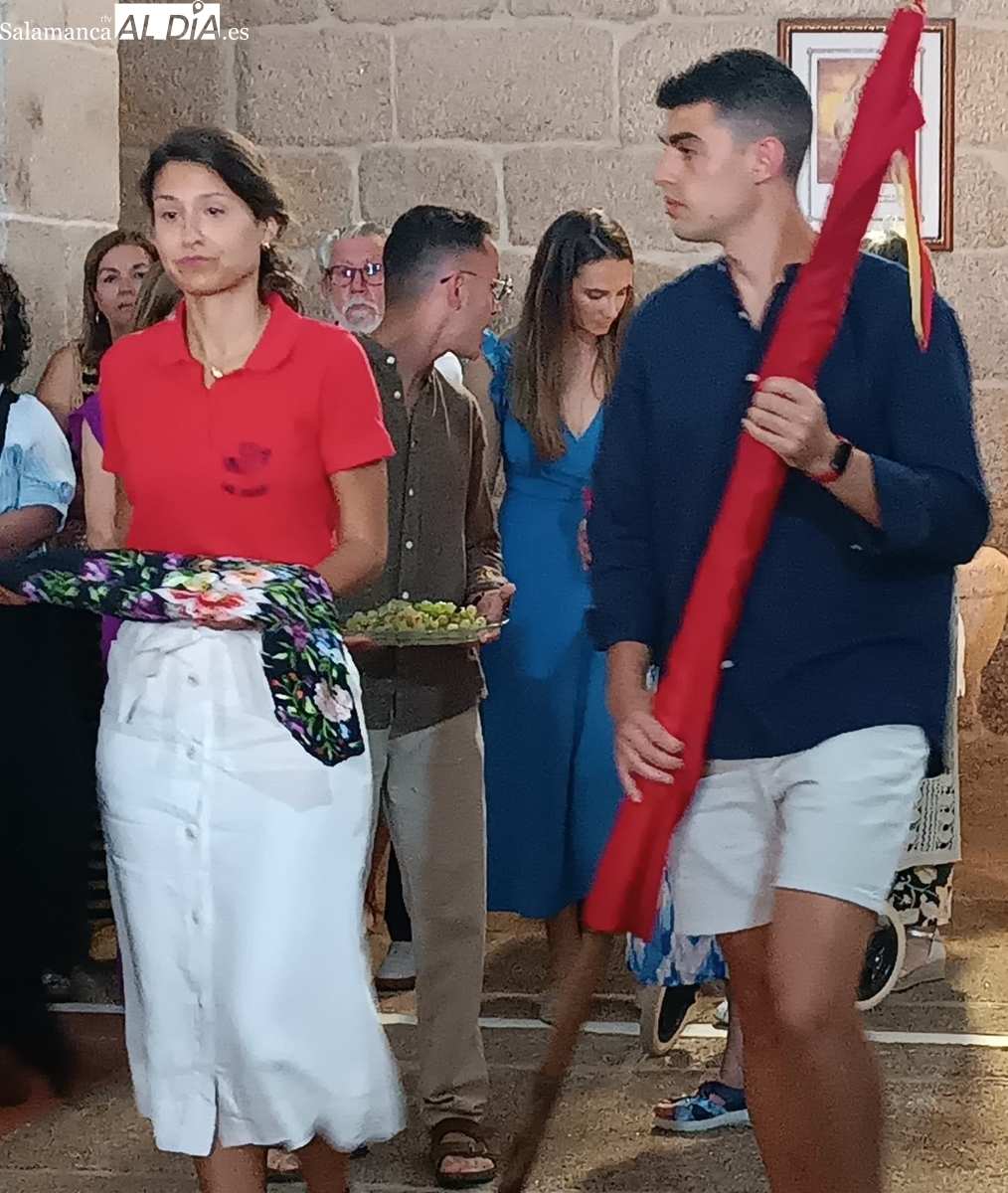 Una vez a las puertas de la ermita, comenzaba el ofertorio para continuar con el baile de la bandera interpretado con la gaita y el tamboril por Leonardo Alburquerque. Finalizada esta ancestral danza llegaba el turno del grupo de paleos con tres interpretaciones de este tipo de danza y que finalizaban con un caluroso aplauso del público congregado en torno a la ermita. Seguidamente tendría lugar el cambio de varas a favor de las nuevas mayordomas, que lo serán por un año Maricruz Vicente y Sonsoles Santamaría.