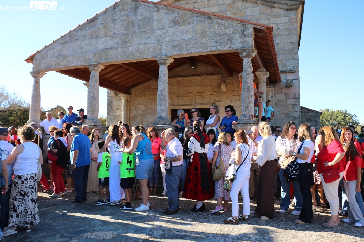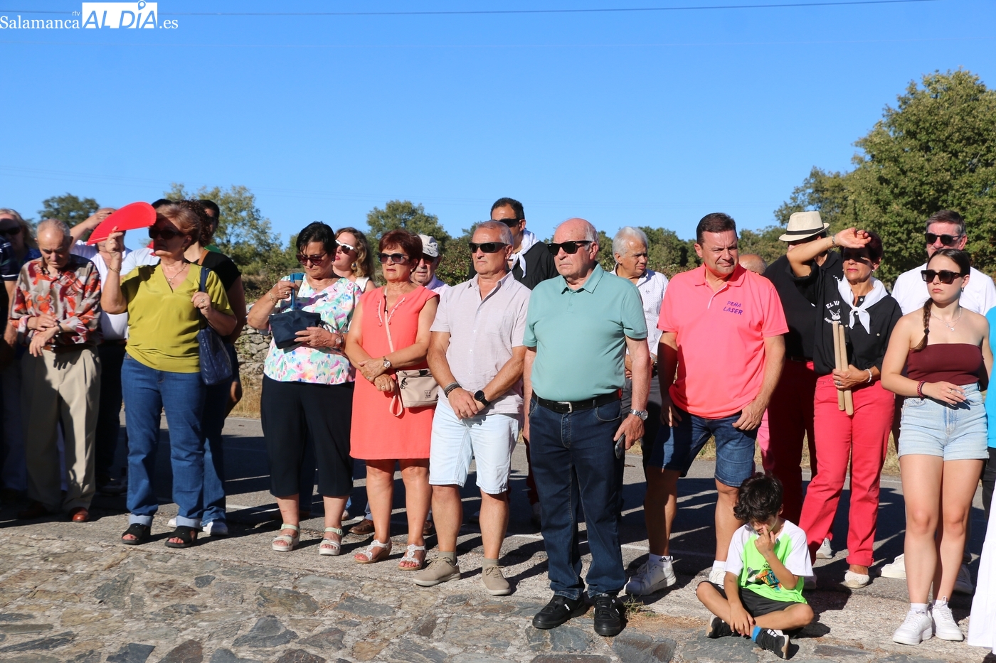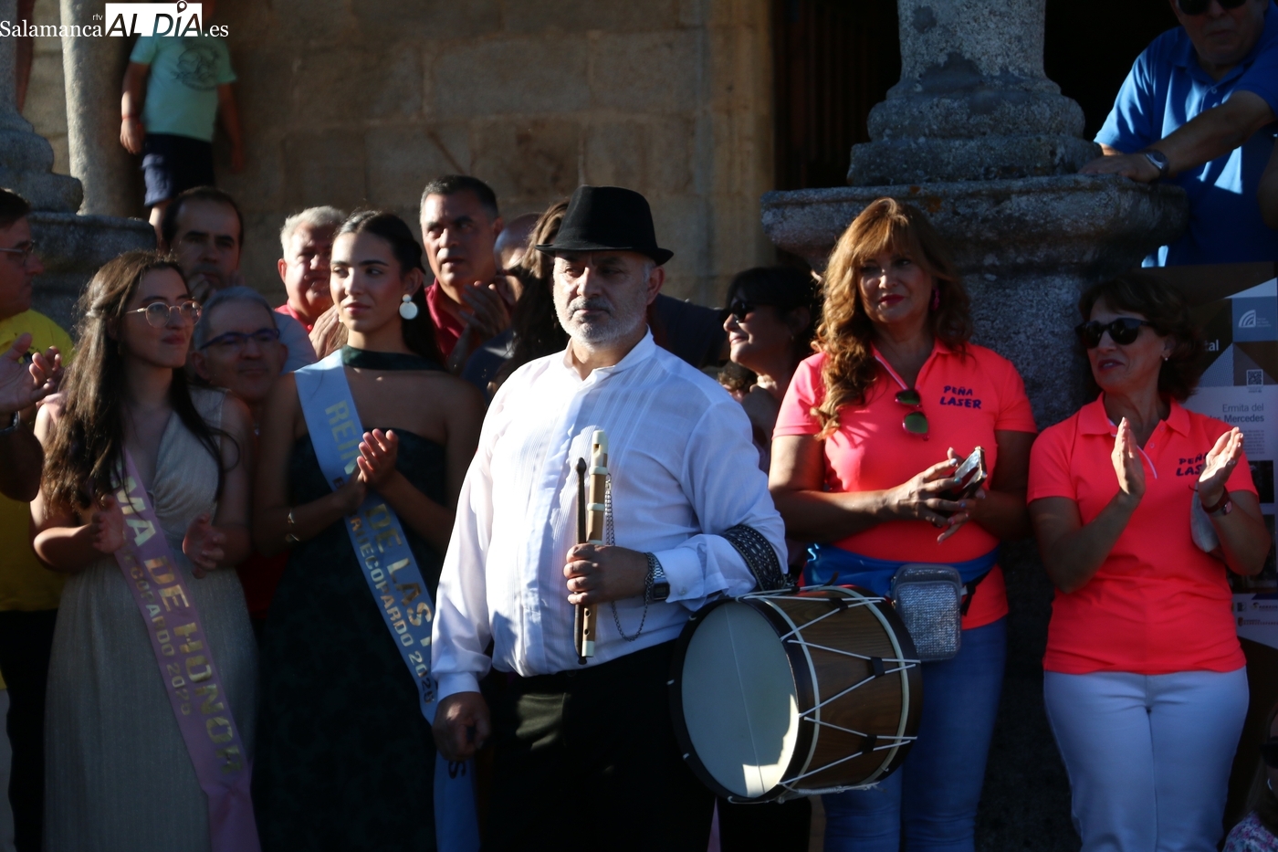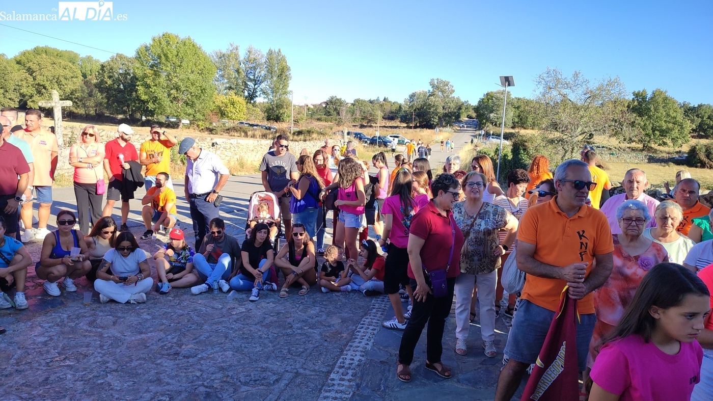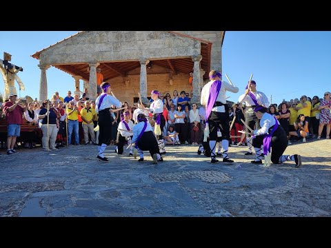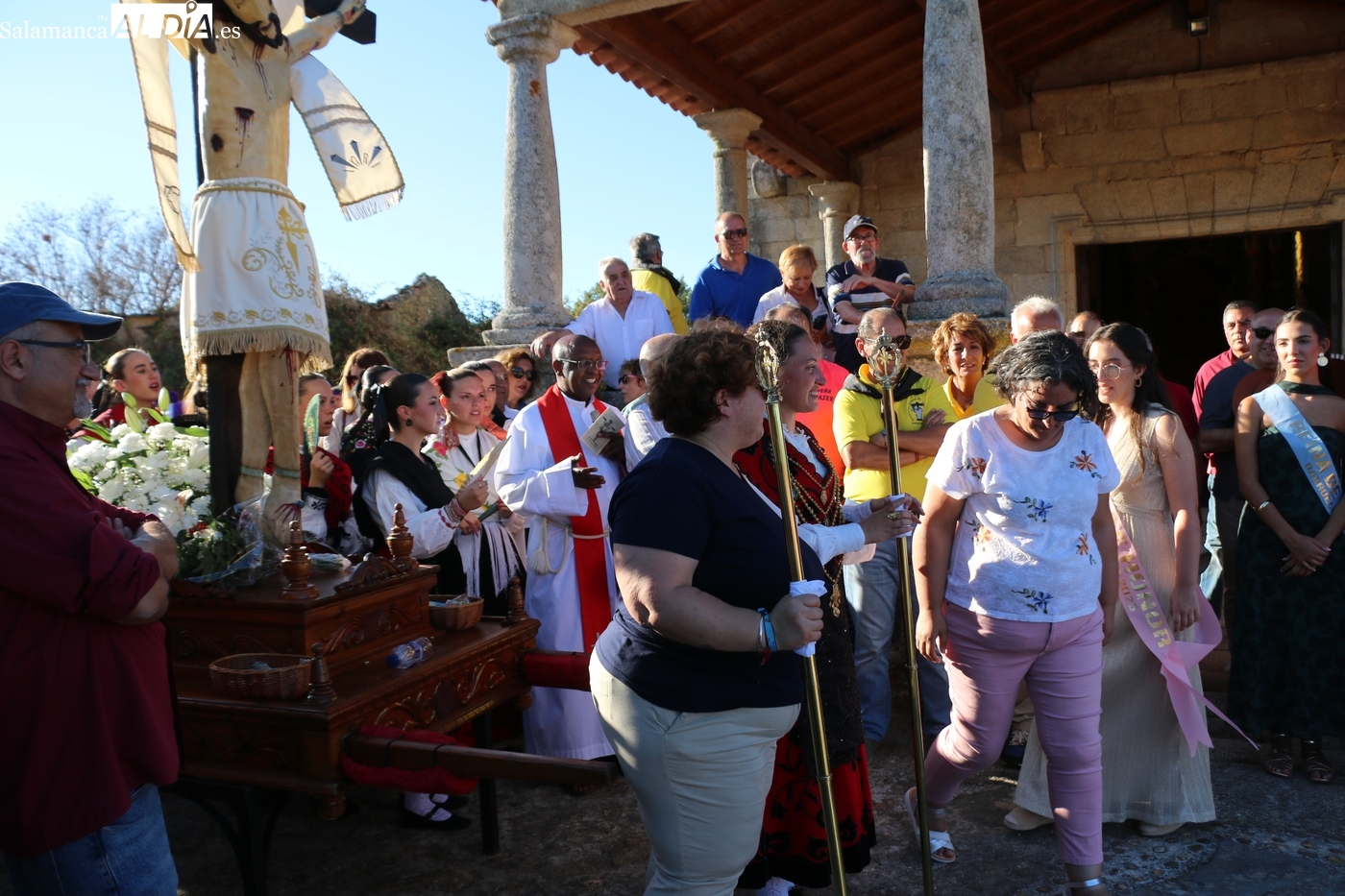 Una vez a las puertas de la ermita, comenzaba el ofertorio para continuar con el baile de la bandera interpretado con la gaita y el tamboril por Leonardo Alburquerque. Finalizada esta ancestral danza llegaba el turno del grupo de paleos con tres interpretaciones de este tipo de danza y que finalizaban con un caluroso aplauso del público congregado en torno a la ermita. Seguidamente tendría lugar el cambio de varas a favor de las nuevas mayordomas, que lo serán por un año Maricruz Vicente y Sonsoles Santamaría.