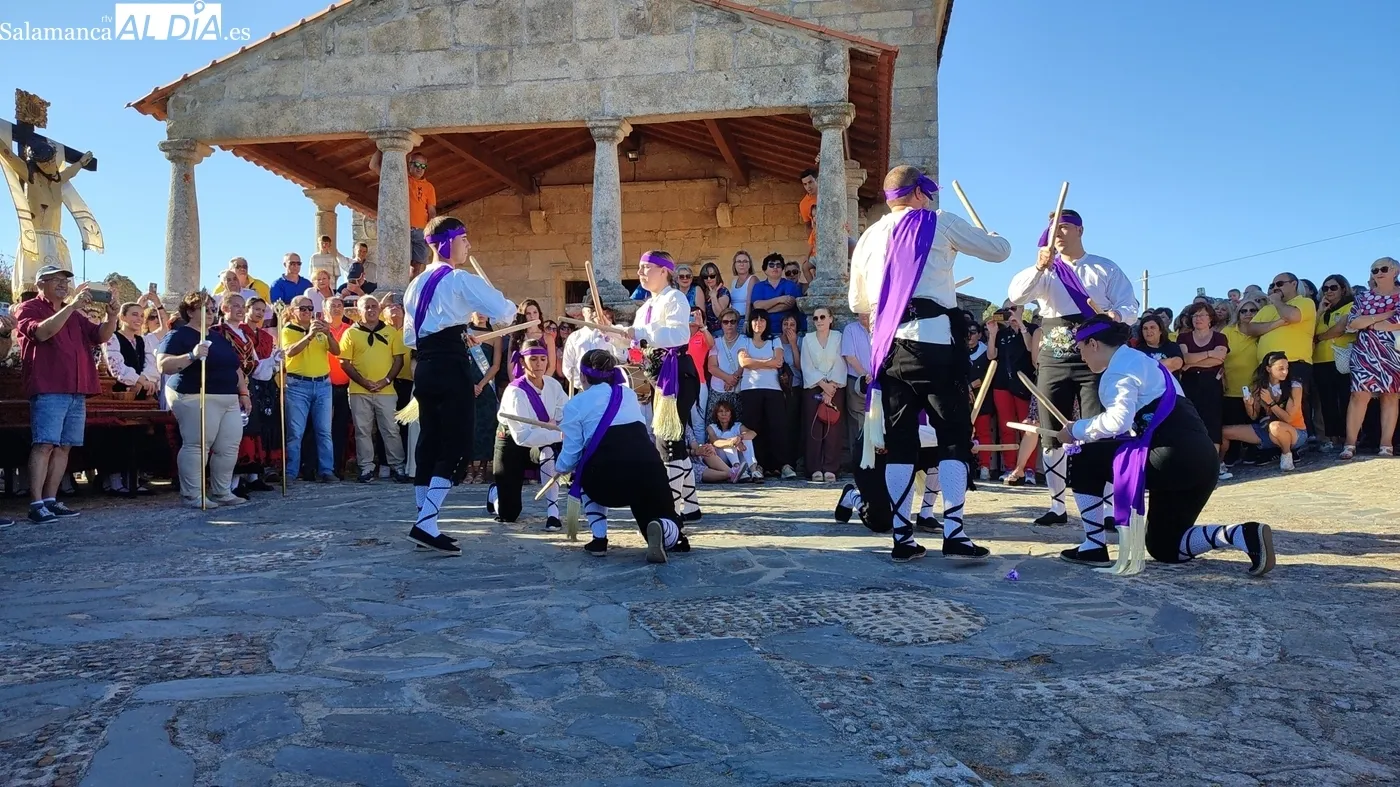 Una vez a las puertas de la ermita, comenzaba el ofertorio para continuar con el baile de la bandera interpretado con la gaita y el tamboril por Leonardo Alburquerque. Finalizada esta ancestral danza llegaba el turno del grupo de paleos con tres interpretaciones de este tipo de danza y que finalizaban con un caluroso aplauso del público congregado en torno a la ermita. Seguidamente tendría lugar el cambio de varas a favor de las nuevas mayordomas, que lo serán por un año Maricruz Vicente y Sonsoles Santamaría.