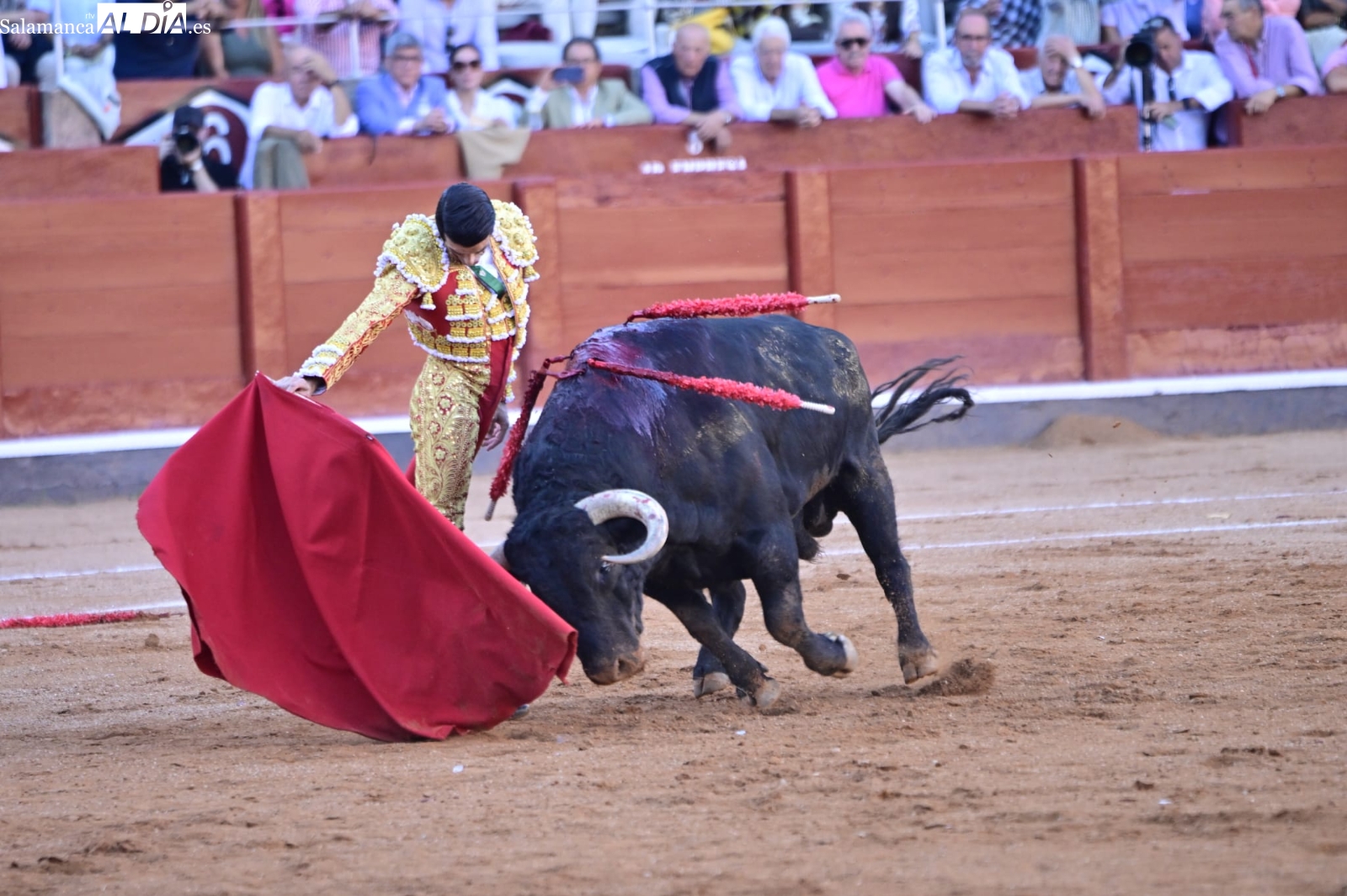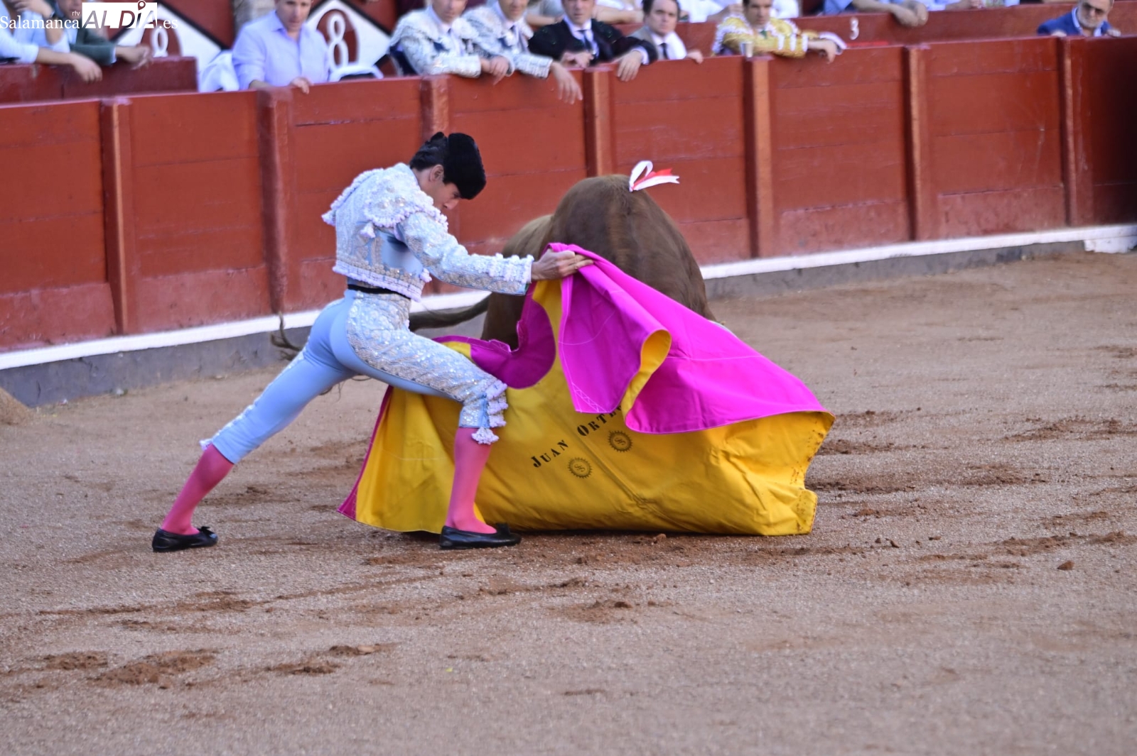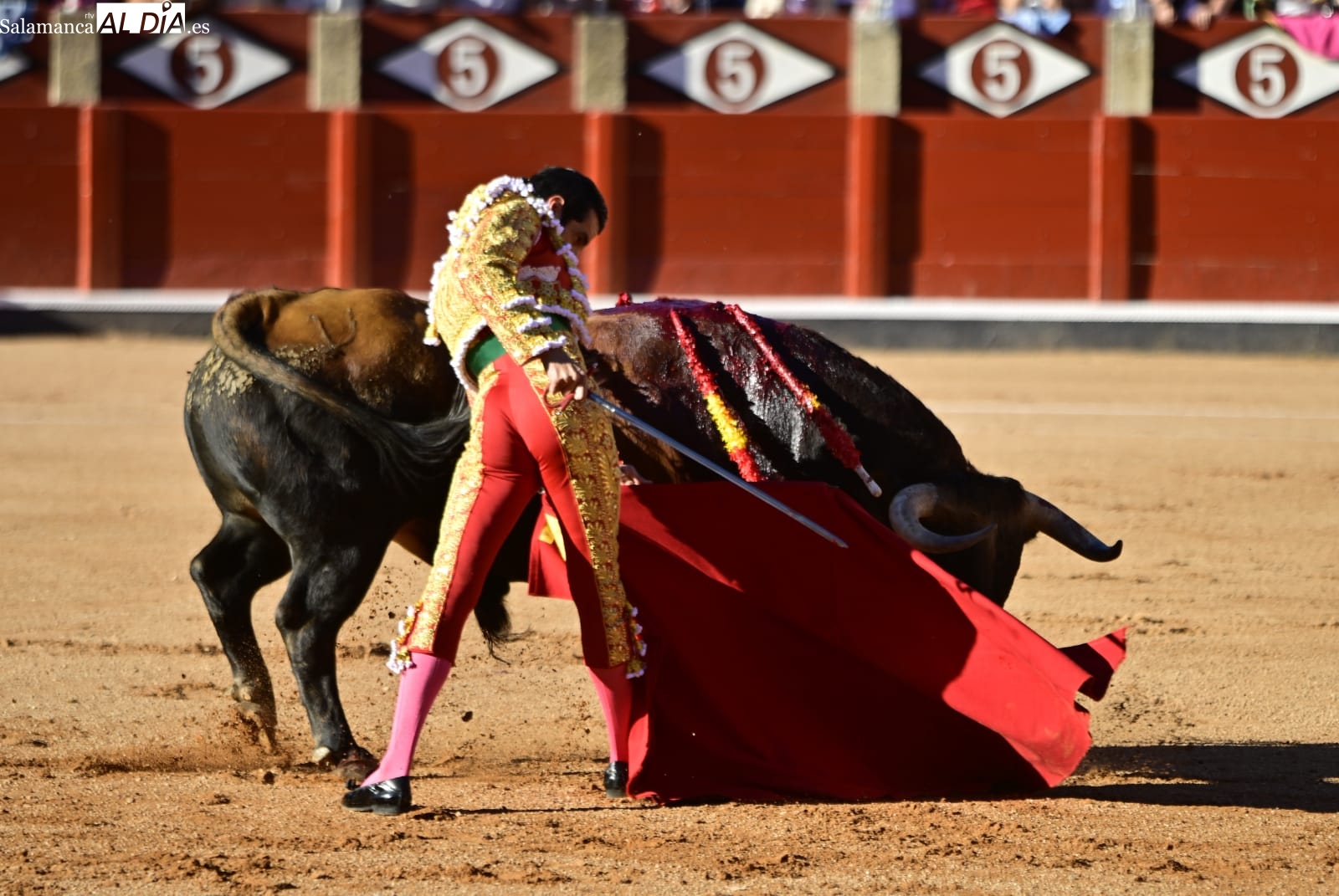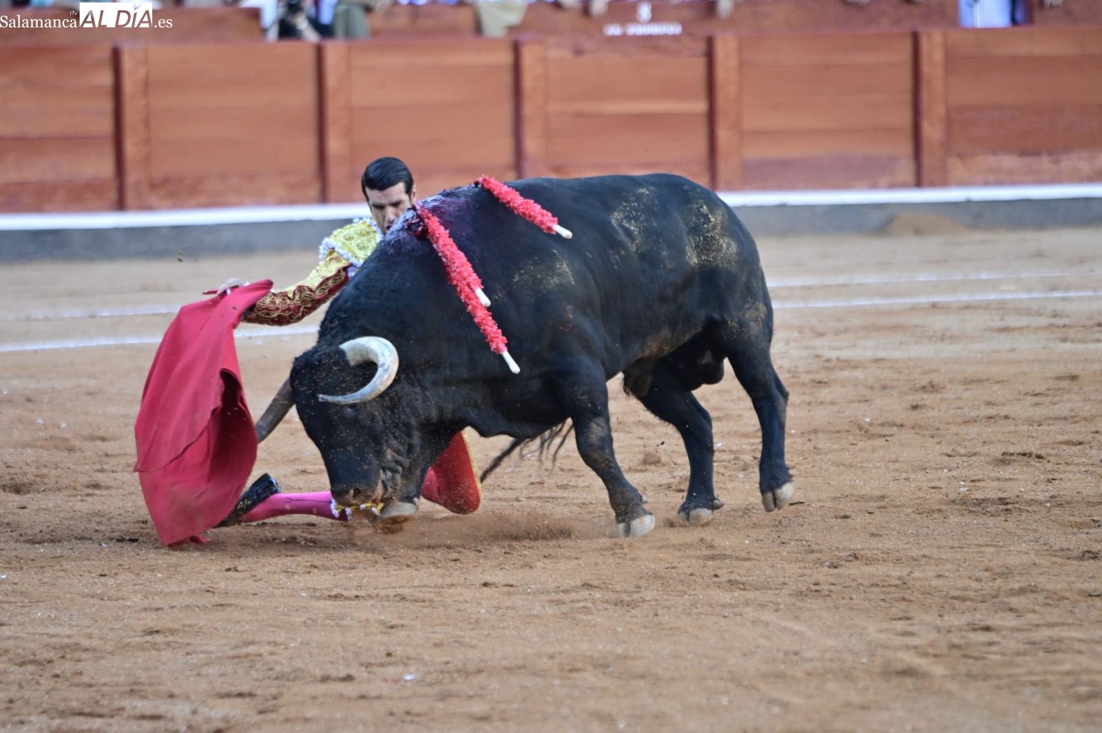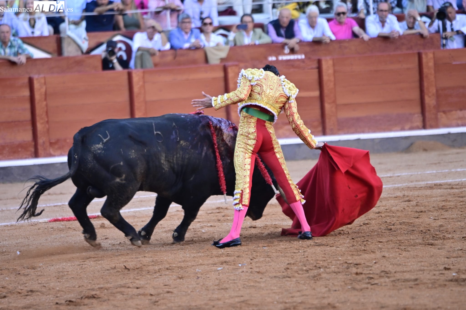 Ese fue el momento álgido de la función. El otro fue la faena de Juan Ortega al segundo de la tarde. Una obra delicada y primorosa frente a una embestida de dulce. Paró el tiempo el trianero en varios muletazos, sobre todo al natural, frente a un 'Afrutado' que fue el toro ideal para Ortega. El inicio de faena, que será recordado durante tiempo, comenzó con la muleta plegada, para dibujar un molinete y seguir toreando con ayudados por abajo antes de un cambio de mano delicatessen. Oreja de peso en su presentación en Salamanca. Frente al quinto dejó detalles en una faena demasiado larga frente al peor del envío de Garcigrande en la que intentó hacer todo siempre con verdad y muy despacio.