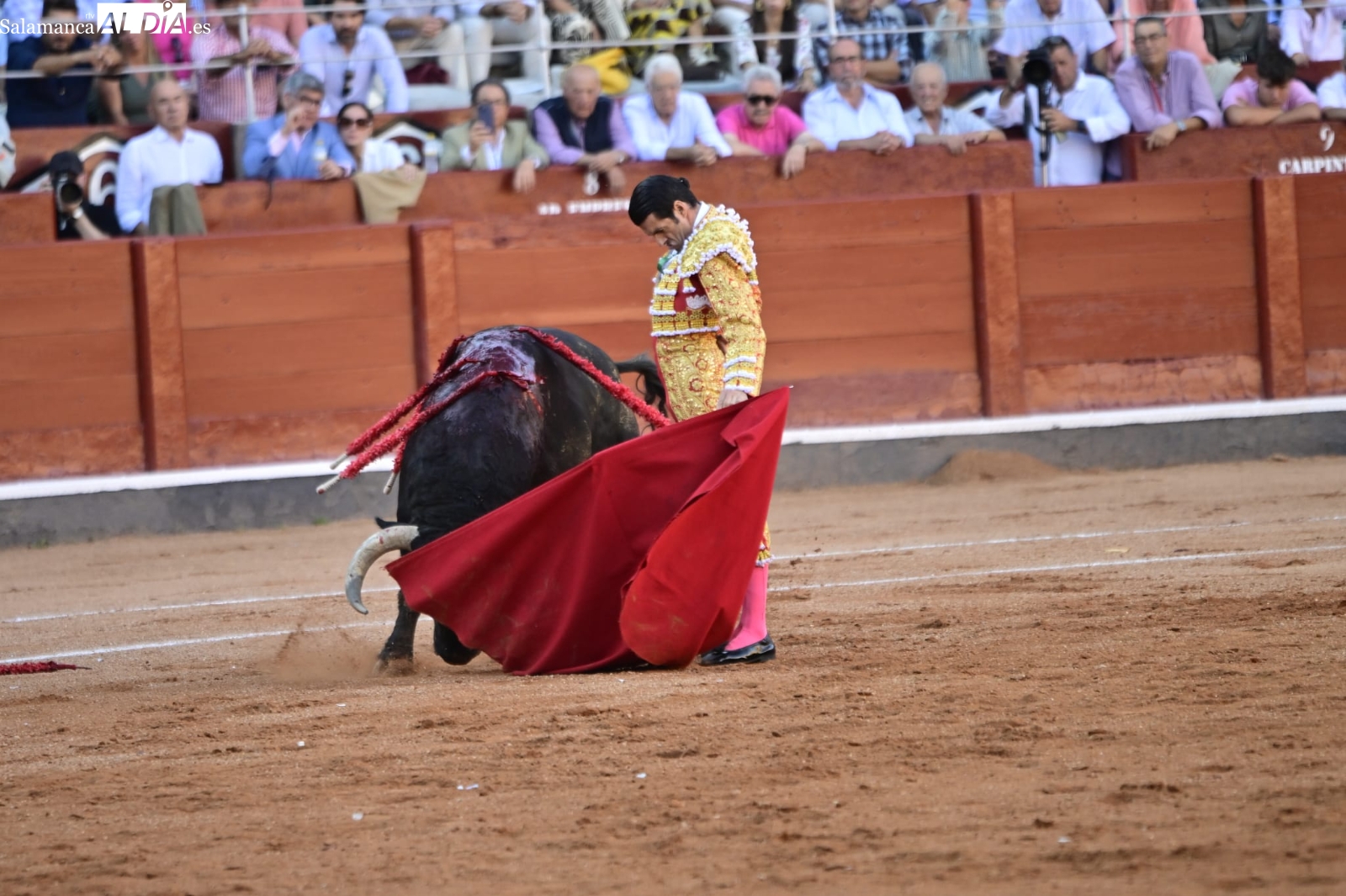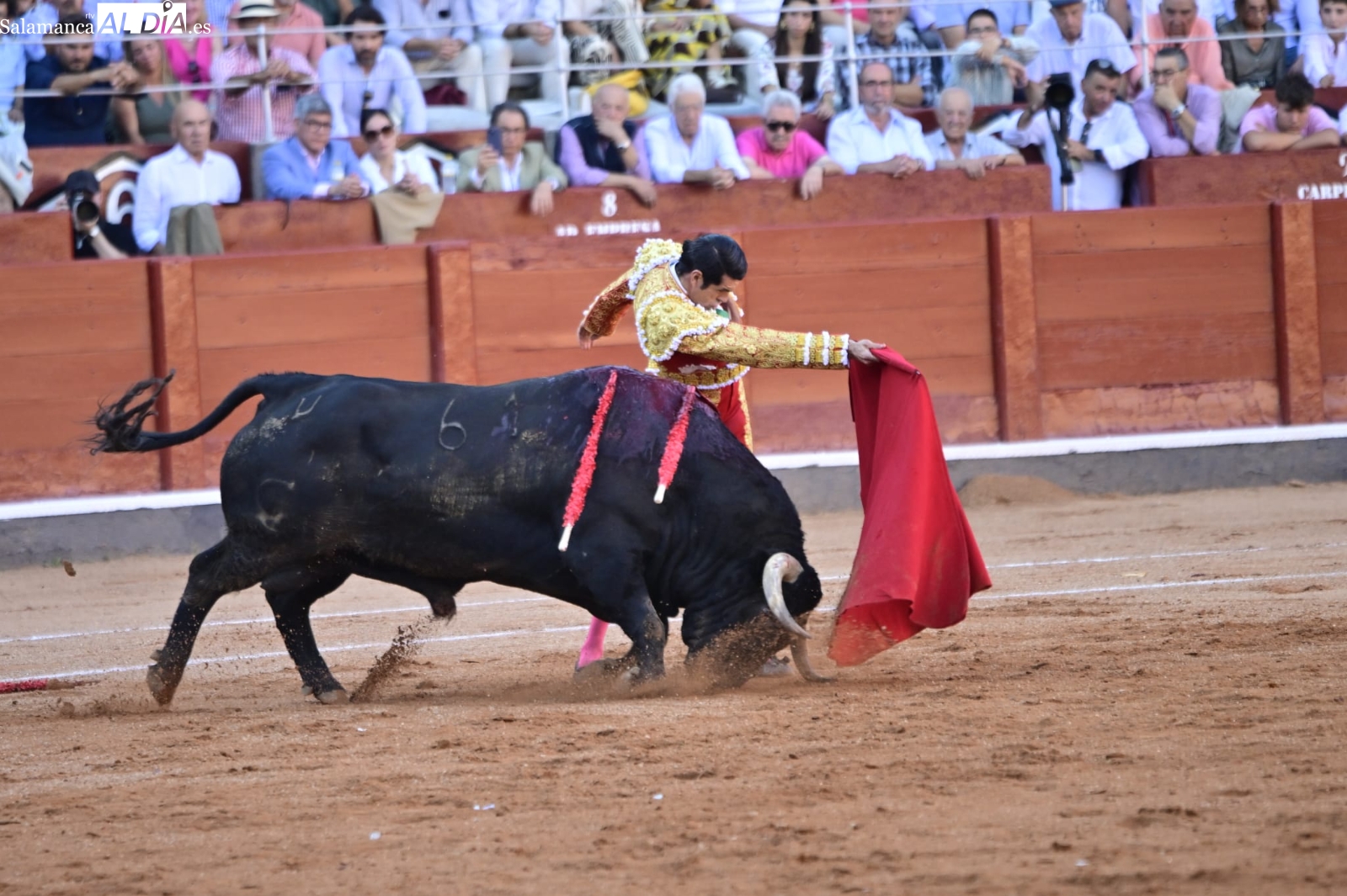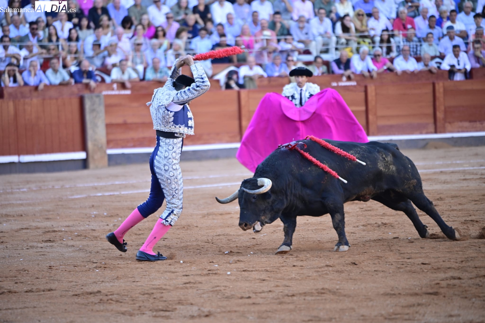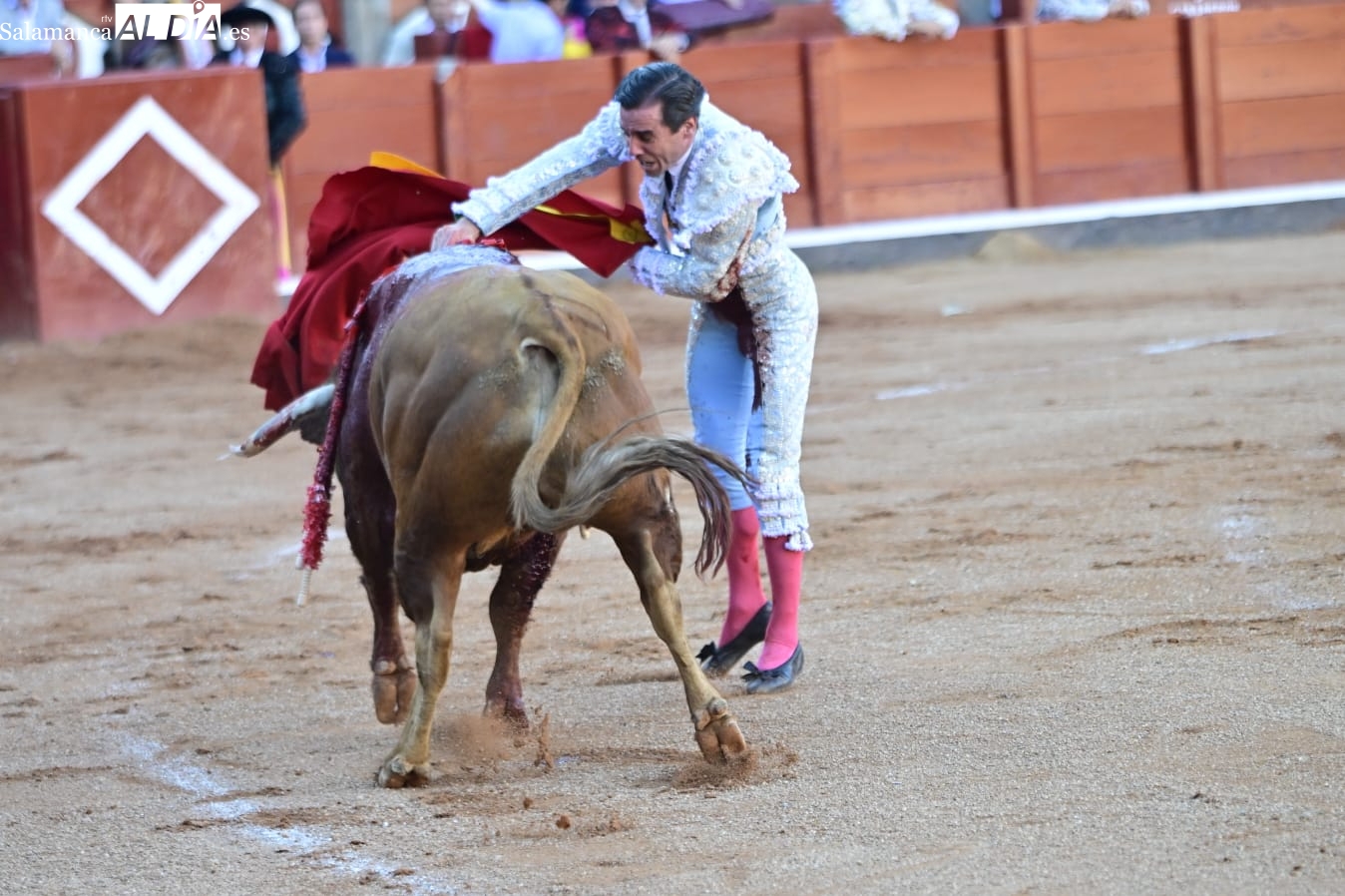 Ese fue el momento álgido de la función. El otro fue la faena de Juan Ortega al segundo de la tarde. Una obra delicada y primorosa frente a una embestida de dulce. Paró el tiempo el trianero en varios muletazos, sobre todo al natural, frente a un 'Afrutado' que fue el toro ideal para Ortega. El inicio de faena, que será recordado durante tiempo, comenzó con la muleta plegada, para dibujar un molinete y seguir toreando con ayudados por abajo antes de un cambio de mano delicatessen. Oreja de peso en su presentación en Salamanca. Frente al quinto dejó detalles en una faena demasiado larga frente al peor del envío de Garcigrande en la que intentó hacer todo siempre con verdad y muy despacio.