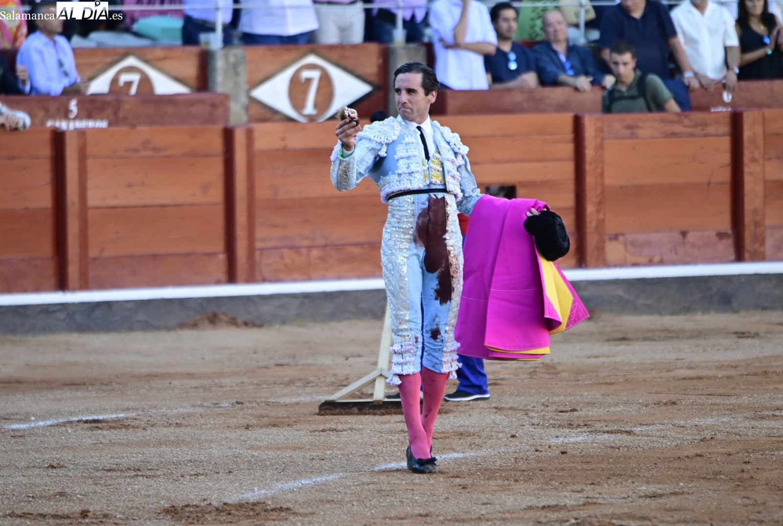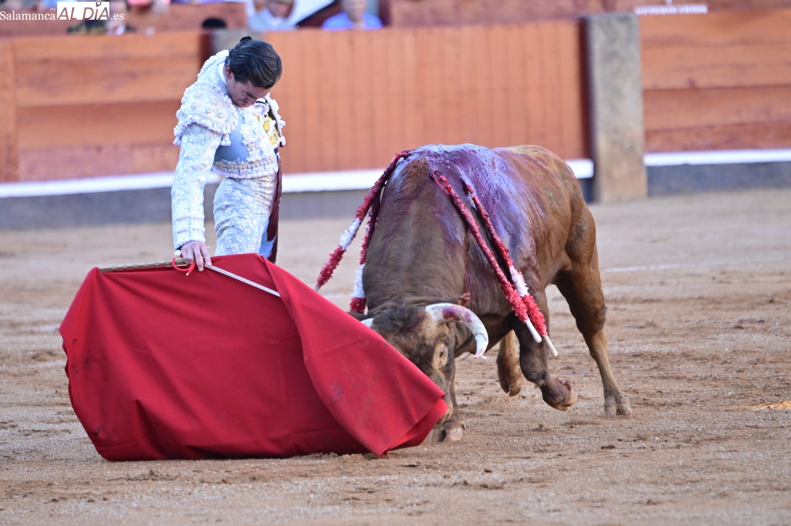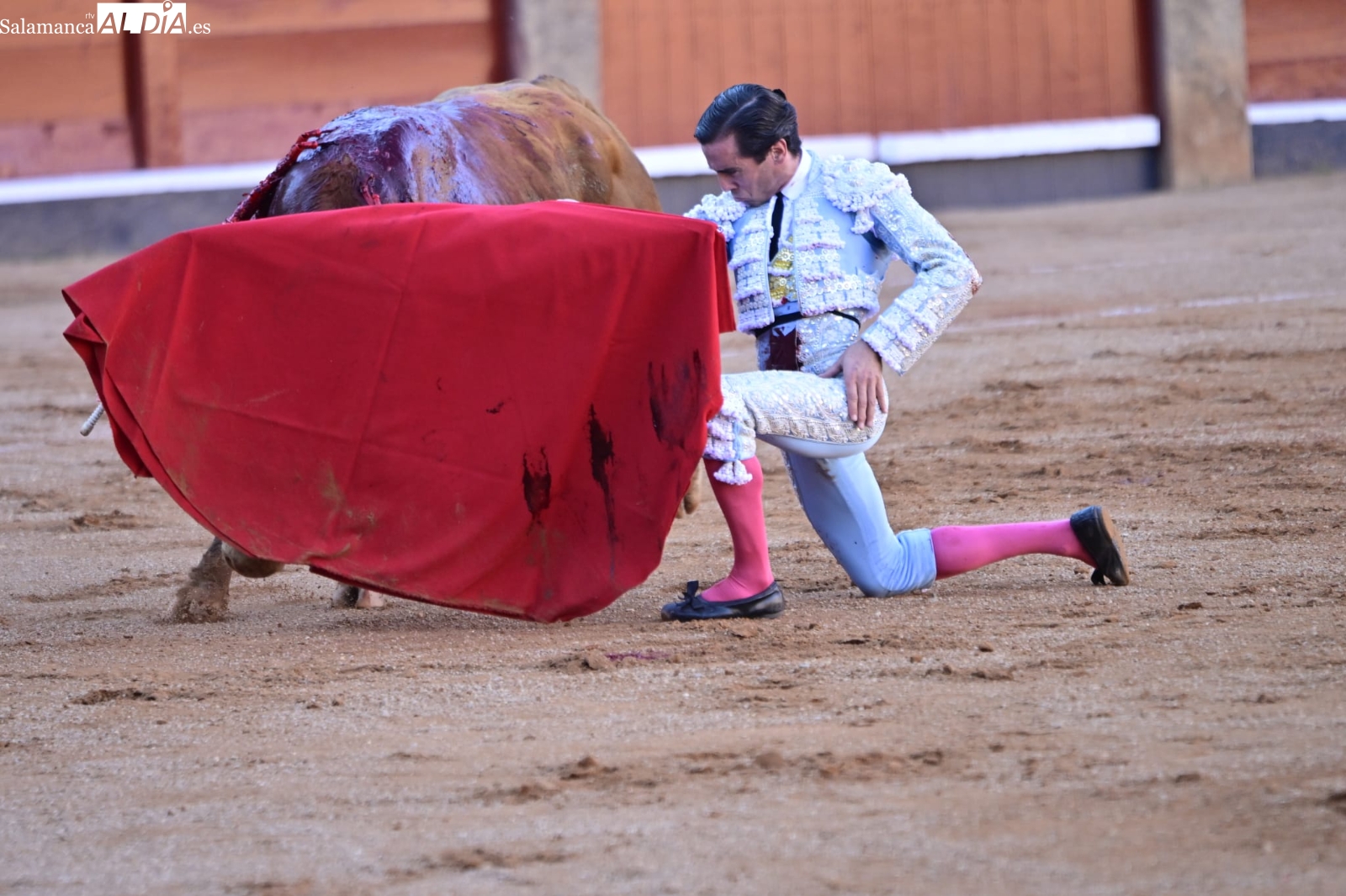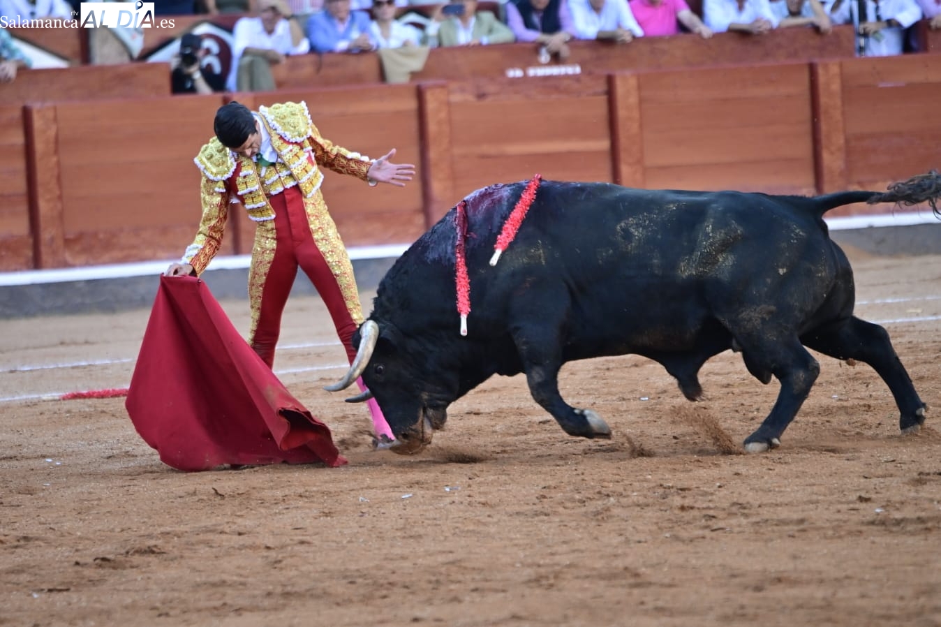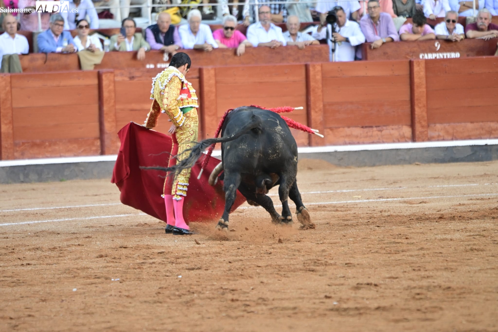 Ese fue el momento álgido de la función. El otro fue la faena de Juan Ortega al segundo de la tarde. Una obra delicada y primorosa frente a una embestida de dulce. Paró el tiempo el trianero en varios muletazos, sobre todo al natural, frente a un 'Afrutado' que fue el toro ideal para Ortega. El inicio de faena, que será recordado durante tiempo, comenzó con la muleta plegada, para dibujar un molinete y seguir toreando con ayudados por abajo antes de un cambio de mano delicatessen. Oreja de peso en su presentación en Salamanca. Frente al quinto dejó detalles en una faena demasiado larga frente al peor del envío de Garcigrande en la que intentó hacer todo siempre con verdad y muy despacio.