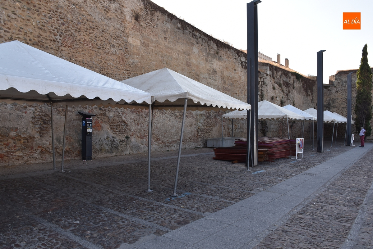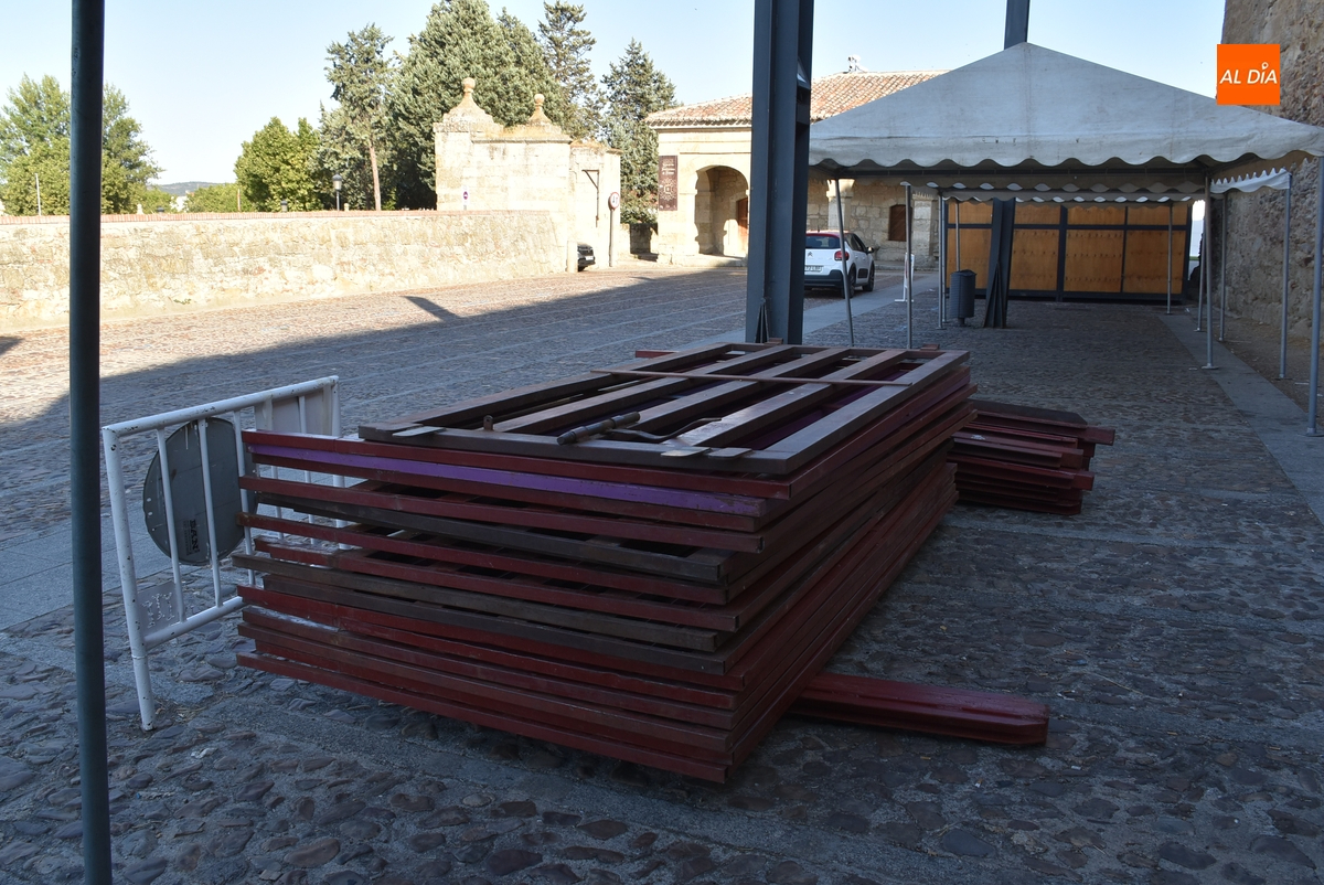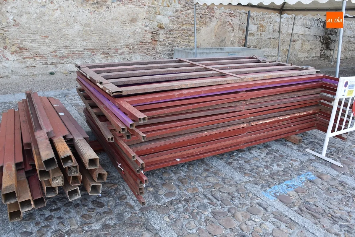 Por el momento, las agujas que han sido llevadas hasta el lugar lucen apiladas, antes de que en las próximas mañanas sean repartidas por el lateral junto a la muralla, para que los caballistas aten a sus equinos junto a unas carpas -que también se estuvieron montando-, donde estarán protegidos de las inclemencias meteorológicas.