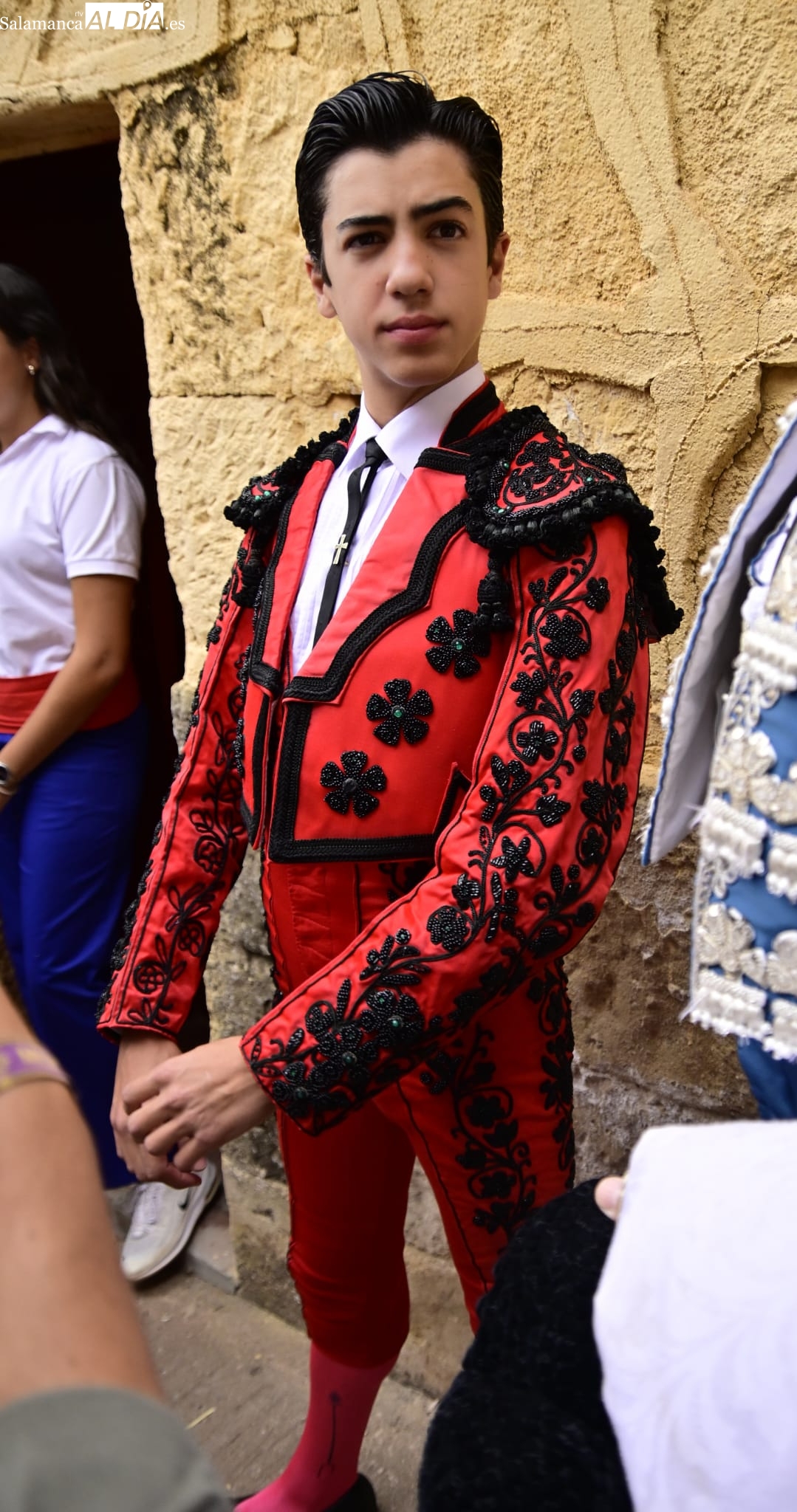 El joven salmantino ha escogido para su estreno en esta feria un histórico traje grana e hilo negro que perteneció al maestro de La Fuente de San Esteban