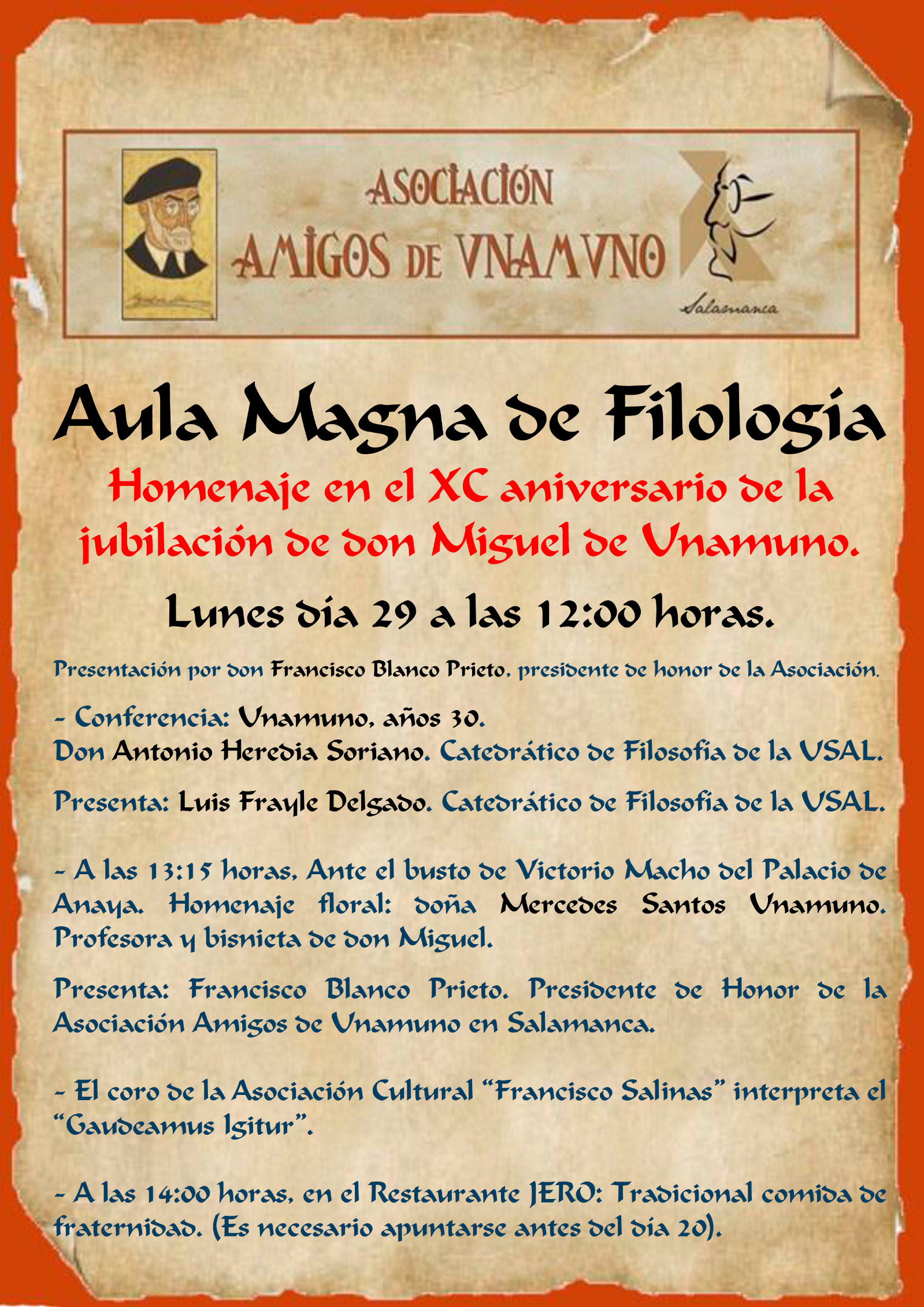 El acto central se celebrará el lunes, 29 de septiembre, en el Palacio de Anaya, sede de la Facultad de Filología. La jornada conmemorativa por el 90 aniversario de la jubilación de Unamuno se estructurará en varios momentos clave a lo largo de la mañana: