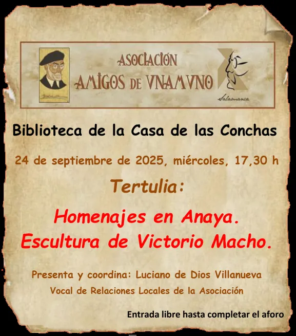 La primera cita tendrá lugar el próximo miércoles, 24 de septiembre, a las 17:30 horas. La Casa de las Conchas acogerá una tertulia centrada en el tema "Homenajes en Anaya. Escultura de Victorio Macho". El encuentro será presentado y moderado por Luciano de Dios Villanueva, Vocal de Relaciones Locales de la asociación, y servirá como antesala al homenaje principal.