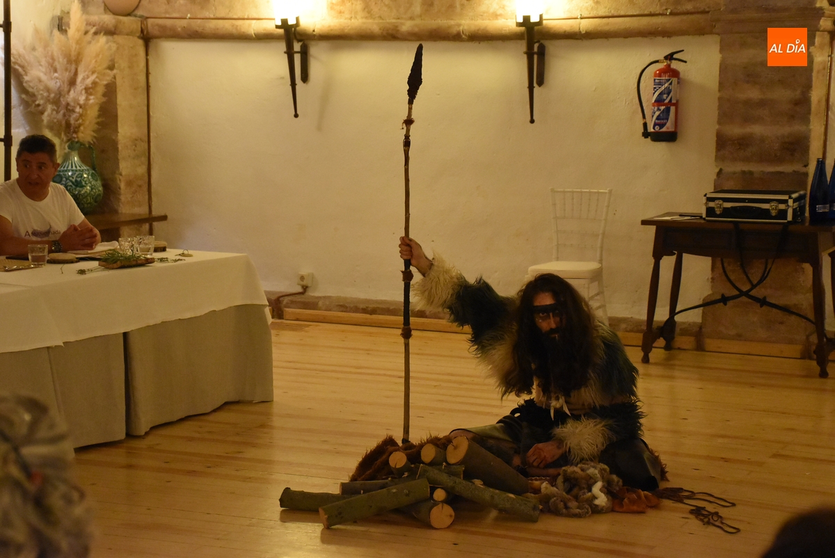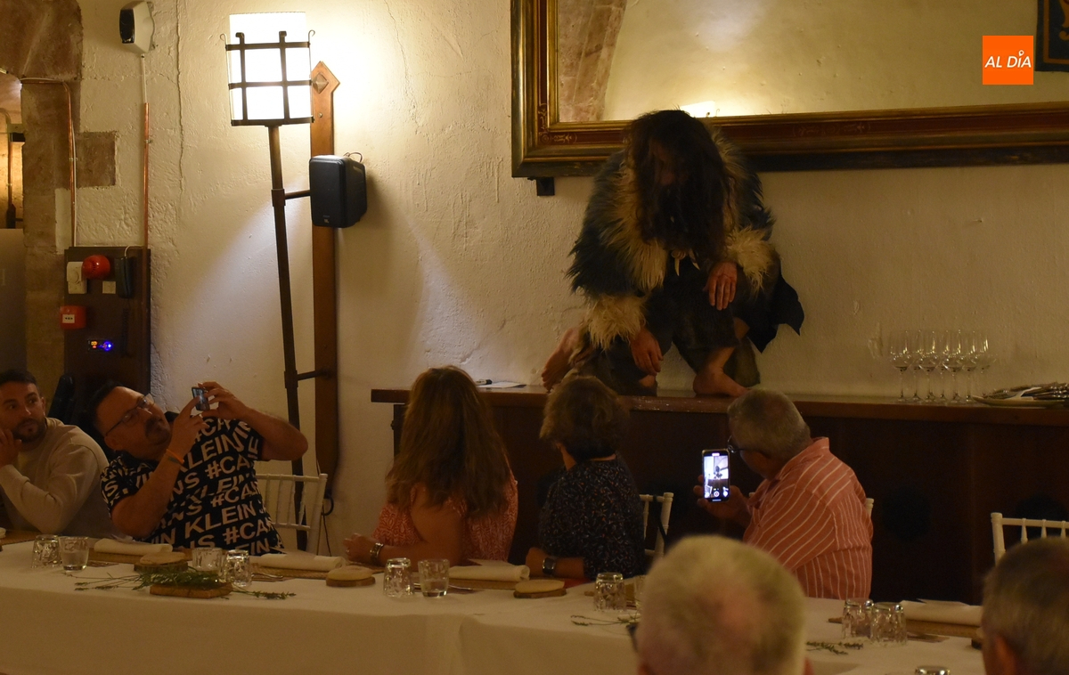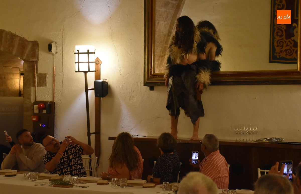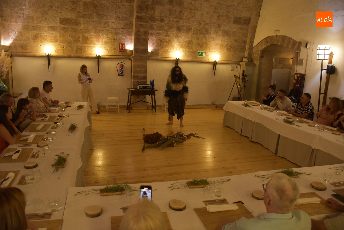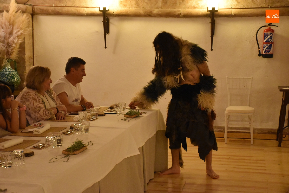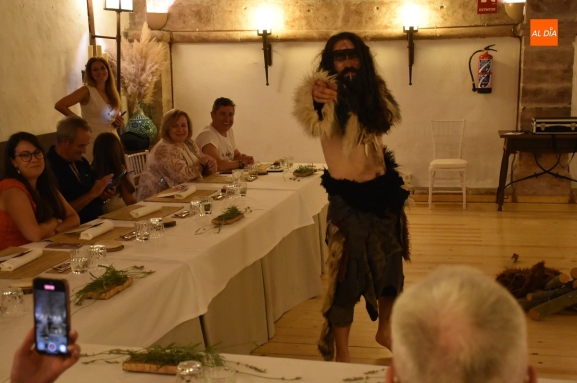 Los comensales que se animaron a probar en la noche del sábado los ‘sabores de Siega Verde’ tuvieron la compañía en el Salón Imperial de un hombre de la Prehistoria, interpretado por Sergio Cardoso, que pasó la velada alrededor de una ‘fogata’ situada en el centro de las mesas, pero fue interactuando de forma continua con los asistentes, teniendo también la oportunidad de probar algunos de los componentes del menú.