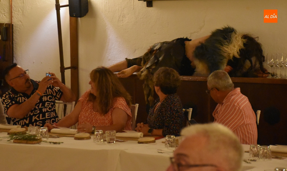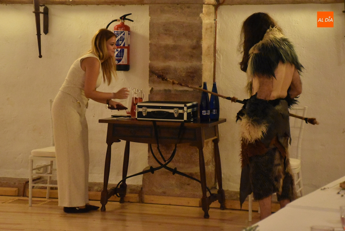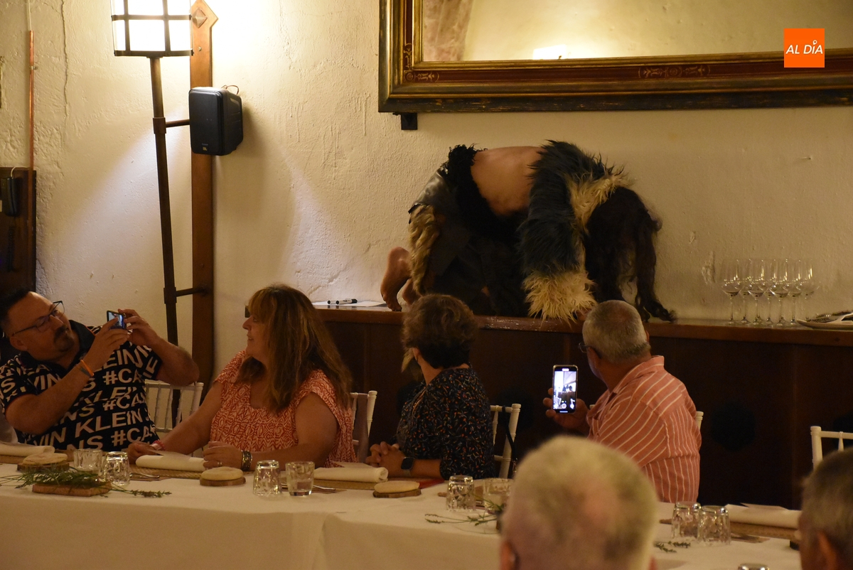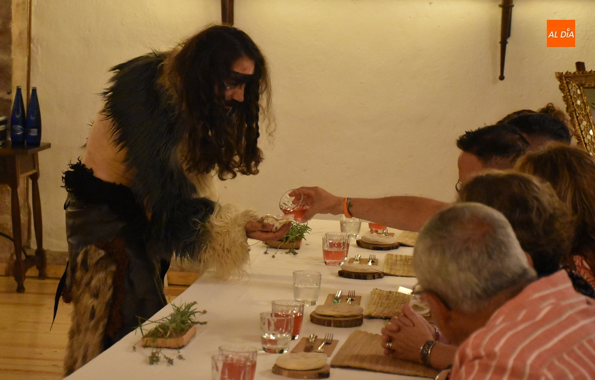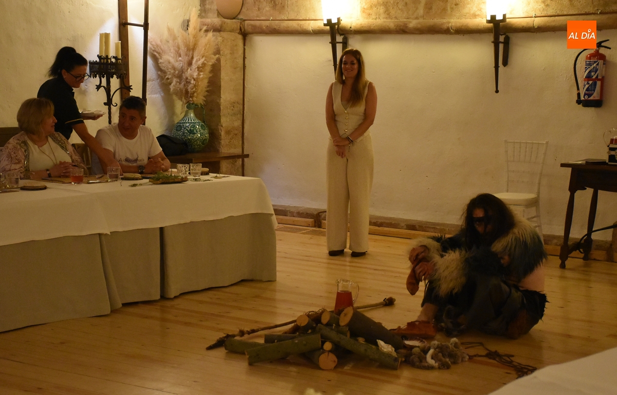 Los comensales que se animaron a probar en la noche del sábado los ‘sabores de Siega Verde’ tuvieron la compañía en el Salón Imperial de un hombre de la Prehistoria, interpretado por Sergio Cardoso, que pasó la velada alrededor de una ‘fogata’ situada en el centro de las mesas, pero fue interactuando de forma continua con los asistentes, teniendo también la oportunidad de probar algunos de los componentes del menú.