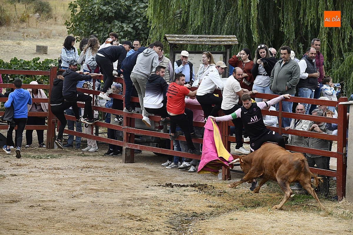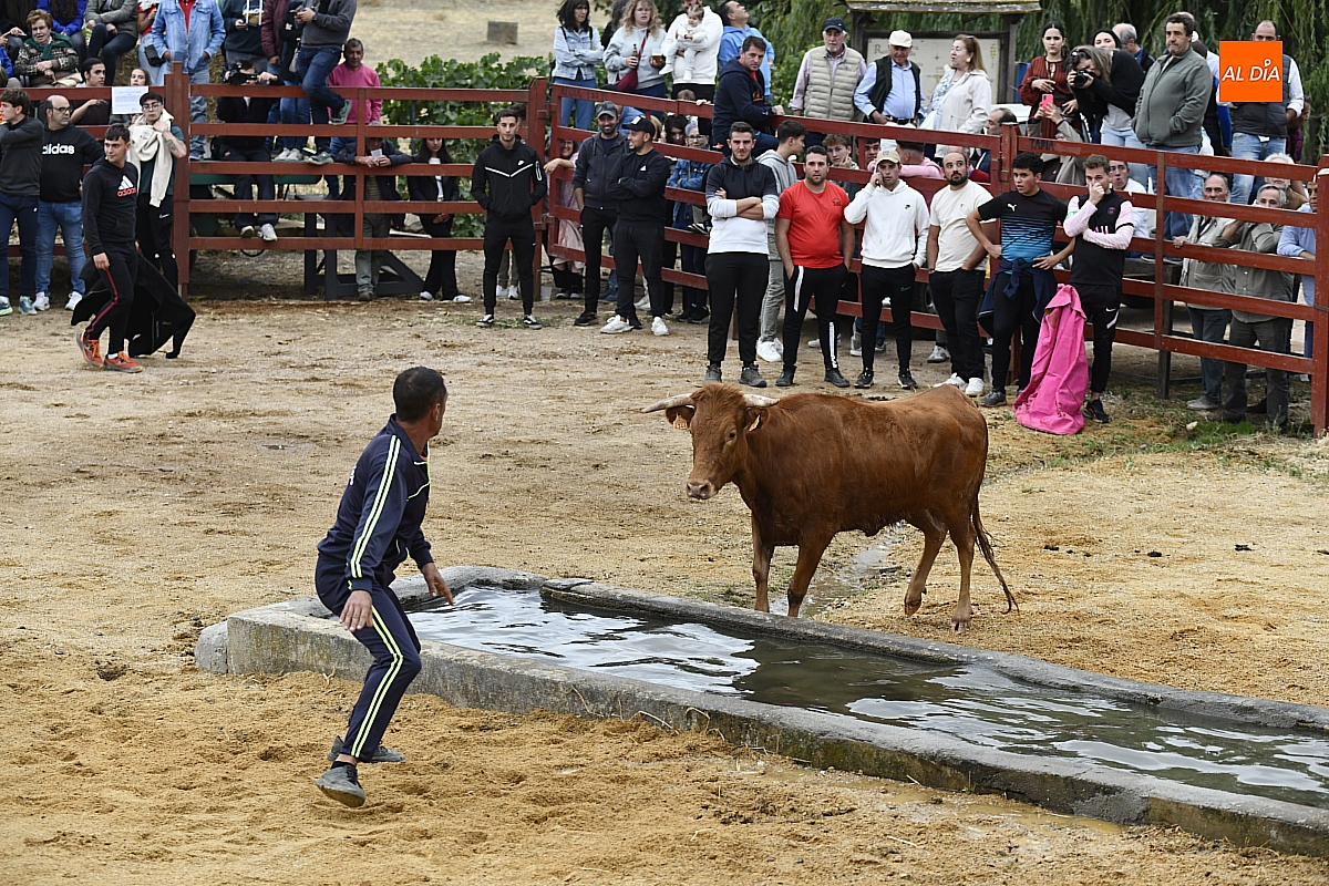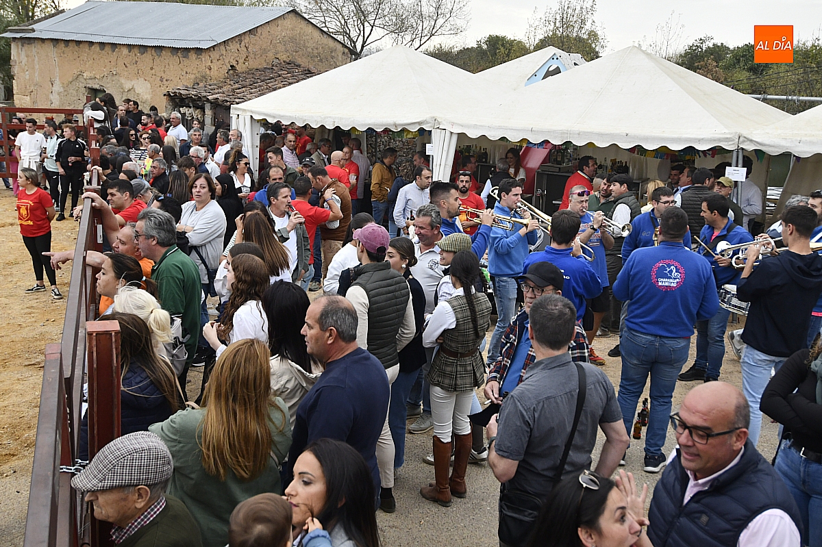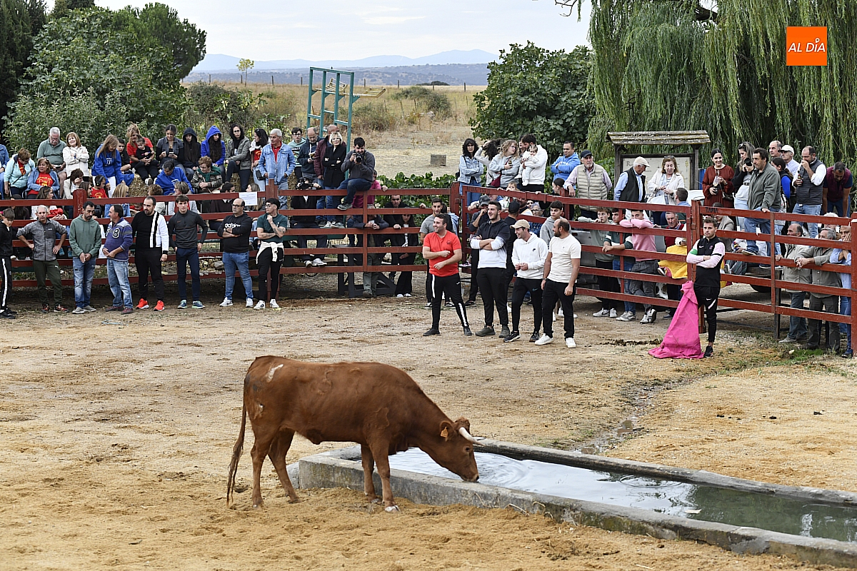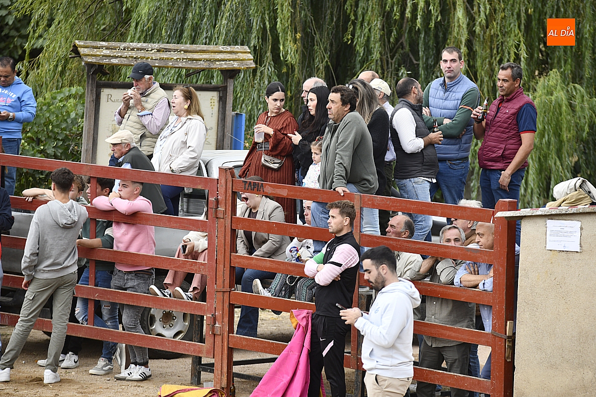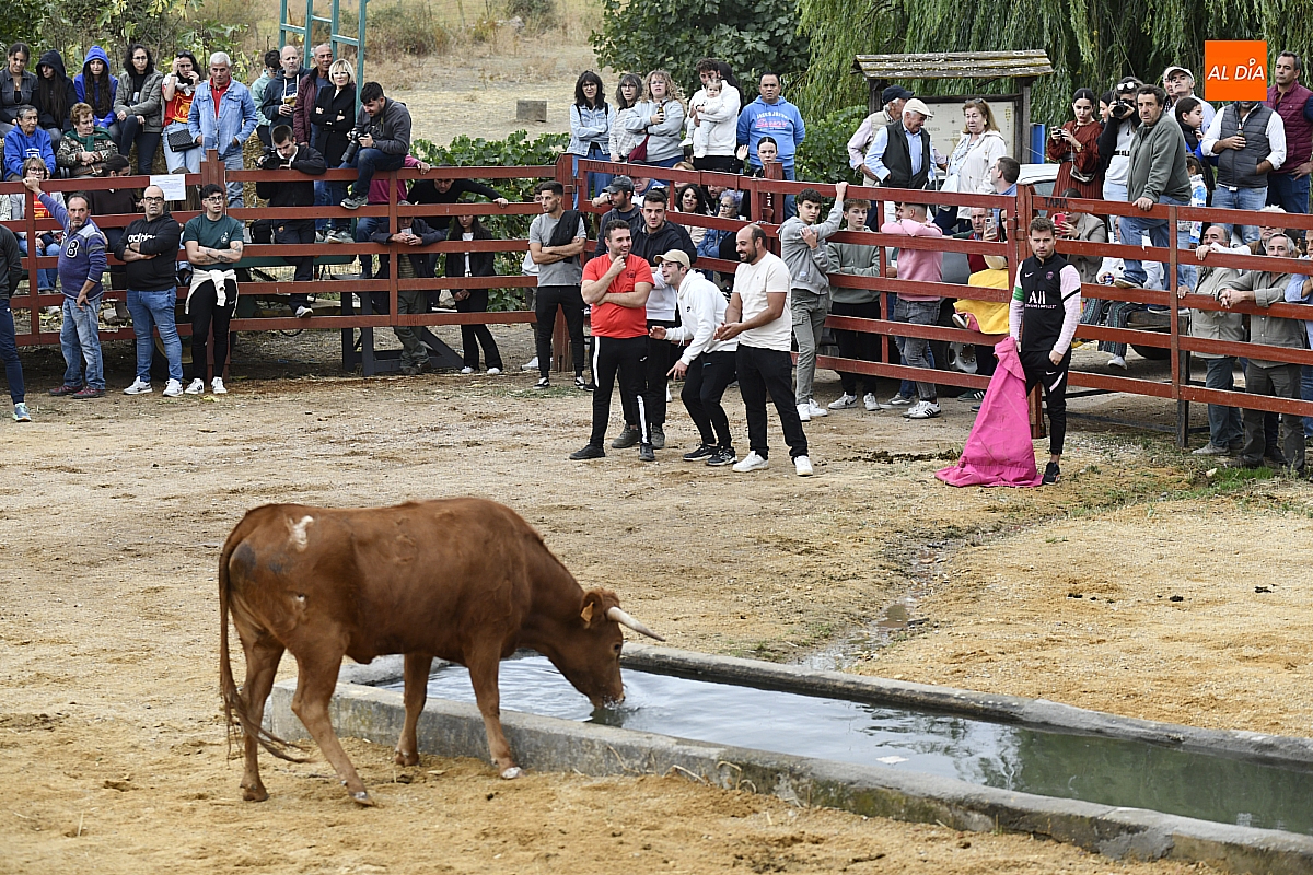 Por la tarde, llegó el turno de la capea con vaquillas, uno de los momentos más esperados. El cielo, caprichoso, descargó lluvia sobre la arena, obligando a los asistentes a refugiarse durante un instante. Pero el aguacero no pudo con el ánimo festivo: la música de la charanga “Manliao” y la hospitalidad de la carpa junto al bar convirtieron la tormenta en una pausa entrañable, más cercana al reencuentro que al desánimo. Entre risas, cánticos y el barro noble de la socampana mirobrigense, la fiesta recuperó su pulso.