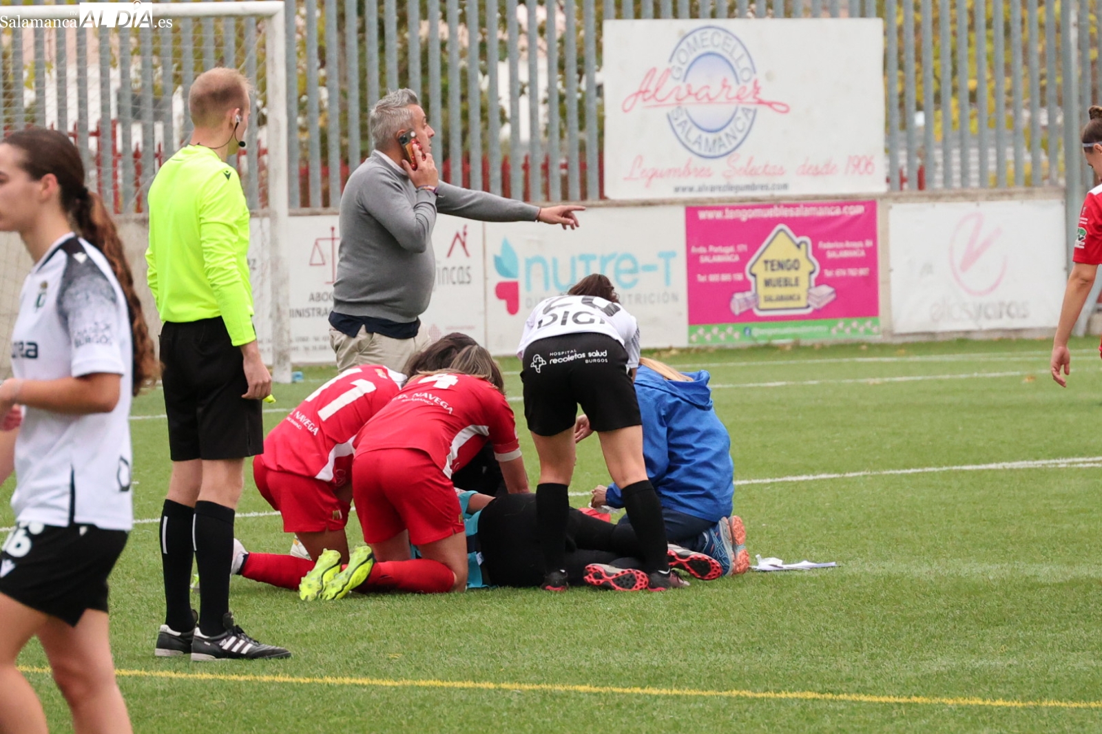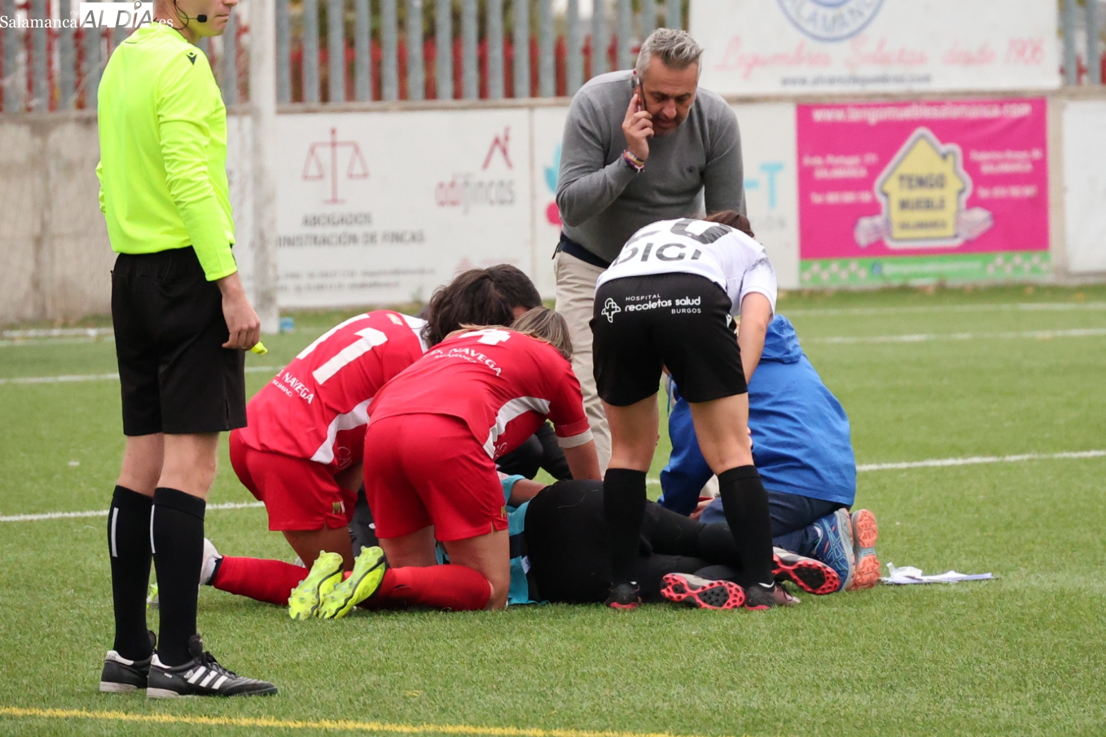 La portera del Navega femenino ha sido trasladada al Hospital en ambulancia por un duro golpe que ha obligado a parar el partido más de media hora por lo ocurrido. Asimismo, susto de los gordos el que se ha vivido en el encuentro disputado en el Vicente del Bosque con lo ocurrido con Andrea García, la dorsal 13.
