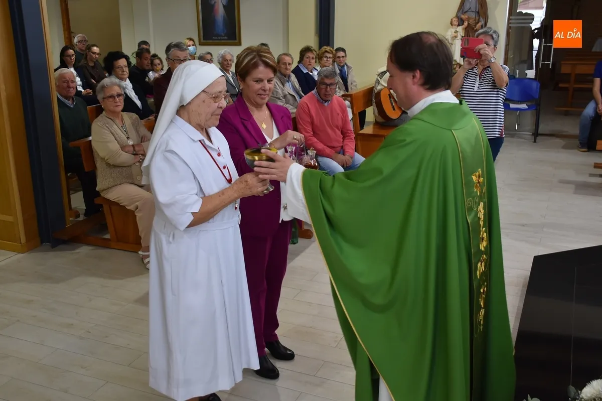 La comunidad parroquial de El Salvador de Ciudad Rodrigo fue testigo en su segunda misa dominical de la celebración de sus 60 años como misionera comboniana, y de la renovación de sus votos, de Teresa Herrero Sánchez, religiosa natural de Martiago que ha pasado buena parte de su vida en Ecuador, residiendo en la actualidad en Madrid junto a otras hermanas combonianas.