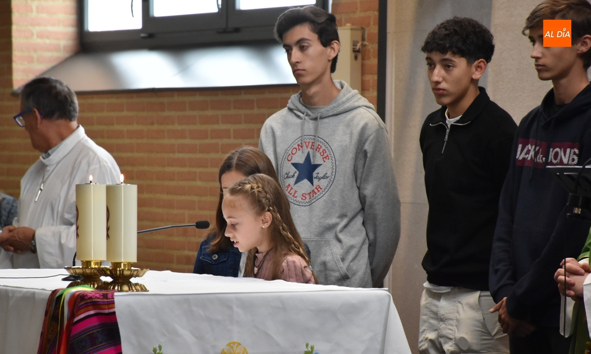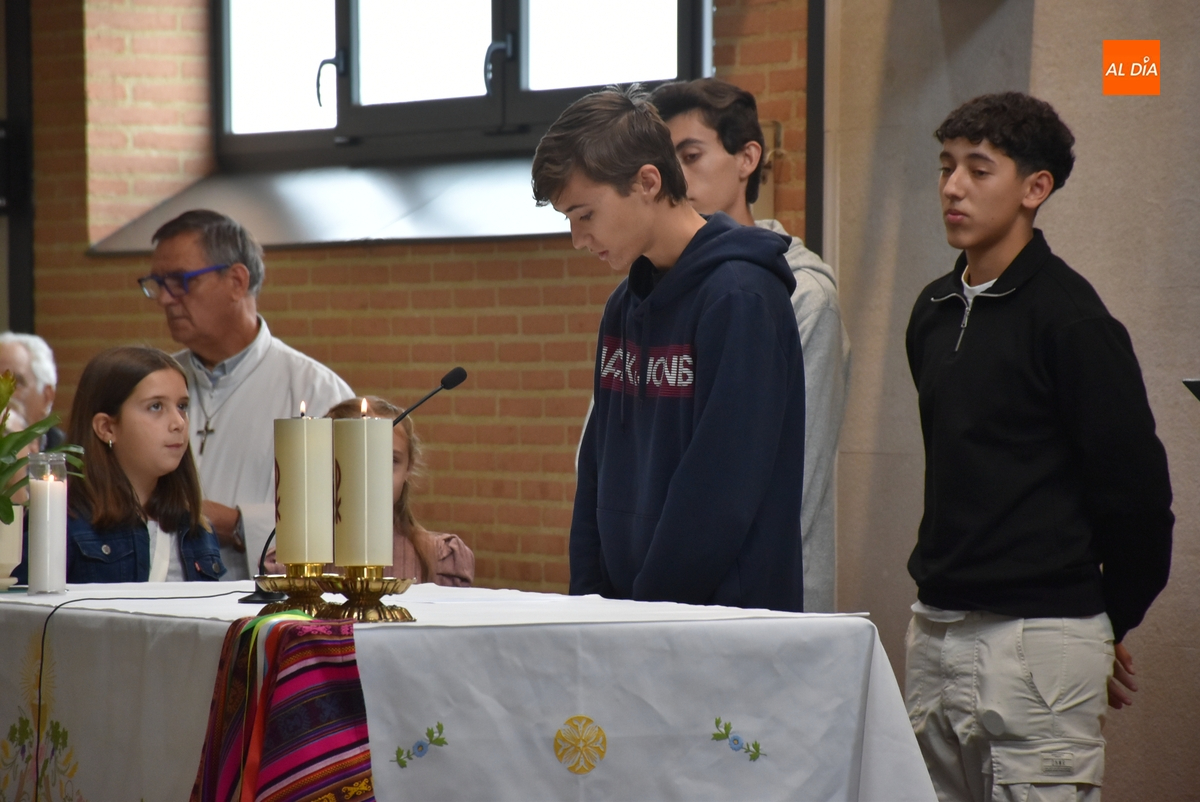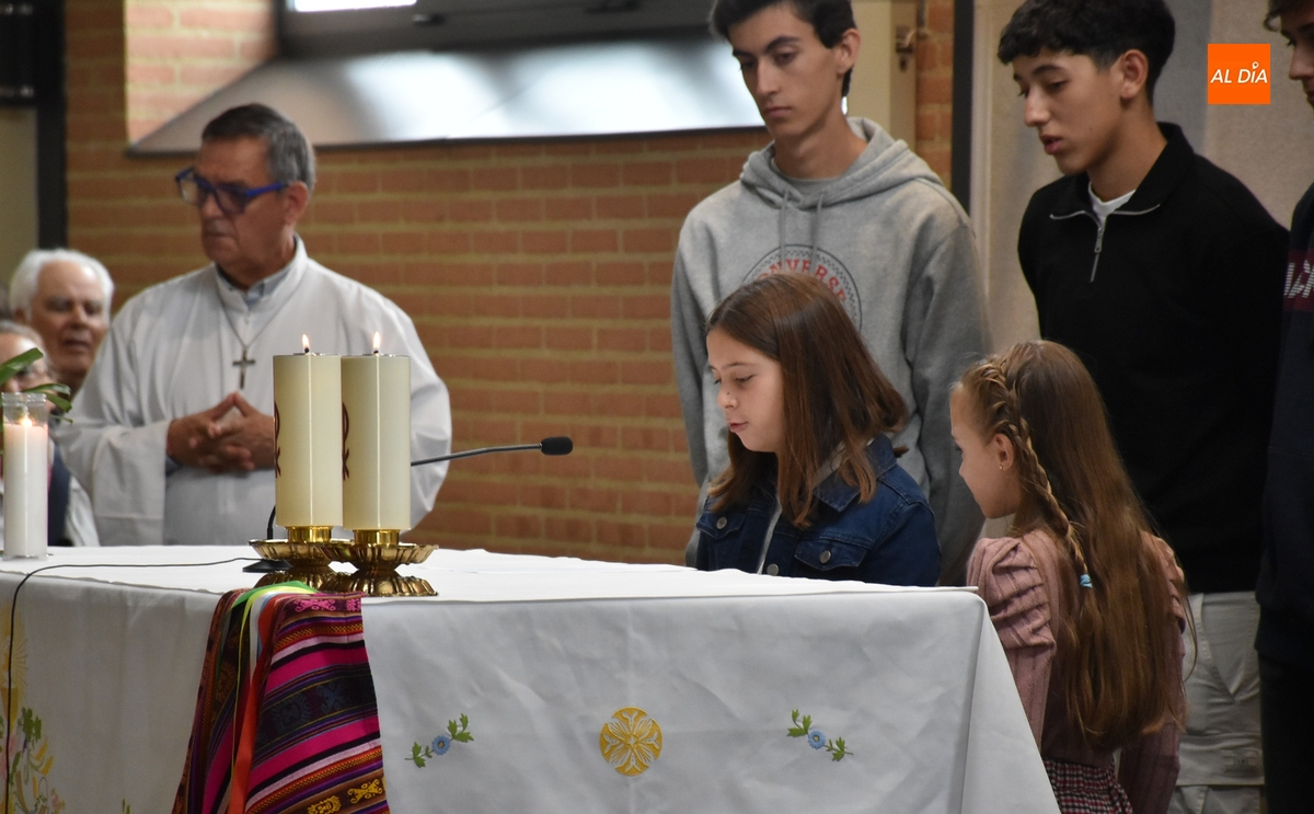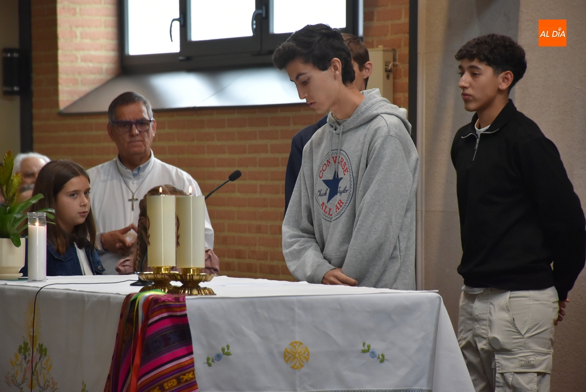 Tras el rezo del Credo, Teresa Herrero procedió a renovar desde el altar sus votos de castidad, pobreza y obediencia, antes de que varios jóvenes y niños diesen lectura a las peticiones. Como último componente especial de la misa en torno a los 60 años como comboniana de Teresa Herrero, en el momento de las ofrendas se presentó, además del pan y el vino, un planeta y un instrumento típico de Ecuador.