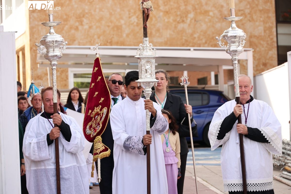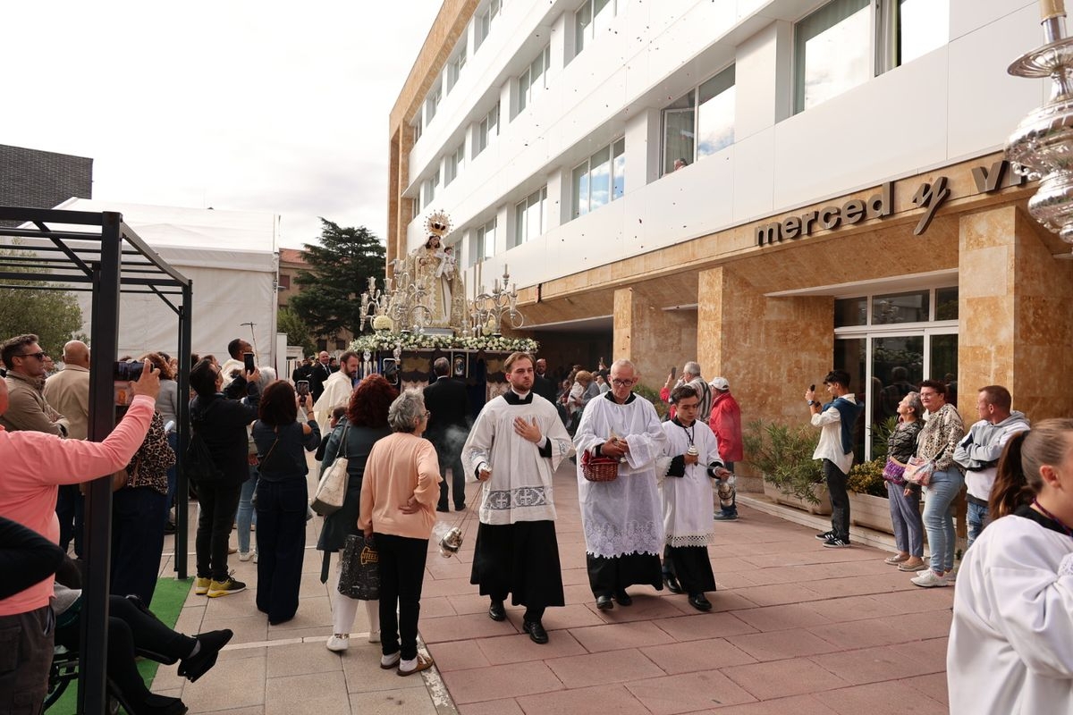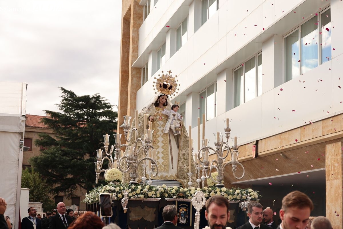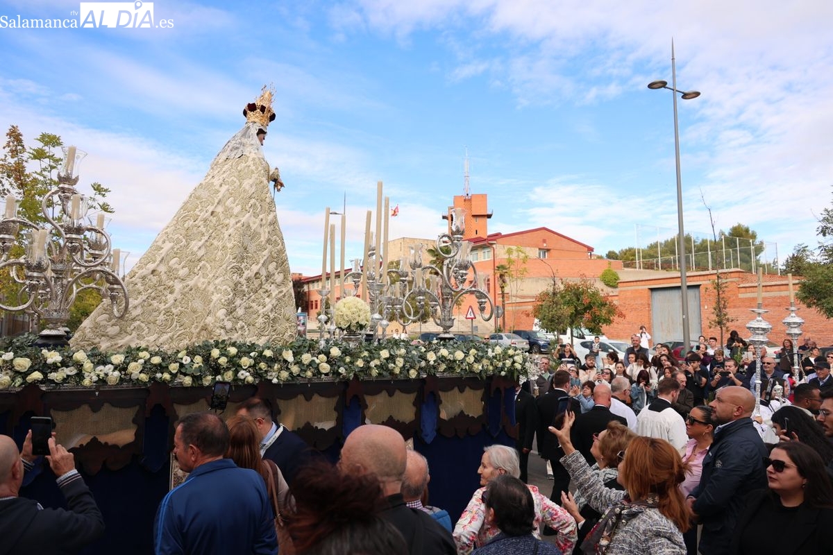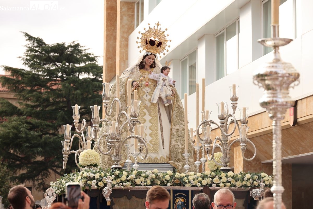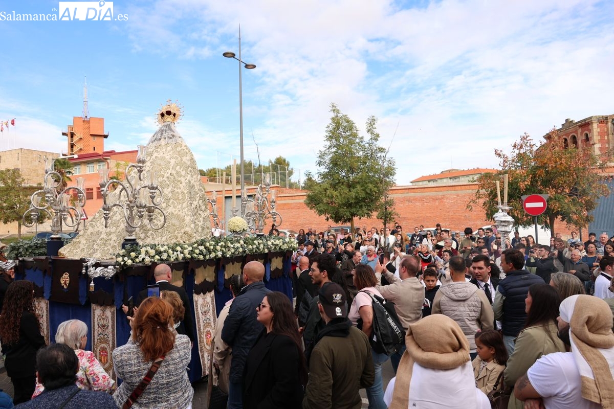 El recorrido ha llevado a la patrona de Salesas y Labradores por la avenida de la Merced, la glorieta de Santiago Martín ‘El Viti’ y el paseo del Doctor Torres Villarroel, para realizar una primera parada con un emotivo acto en la puerta principal del Acuartelamiento General Arroquia. La procesión ha continuado hacia la parroquia de María Mediadora, donde se ha rezado una oración en su entrada, para seguir por las calles Van Dyck, Salesas, Pizarro, Fernando de Rojas, Alonso de Ojeda, Arroyo de la Lastra, Norte, de nuevo Fernando de Rojas, Alfonso VI y la avenida de San Agustín hasta alcanzar la plaza de Toros de La Glorieta. Desde este punto, el cortejo ha emprendido el camino de regreso por la avenida de la Merced hasta su punto de partida en la residencia de Mayores Madre de la Veracruz.