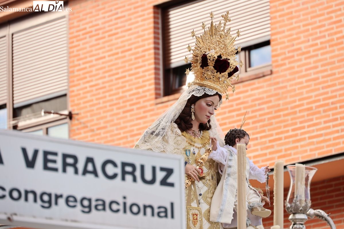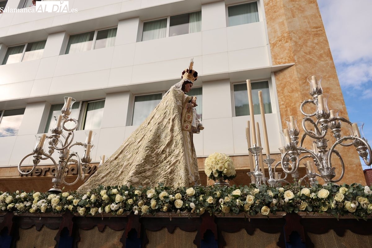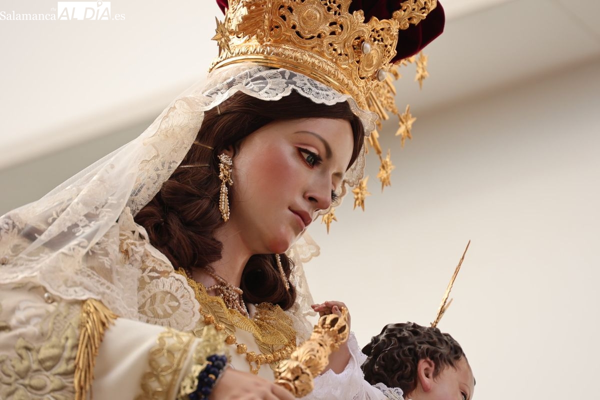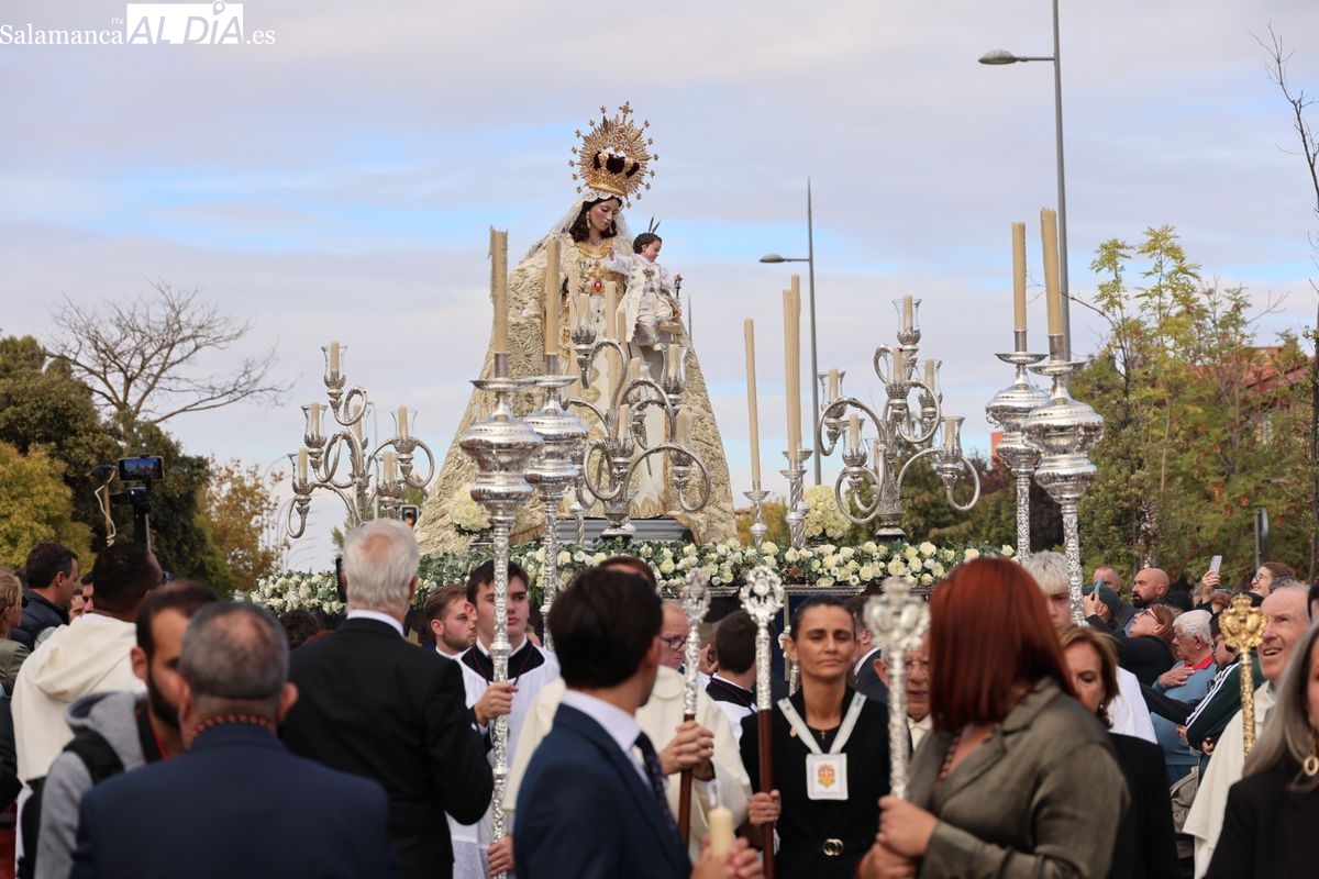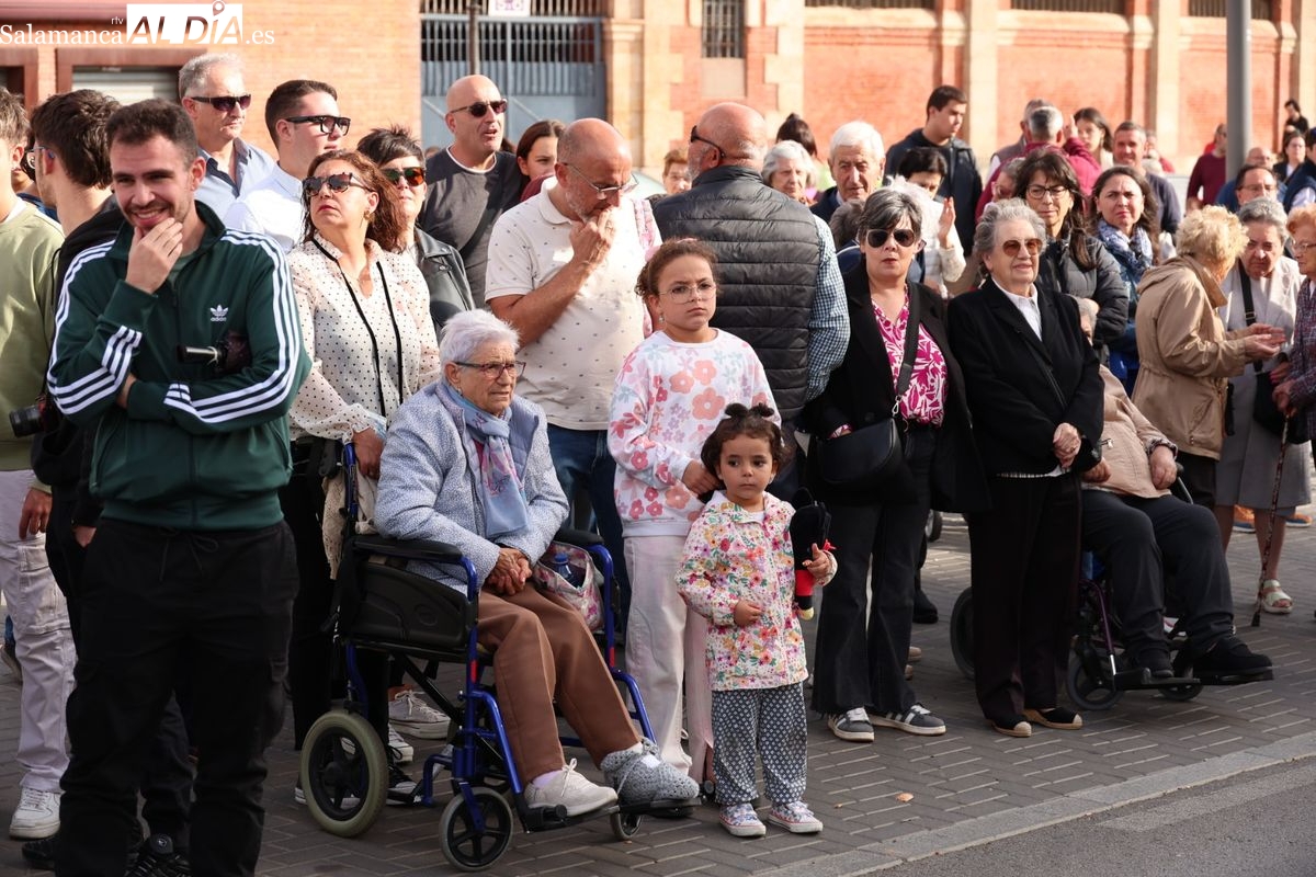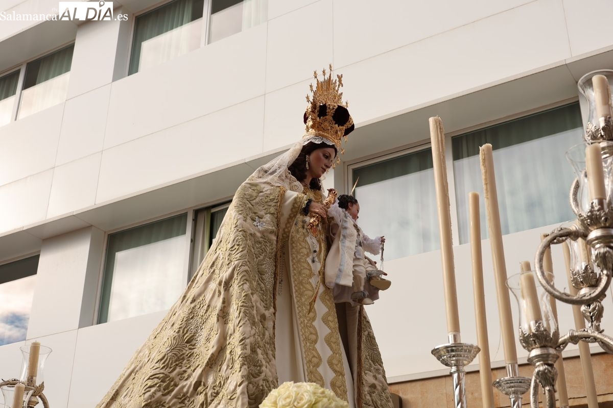El recorrido ha llevado a la patrona de Salesas y Labradores por la avenida de la Merced, la glorieta de Santiago Martín ‘El Viti’ y el paseo del Doctor Torres Villarroel, para realizar una primera parada con un emotivo acto en la puerta principal del Acuartelamiento General Arroquia. La procesión ha continuado hacia la parroquia de María Mediadora, donde se ha rezado una oración en su entrada, para seguir por las calles Van Dyck, Salesas, Pizarro, Fernando de Rojas, Alonso de Ojeda, Arroyo de la Lastra, Norte, de nuevo Fernando de Rojas, Alfonso VI y la avenida de San Agustín hasta alcanzar la plaza de Toros de La Glorieta. Desde este punto, el cortejo ha emprendido el camino de regreso por la avenida de la Merced hasta su punto de partida en la residencia de Mayores Madre de la Veracruz.