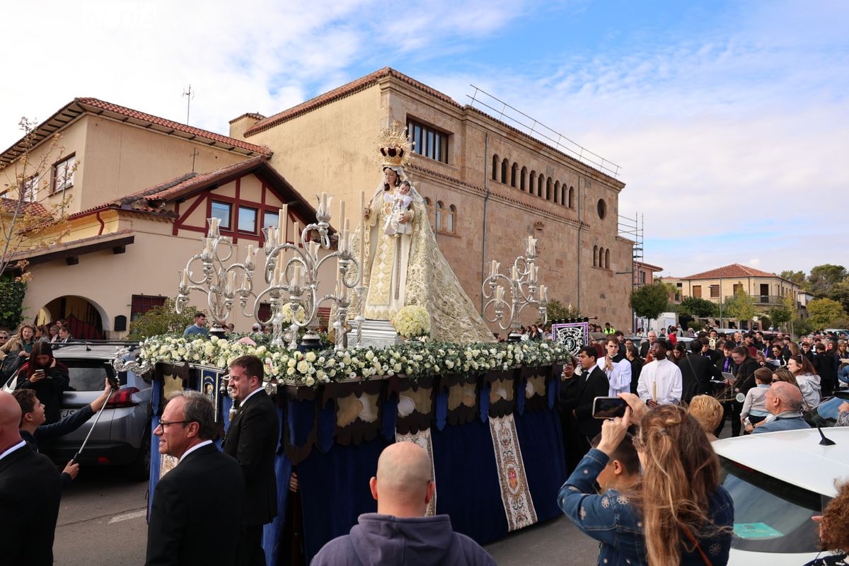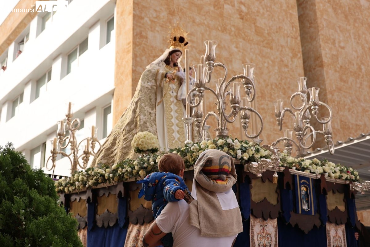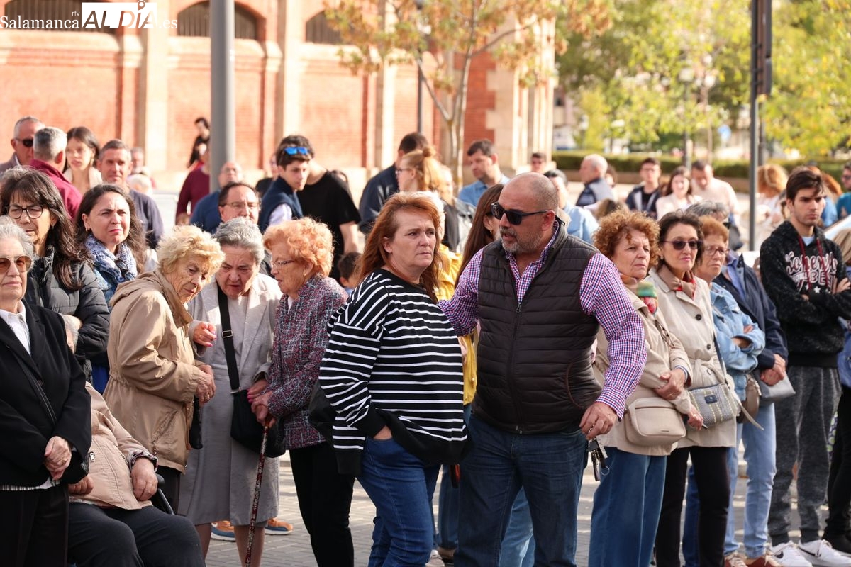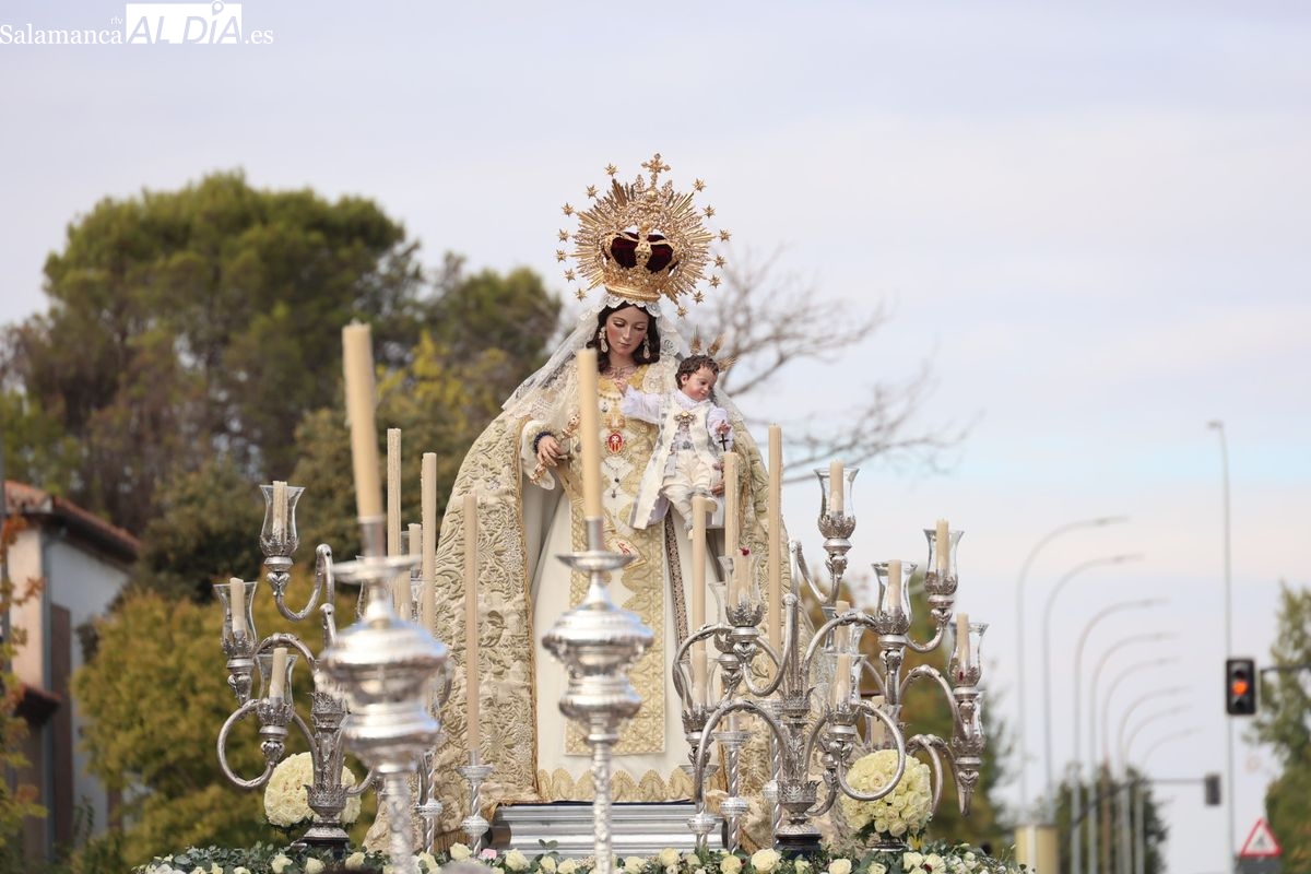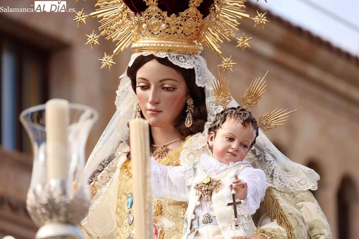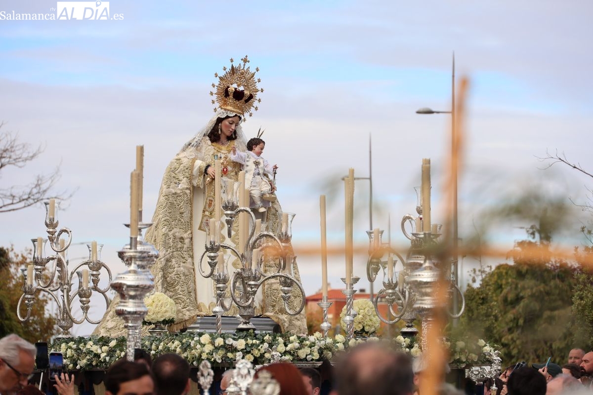 El recorrido ha llevado a la patrona de Salesas y Labradores por la avenida de la Merced, la glorieta de Santiago Martín ‘El Viti’ y el paseo del Doctor Torres Villarroel, para realizar una primera parada con un emotivo acto en la puerta principal del Acuartelamiento General Arroquia. La procesión ha continuado hacia la parroquia de María Mediadora, donde se ha rezado una oración en su entrada, para seguir por las calles Van Dyck, Salesas, Pizarro, Fernando de Rojas, Alonso de Ojeda, Arroyo de la Lastra, Norte, de nuevo Fernando de Rojas, Alfonso VI y la avenida de San Agustín hasta alcanzar la plaza de Toros de La Glorieta. Desde este punto, el cortejo ha emprendido el camino de regreso por la avenida de la Merced hasta su punto de partida en la residencia de Mayores Madre de la Veracruz.